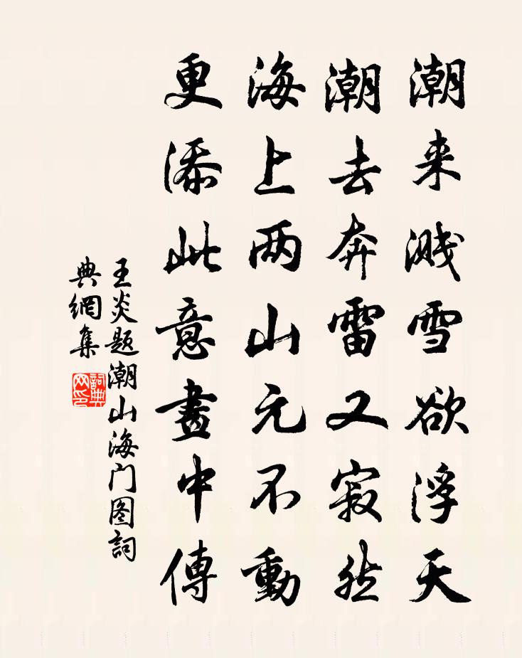 詩詞名句歷史字典書法欣賞書法字典國語詞典說文解字康熙字典古漢語字典標 題 作 者 詩 句 題潮山海門圖作者:王炎 朝代:宋代題潮山海門圖原文潮來濺雪欲浮天,潮去奔雷又寂然。海上兩山元不動,更添此意畫中傳。詩詞問答問:題潮山海門圖的作者是誰?答:王炎問:題潮山海門圖寫於哪個朝代?答:宋代王炎題潮山海門圖書法欣賞題潮山海門圖書法作品詩詞推薦題臥屏十八花薔薇葛立方〔宋代〕香風細細入東榮,嫩刺柔條疊絳英。飛下神霞緣底事,剪來曾傅董雙成。田家嘆趙汝鐩〔宋代〕破屋三間結草扉,柴根煨火闔家圍。此生能得幾年活,薄命連遭兩歲飢。腸久鳴雷惟淡粥,體雖起粟尚單衣。晚來臨江仙(鄭鹽生日)洪适〔宋代〕向日鵷行瞻鳳彩,共期直上金鑾。卻來持節海雲邊。身兼三使者,名是一仙官。漢室中興高密冠,千年苗裔蟬聯。江夏八詠之一右磨劍池賀鑄〔宋代〕孟公泣竹地,今是布金園。不保五畝宅,非無百代孫。【中呂】紅繡鞋_老夫人寬洪佚名〔元代〕老夫人寬洪海量,去筵席留下梅香,不付能今朝恰停當。款款的分開羅帳,慢慢的脫了衣裳,卻原來紙條兒封了褲再寄元真宮讀書強至〔宋代〕讀書曾寄此軒頭,官路歸來十二秋。文酒故人無一在,蓬蒿荒徑有餘愁。差池歲月辜金印,憔悴乾坤復布裘。卻掃歌者李蘇蘇祖無擇〔宋代〕歌妙累累若貫珠,歷城惟祗數蘇蘇。何當更唱陽春曲,為爾今宵倒玉壺。秋燕黃月湖〔宋代〕主人情熟已忘機,簾幙中間自在飛。昨夜西風涼信早,豈無歸夢到烏衣。送張曜之真德秀〔宋代〕譚天之外更譚兵,風角孤虛分外精。玉帳不妨收拾取,絕勝下客著雞鳴。野花廖行之〔宋代〕草木送春歸去後,山花種種自然開。略無醉倒遊人至,自有交情戲蝶來。日暖欲令紛錦繡,風和未遣委莓苔。清幽山中桃花鄭獬〔宋代〕春入關山亦未遲,薴蘿山下見西施。不羞白髮欺雙鬢,且對清尊插一枝。縱落不隨流水去,僅開惟有白雲知。何須桑維翰鐵研圖唐寅〔明代〕書生豪氣壓千軍,日出扶桑一卷文。鐵研未穿時世改,功名回首信浮雲。謝答聞善二兄九絕句黃庭堅〔宋代〕公擇醉面桃花紅,人百忤之無慍容。莘老夜闌傾數斗,焚香默坐日生東。和殷舍人蕭員外春雪徐鉉〔唐代〕萬里春陰乍履端,廣庭風起玉塵乾。梅花嶺上連天白,蕙草階前特地寒。晴去便為經歲別,興來何惜徹宵看。此時江州重別薛六柳八二員外劉長卿〔唐代〕生涯豈料承優詔?世事空知學醉歌。江上月明胡雁過,淮南木落楚山多。寄身且喜滄洲近,顧影無如白髮何!今日次韻許志仁王之道〔宋代〕我技類族庖,用刀常月更。君才妙天下,遊刃得我驚。前年獲相值,因憶吳中行。一別忽兩載,依然舊交情。新詩紹興祀皇地祗十五首佚名〔宋代〕於穆盛禮,肅肅在宮。幾事有初,直於東榮。條濯是謹,惟寅惟清。祗芳柔嘉,享茲我誠。和范景仁王景彝殿中雜題三十八首並次韻其四梅堯臣〔宋代〕花中第一品,天上見應難。近署多紅藥,層城有射干。生雖由地勢,開不許人看。天子何時賞,宮娥捧玉盤。寄鄭仁規司空圖〔唐代〕清才鄭小戎,標的貴游中。萬里雲無侶,三山鶴不籠。香和丹地暖,晚著彩衣風。榮路期經濟,唯應在至公。直中書省韋承慶〔唐代〕清切鳳皇池,扶疏雞樹枝。唯應集鸞鷺,何為宿羈雌。大造乾坤辟,深恩雨露垂。昆蚑皆含養,駑駘亦驅馳。木偶名句推薦萬里歸船弄長笛,此心吾與白鷗盟。黃庭堅《登快閣》 語來江色暮,獨自下寒煙。李白《尋雍尊師隱居》 願我如星君如月,夜夜流光相皎潔。范成大《車遙遙篇》 且趁閒身未老,盡放我、些子疏狂。蘇軾《滿庭芳·蝸角虛名》 一別都門三改火,天涯踏盡紅塵。蘇軾《臨江仙·送錢穆父》 不積跬步,無以致千里;不積小流,無以成江海。李昉、李穆、徐鉉《太平御覽·學部·卷一》 共慶新年笑語嘩,紅岩士女贈梅花。 * 《元旦口占用柳亞子懷人韻》 井灶有遺處,桑竹殘朽株。陶淵明《歸園田居·其四》 疾風知勁草,板蕩識誠臣。李世民《賜蕭瑀》 靡靡秋已夕,淒淒風露交。陶淵明《己酉歲九月九日》
