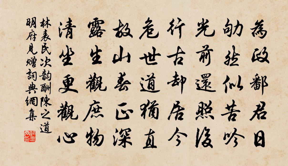 詩詞名句歷史字典書法欣賞書法字典國語詞典說文解字康熙字典古漢語字典標 題 作 者 詩 句 次韻酬陳之道明府見贈作者:林表民 朝代:宋代次韻酬陳之道明府見贈原文為政鄱君日,劬然似苦吟,光前還照後,行古卻居今。危世道猶直,故山春正深。露生觀庶物,清坐更觀心。詩詞問答問:次韻酬陳之道明府見贈的作者是誰?答:林表民問:次韻酬陳之道明府見贈寫於哪個朝代?答:宋代林表民次韻酬陳之道明府見贈書法欣賞次韻酬陳之道明府見贈書法作品詩詞推薦靈澈上人何山寺七賢石詩皎然〔唐代〕七石配七賢,隱僧山上移。石性殊磊落,君子又高奇。跂禪服宜壞,坐客冠可隳。夜倚月樹影,晝傾風竹枝。集質折楊柳魚玄機〔唐代〕朝朝送別泣花鈿,折盡春風楊柳煙。願得西山無樹木,免教人作淚懸懸。過西溪華岳〔宋代〕路隨馬足難知數,山疊魚鱗不記名。隔岸青簾人不渡,一溪流水暮潮生。修月匠歌楊維楨〔元代〕天公弄丸七寶曲,脆如琉璃拆如線。月中斤人八萬戶,敕賜仙廚瓊稍飯。什什伍伍入杳冥,妙手持天輕欲旋。千斤寄潁季蘇泂〔宋代〕人來得一書,分袂兩旬餘。未擉劉差鱉,誰羹宋嫂魚。時情分向背,同氣底親疏。想見迎長節,杯行會憶渠。十字水期韋潘侍御同年不至時韋寓居水次故郭汾寧宅李商隱〔唐代〕伊水濺濺相背流,朱欄畫閣幾人游。漆燈夜照真無數,蠟炬晨炊竟未休。顧我有懷同大夢,期君不至更沈憂。西園長相思(喜晴)劉辰翁〔宋代〕上元晴。上元晴。待得晴時坐觸屏。山禽三兩聲。欲歸城。未歸城。見說城中處處燈。明年處處行。再寄孫文洪皓〔宋代〕見危詎敢惜餘年,若欲作生義則騫。久困監車思仰首,如蒙贈策勝金鞭。次韻子由使契丹到涿州見寄四首蘇軾〔宋代〕氈毳年來亦甚都,時時鴃舌問三蘇。那知老病渾無用,欲向君王乞鏡湖。漁舟雪岩〔宋代〕莫笑扁舟數尺長,幾經煙雨浸瀟湘。紅船個個高於屋,未必荷花入夢香。白兔歐陽修〔宋代〕天冥冥,雲蒙蒙,白兔搗藥姮娥宮。玉關金鎖夜不閉,竄入滌山千萬重。滁泉清甘瀉大壑,滁草軟翠搖輕風。渴飲銅爵劉子翬〔宋代〕金碧銷磨瓦面星,亂山依舊繞宮城。路人休唱高台曲,台上而今春草生。白居易有望闕雲遮眼思鄉雨滴心之句用其韻為鄭剛中〔宋代〕天高不礙眼,矯首見堯雲。況復煙霧清,八荒靜無塵。垂空不可狀,變化何輪囷。遙知五色光,上下藏北辰。我今馬秀才草書歌(大理馬正之二)權德輿〔唐代〕伯英草聖稱絕倫,後來學者無其人。白眉年少未弱冠,落紙紛紛運纖腕。初聞之子十歲餘,當時時輩皆不如。猶輕次洪內相雙竹韻三首裘萬頃〔宋代〕管鮑交情真耐久,夷齊義氣更無雙。虛花滿眼風號怒,一節青青終不降。暮春遊柯市人家有作張耒〔宋代〕桃李雖雲過,林塘老景濃。幽花冠曉露,高柳旆和風。草木家家秀,溝壑處處通。況聞如雨足,高枕待年豐。留別寇定賀鑄〔宋代〕不見步兵今一秋,年來復與仲容游。蒼顏白髮慙衰暮,縱飲狂歌作輩流。顧我宦情真漫浪,為君行計幾淹留。能尋定風波(施樞密席上賦)辛棄疾〔宋代〕春到蓬壺特地晴。神仙隊里相公行。翠玉相挨呼小字。須記。笑簪花底是飛瓊。總是傾城來一處。誰妒。誰攜歌舞寄浙漕王子文野以思君令人老五字為韻得詩五五邁〔宋代〕長沙一傾蓋,情好如塤篪。間關十寒暑,何時不相思。君為睢邸教,再挹冰玉姿。升堂拜壽母,摩機識馨兒。敘舊為御史銜命出關讞獄,道中看華山有詩韓常侍〔唐代〕野麋蒙象暫如犀,心不驚鷗角駭雞。一路好山無伴看,斷腸煙景寄猿啼。名句推薦日夕涼風至,聞蟬但益悲。孟浩然《秦中感秋寄遠上人 / 秦中寄遠上人》 權者,人莫離也。來俊臣《羅織經·控權卷第四》 劃然長嘯,草木震動,山鳴谷應,風起水涌蘇軾《後赤壁賦》 當年曾勝賞,生香熏袖,活火分茶。李清照《轉調滿庭芳·芳草池塘》 夢繞神州路。張元乾《賀新郎·送胡邦衡待制赴新州》 少小離家老大回,鄉音無改鬢毛衰。賀知章《回鄉偶書二首·其一》 虛牖傳寒柝,孤燈照絕編。歐陽詹《除夜長安客舍》 正是浴蘭時節動。菖蒲酒美清尊共。歐陽修《漁家傲·五月榴花妖艷烘》 秋風起兮白雲飛,草木黃落兮雁南歸。劉徹《秋風辭》 新人雖言好,未若故人姝。佚名《上山采蘼蕪》