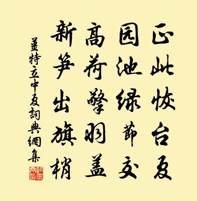 詩詞名句歷史字典書法欣賞書法字典國語詞典說文解字康熙字典古漢語字典標 題 作 者 詩 句 中夏作者:姜特立 朝代:宋代中夏原文正此恢台夏,園池綠節交。高荷擎羽蓋,新筍出旗梢。詩詞問答問:中夏的作者是誰?答:姜特立問:中夏寫於哪個朝代?答:宋代姜特立中夏書法欣賞中夏書法作品詩詞推薦銅雀台王建〔唐代〕嬌愛花更何日,花高台空數花層。含啼映雙袖,不忍看西陵。漳水東流無復來,百花輦路為蒼苔。青樓月夜長寂寞次韻楊明叔四首黃庭堅〔宋代〕全德備萬物,大方無四隅。身隨腐草化,名與太山俱。道學歸吾子,言詩起老夫。無為蹈東海,留作濟川桴。偈頌一百五十首釋心月〔宋代〕簇簇上來,卻之不回。簇簇下去,留之不住。於斯立片時,瞬目不揚眉。宮詞張公庠〔宋代〕御苑名花約萬栽,芳心俱願日華來。春風已暖梅先綻,長恨江南冒雪開。再用前韻贈高縉之三首陳造〔宋代〕高郎客京華,好事有左顧。儒林丈人行,乃得曳裾處。亦知短褐底,蘊抱美無度。繼今數公間,可但傳新句。浣溪沙吳潛〔宋代〕慶賞元宵只願情。天公每事秤能平。管教檐溜便收聲。三市海巡那惜夜,九街社火亦爭名。權將歌酒作工程。山中載酒用蕭敬夫韻賦江漲文天祥〔宋代〕拍拍春風滿面浮,出門一笑大江流。坐中狂客有醉白,物外閒人惟弈秋。晴抹雨妝總西子,日開雲暝一滁州。忽傳惜別李鹹用〔唐代〕細雨妝行色,霏霏入戶來。須知相識喜,卻是別愁媒。 * 方盈國,黃金不上台。俱為鄒魯士,何處免塵埃。送劉儀先輩大名尉司馬光〔宋代〕潭潭相府開,旌騎擁三台。聞道廷中吏,無非天下才。策名新振拔,把板尚低回。勿為卑飛困,青冥盡此來。春日雜書八首張耒〔宋代〕出門逢一士,韋布污塵土。延之升賓階,再拜色低沮。問來何所欲,涕下說貧窶。其求升斗爾,我亦不能具。我窮次趙帥喜雪韻陳造〔宋代〕府公憂國雪神知,三白呈祥不待祈。舊歲新年多樂事,一時分付筆如飛。禪人並化主寫真求贊釋正覺〔宋代〕如珪如璧,雕文喪德。如雲如石,堅潤是式。蒼竹無心歲寒色,老松有傲霜雪力。照破諸緣兮,兩眼如漆。秋懷三十六首邵雍〔宋代〕池荷日取敗,籬菊日就榮。其於品彙間,自與節氣爭。盛衰不同時,賢愚難並行。安得松桂心,四時長青青。重歸江南許棠〔唐代〕無成歸故里,不似在他鄉。歲月逐流水,山川空夕陽。回潮迷古渡,迸竹過鄰牆。耆舊休存省,胡為止淚行。春雨陸游〔宋代〕湖上新春柳,搖搖欲喚人。多情今夜雨,先洗馬蹄塵。湖州里諺佚名〔唐代〕放爾生,放爾命,放爾湖州做百姓。頌古十六首釋道寧〔宋代〕工巧諸伎藝,頭頭迸出真祥瑞。瞥然端坐到家鄉,堪笑維摩談不二。興平縣野中得落星石移置縣齋韓琮〔唐代〕的的墮芊蒼,茫茫不記年。幾逢疑虎將,應逐犯牛仙。擇地依蘭畹,題詩間錦錢。何時成五色,卻上女媧天。廉泉黃大受〔宋代〕一泓落古寺,三赤開方池。懷山決瀆後,爍石流金時。君看此廉泉,不增亦不虧。炯炯玉色透,燦燦金沙輝。朅來五鼓孔武仲〔宋代〕夜枕回遠夢,北窗覺微明。遙知扶桑曲,萬頃搖光晶。江海已瀺灂,魚龍俱震驚。大哉陽德敏,頃刻周四溟。天星名句推薦將在外,君命有所不受畢沅《續資治通鑑·元紀·元紀三十》 日星隱曜,山嶽潛形;范仲淹《岳陽樓記》 興盡晚回舟,誤入藕花深處。李清照《如夢令·常記溪亭日暮》 半死梧桐老病身,重泉一念一傷神。白居易《為薛台悼亡》 人情反覆,世路崎嶇。洪應明《菜根譚·概論》 怪人不知理,知理不怪人。佚名《增廣賢文·下集》 十分不耐煩,乃為人大病王永彬《圍爐夜話·第五四則》 庭前雪壓松桂叢,廊下點點懸紗籠。劉禹錫《更衣曲》 城上高樓接大荒,海天愁思正茫茫。柳宗元《登柳州城樓寄漳汀封連四州》 悵恨不逢如意酒。尋思難值有情人。晏幾道《浣溪沙·閒弄箏弦懶系裙》
