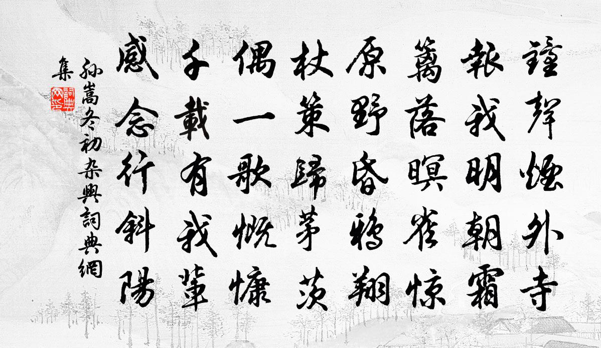 詩詞名句歷史字典書法欣賞書法字典國語詞典說文解字康熙字典古漢語字典標 題 作 者 詩 句 冬初雜興作者:孫嵩 朝代:宋代冬初雜興原文鐘聲煙外寺,報我明朝霜。籬落暝雀驚,原野昏鴉翔。杖策歸茅茨,偶一歌慨慷。千載有我輩,感念行斜陽。詩詞問答問:冬初雜興的作者是誰?答:孫嵩問:冬初雜興寫於哪個朝代?答:宋代孫嵩冬初雜興書法欣賞冬初雜興書法作品詩詞推薦送荀道士歸廬山李端〔唐代〕先生歸有處,欲別笑無言。綠水到山口,青林連洞門。月明尋石路,雲霽望花源。早晚還乘鶴,悲歌向故園。與吳興薛士隆使君游弁山石林先生故居范成大〔宋代〕白苹有嘉招,蒼弁得勝踐。會心不憚遠,乘興恐失便。籃輿犯窮臘,共作忍寒面。溟濛雲釀雪,浩蕩風落雁。松篁水龍吟(席間諸公有賦,再和)李曾伯〔宋代〕琅琅環佩三千,一樓玉立中端委。瑤琚碾就,襄王故國,屈平遺里。多少鉛華,飛瓊塗抹,一時挼碎。記少年馳逐旱後喜雨四首楊萬里〔宋代〕竟夏興雲只苦風,入秋今雨稍宜農。怪來霹靂車枯樹,知向前山起臥龍。禮明招謙禪師塔釋智遇〔宋代〕藤深蔓短塔累累,以眼名龍恐是伊。放下泥盤叉手笑,阿師曾誤矮者梨。胡逸老吳生畫屏贊黃庭堅〔宋代〕兩虎戲搏文章露,千林號風雷欲雨。慎勿私鬥傷爪距,豺狼野子即當路。孟子觳{觳右換束}牛陳普〔宋代〕堂上言何自發,分明太極本真存。因知忍性元皆善,利慾遮迷只自昏。寒食夜有懷白居易〔唐代〕寒食非長非短夜,春風不熱不寒天。可憐時節堪相憶,何況無燈各早眠。沁園春 丙午登多景樓和吳履齋韻李曾伯〔宋代〕天下奇觀,江浮兩山,地雄一州。對晴煙抹翠,怒濤翻雪,離離塞草,拍拍風舟。春去春來,潮生潮落,幾度斜陽秋懷吟邵雍〔宋代〕一番春了未多時,雲外征鴻又報歸。節物眼前來若此,歲華頭上去如斯。當年志意雖然在,今日筋骸寧不衰。賴有偈頌二十四首釋智遇〔宋代〕時遷物換,革故鼎新。土膏未動,商量打春。太公有意垂釣,夫子無心獲麟。次韻伯壽兄宿華藏有感喻良能〔宋代〕水淨溪空峰更青,目雖未到已先明。棟浮萬縷晴雲細,軒擁千重夏木清。幽興入門應自適,殘樽下馬與誰傾。老僧點絳唇吳潛〔宋代〕禁鼓三敲,參旗初掛闌乾角。淺屏疏箔。夜氣侵已薄。欸乃吳歌,艇子當溪泊。休休莫。五湖煙浪,不是鴟夷錯。代書寄宋州錢大監徐鉉〔唐代〕衰配經煩暑,慵將病共侵。北窗時企足,東望一披襟。秘監清罇滿,平台綠樹深。年來書信少,保以慰離心。慶東宮生辰四首周必大〔宋代〕季秋日在房,房心乃明堂。煌煌心前星,於茲侍天王。休符協上象,九月誕元良。太史言有證,重暉照無疆。擬玉台體七首欲眠歐陽修〔宋代〕行人夜已斷,明河南陌頭。雙璫不擬解,更欲要君留。到惡溪夜泊蘆島李德裕〔唐代〕甘露花香不再持,遠公應怪負前期。青蠅豈獨悲虞氏,黃犬應聞笑李斯。風雨瘴昏蠻日月,煙波魂斷惡溪時。嶺頭荔枝詩薛能〔唐代〕顆如松子色如櫻,未識蹉跎欲半生。歲杪監州曾見樹,時新入座久聞名。太師杜相公篇章真草過人遠甚而特獎後進流於梅堯臣〔宋代〕杜詩嘗說少陵豪,祖德兼夸翰墨高。蘇李為奴令侍席,鍾王北面使持毫。郊麟作瑞唯逢趾,天馬能行不辨毛。一誦謁金門·風乍起馮延巳〔唐代〕風乍起,吹皺一池春水。閒引鴛鴦芳徑里,手挪紅杏蕊。鬥鴨闌乾獨倚,碧玉搔頭斜墜。終日望君君不至,舉頭聞名句推薦雨後輕寒猶未放。春愁酒病成惆悵。歐陽修《蝶戀花·面旋落花風蕩漾》 十月江南天氣好,可憐冬景似春華。白居易《早冬》 試問嶺南應不好,卻道:此心安處是吾鄉。蘇軾《少年游·南海歸贈王定國侍人寓娘》 孟夏草木長,繞屋樹扶疏。陶淵明《讀山海經·其一》 憐君片雲思,一棹去瀟湘。杜牧《送薛種游湖南》 將贍才力,務在博見劉勰《文心雕龍·事類》 山隨平野盡,江入大荒流。李白《渡荊門送別》 雁濕行無次,花沾色更鮮。李世民《詠雨》 相思相見知何日?此時此夜難為情!李白《三五七言 / 秋風詞》 不聞不若聞之,聞之不若見之,見之不若知之,知之不若行之。荀子《荀子·儒效》