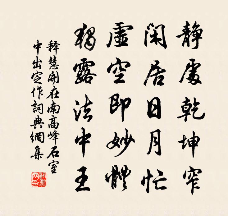 詩詞名句歷史字典書法欣賞書法字典國語詞典說文解字康熙字典古漢語字典標 題 作 者 詩 句 在南高峰石室中出定作作者:釋慧開 朝代:宋代在南高峰石室中出定作原文靜處乾坤窄,閒居日月忙。虛空即妙體,獨露法中王。詩詞問答問:在南高峰石室中出定作的作者是誰?答:釋慧開問:在南高峰石室中出定作寫於哪個朝代?答:宋代釋慧開在南高峰石室中出定作書法欣賞在南高峰石室中出定作書法作品詩詞推薦荔枝二首程師孟〔宋代〕重門畫戟公堂峻,萬瓦清煙使宅雄。草服勸耕菖葉綠,羅裙送酒荔枝紅。夏日奉使南海在道中作張九齡〔唐代〕緬然萬里路,赫曦三伏時。飛走逃深林,流爍恐生疵。行李豈無苦,而我方自怡。肅事誠在公,拜慶遂及私。展力城上晚思陳與義〔宋代〕獨憑危堞望蒼梧,落日君山如畫圖。無數柳花飛滿岸,晚風吹過洞庭湖。洛浦善先長老贈詩自方無本惠勤答詩二首劉克莊〔宋代〕入佛名無本,歸儒字浪仙。韓公雖稍黠,不曉句參禪。姑蘇台程公許〔宋代〕館娃陳跡久蓬蒿,留得蘇台數仞高。隔山水雲青斷絕,繞城溝盪天周遭。遙憐讓國清風遠,忍見連艘戰血鏖。滿目寄荔枝與盛參政田從易〔宋代〕櫻桃真小子,龍眼是凡姿。橄欖為下輩,枇杷作客兒。雜劇·月明和尚度柳翠李壽卿〔元代〕楔子(老旦扮觀音領小末扮善才上,詩云)寶座巍巍法力強,慈悲極樂住西方。慧眼才開能救苦,眉間放出白毫光送張巨川歸崇德仇遠〔宋代〕三載金淵入幙賓,轉當繁劇轉精神。高堂多有承顏樂,巨室都無切齒人。此日吏民爭臥轍,他時事業繼埋輪。語兒清明二絕·其二陳與義〔宋代〕捲地風拋市井聲,病夫危坐了清明。一簾晚日看收盡,楊柳微風百媚生。臘日龍沙會絕句權德輿〔唐代〕簾外寒江千里色,林中樽酒七人期。寧知臘日龍沙會,卻勝重陽落帽時。以採菊東籬下悠然見南山為韻賦十首方回〔宋代〕不謂予坦率,即謂予繆悠。冷官尚難為,熱官何可求。寂寂雀羅門,無復車前騶。但恐嚴光足,終勝張禹頭。客來和朱世同韻吳芾〔宋代〕道義誰人似乃翁,有兒如子豈憂窮。自應便享千鍾養,不謂今猶四壁空。好遣江山歸筆下,莫將荊棘置胸中。詩書賢牧堂王邁〔宋代〕賢牧存遺愛,邦人重此祠。典刑前輩幾,德政後來誰。來日清泉濯,歸時只鶴隨。不須看石碣,人口是豐碑。偈頌一百一十七首釋紹曇〔宋代〕航海而來,而壁而坐。未明直指單傳,先被梁王勘破。當門齒露風,只履歸何早。熊耳峰前,累累荒草,至今惹得奉和御製讀隋書夏竦〔宋代〕子蓋懷英斷,南荒久駐留。清通承眷獎,恭須望巡遊。異寵榮鄉黨,丹誠破寇讎。邊民思舊愛,刻石在西州。嘉泰昭陽大淵獻築室董孝君祠之西下有湖焉某楊簡〔宋代〕惜也天然一段奇,如何萬古罕人知。只今煙水平軒檻,觸目無非是孝慈。挽辛憲若五首徐元傑〔宋代〕十載居間學,瓢泉映潔清。陶潛 * 趣,杜老白鷗盟。雲自無心出,春隨有腳行。知非古巴蜀,使指若為情。滄洲白鷺軒五首汪炎昶〔宋代〕荷葉蒲寒煙漠漠,牙花洲晚雨疏疏。雖然亦有魚暇志,難把虛鶿比羔渠。再游南華臨出門書記妙瑩獻絕句索留題賦兩篇曾豐〔宋代〕詩數江西派,禪歸嶺表宗。他寧無出手,終莫敢當鋒。欠子廣長舌,資吾磊塊胸。打包隨牒跡,豈料適相逢。偶題晁說之〔宋代〕一室蕭然懶傍書,角巾孤嘯問何如。夕陽能使山遠近,秋色巧隨人慘舒。苔漬碧花行不到,香殘篆字睡應余。自憐名句推薦欹枕數秋天,蟾蜍下早弦。納蘭性德《菩薩蠻·蕭蕭幾葉風兼雨》 京國多年情盡改,忽聽春雨憶江南。虞集《聽雨》 一朝權在手,便把令來行。佚名《增廣賢文·下集》 沅水通波接武岡,送君不覺有離傷。王昌齡《送柴侍御》 昨夜西風凋碧樹,獨上高樓,望盡天涯路。晏殊《蝶戀花·檻菊愁煙蘭泣露》 相思相見知何日?此時此夜難為情!李白《三五七言 / 秋風詞》 休說鱸魚堪膾,盡西風,季鷹歸未?辛棄疾《水龍吟·登建康賞心亭》 深居俯夾城,春去夏猶清。李商隱《晚晴》 小桃枝下試羅裳,蝶粉斗遺香。陳子龍《訴衷情·春遊》 留連光景惜朱顏,黃昏獨倚闌。李煜《阮郎歸·呈鄭王十二弟》