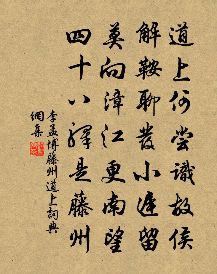 詩詞名句歷史字典書法欣賞書法字典國語詞典說文解字康熙字典古漢語字典標 題 作 者 詩 句 藤州道上作者:李孟博 朝代:宋代藤州道上原文道上何嘗識故侯,解鞍聊發小遲留。莫向漳江更南望,四十八驛是藤州。詩詞問答問:藤州道上的作者是誰?答:李孟博問:藤州道上寫於哪個朝代?答:宋代李孟博藤州道上書法欣賞藤州道上書法作品詩詞推薦追和晦庵先生十梅韻艾性夫〔宋代〕一陽未噓枯,霜木醉夢裡。照眼忽橫枝,令我折屐喜。挽史館資政木石尢公三首劉克莊〔宋代〕歷代名書畫,中原古鼎彝。不教蕭翼看,常怕米顛知。此物空盈笈,何人與掌匙。貴無它嗜好,焉用太清為。念奴嬌(詠牡丹)陳著〔宋代〕洛陽地脈,是誰人、縮到海涯天角。綠樹成陰芳霧底,得見當年台閣。園杏貴客,海棠姬侍,擁入青油幕。人間那浣溪沙 三台送客,作離合體元好問〔金代〕錦帶吳鉤萬里行。青雲人物舊知名。百壺春酒過清明。渺渺荒陂冰井路,青青楊柳玉關情。斜陽無語下西陵。墨君十詠雪梢王銍〔宋代〕第五橋邊一徑遙,滿林野竹立江郊。鴛鴦浮破水涵影,翡翠壓斜風舞梢。送王昌齡之嶺南孟浩然〔唐代〕洞庭去遠近,楓葉早驚秋。峴首羊公愛,長沙賈誼愁。土毛無縞紵,鄉味有槎頭。已抱沈痼疾,更貽魑魅憂。數年暑不雜興方岳〔宋代〕是非不到野溪邊,只就梧桐聽雨眠。睡熟不知溪水長,鷺鷥飛上釣魚船。贈太子太傅王尚書輓詞二首梅堯臣〔宋代〕周原開隴隧,鹵部葬名臣。北極履聲絕,東朝車跡湮。藏舟移夜壑,棲鵩去承塵。共看劉寬墓,碑陰幾許人。長信宮中樹喬知之〔唐代〕婀娜當軒樹,莑茸倚蘭殿。葉艷九春華,香搖五明扇。餘花鳥弄盡,新葉蟲書遍。零落心自知,芳菲君不見。著書蘇籀〔宋代〕著書前古老虞卿,何必窮愁學乃成。駕說精心是家訓,修辭肆筆體人情。少年竦躍文章慕,老去沖融道術鳴。流略子石硯崔鶠〔宋代〕石家有兒玉含晶,噓為雲氣吸為晴。純精與之相感並,孕育萬狀流千名。黃昏鬼器不忍聽,且為白鵝了黃庭。蝶戀花(惜春)張震〔宋代〕梅子初青春已暮。芳草連雲,綠遍西池路。小院繡垂簾半舉。銜泥紫燕雙飛去。人在赤闌橋畔住。不解傷春,還解桃源行(鳳棲梧三首)賀鑄〔宋代〕流水長煙何縹緲。詰□□□,□逗漁舟小。夾岸桃花爛□□。□□□□□□□。蕭閒村落田疇好。避地移家,□□園果王建〔唐代〕雨中梨果病,每樹無數個。小兒出入看,一半鳥啄破。句張表臣〔宋代〕床弩天誅韓闥覽,劍鋒神助宋將軍。十一夜無寐懷九日南山之游方回〔宋代〕代步僅一馬,奄忽乏敝帷。扶輿陟南山,幸有淵明兒。樹陰玩苔蘚,稍讀古板碑。江湖豈無人,不如僧能詩。穩坐送劉蘇州誠之帥夔門孫應時〔宋代〕了了八陣磧,巍巍三峽堂。竹枝歌感慨,曲米醉淋浪。今古英雄思,風流翰墨場。公行秋水落,穩穩上瞿唐。送左元規三詣太常楊萬里〔宋代〕晉侯三駕楚莫爭,薛侯三箭天山平。江西今代再丘明,親到杏壇授麟經。筆陣獨掃萬人軍,兩魁槐花再薦名。來年漫成二絕宋庠〔宋代〕代故由來足糾紛,高才憂世強云云。太宗不用長沙傳,虛使群臣諡孝文。贈杜介蘇軾〔宋代〕我夢遊天台,橫空石橋小。松風吹菵露,翠濕香嫋嫋。應真飛錫過,絕磵度雲鳥。舉意欲從之,翛然已松杪。微言名句推薦欲持一瓢酒,遠慰風雨夕。韋應物《寄全椒山中道士》 驟雨過,珍珠亂撒,打遍新荷。元好問《驟雨打新荷》 憶君遙在瀟湘月,愁聽清猿夢裡長。王昌齡《送魏二》 斜月照簾帷,憶君和夢稀。毛熙震《菩薩蠻·梨花滿院飄香雪》 寧可信其有,不可信其無。佚名《增廣賢文·上集》 問汝平生功業,黃州惠州儋州。蘇軾《自題金山畫像》 孝有三:大孝尊親,其次弗辱,其下能養。戴聖《禮記·祭義》 薄衾小枕涼天氣,乍覺別離滋味。柳永《憶帝京·薄衾小枕涼天氣》 自憐十五餘,顏色桃李紅。李白《長干行二首》 勝敗兵家事不期,包羞忍恥是男兒。杜牧《題烏江亭》