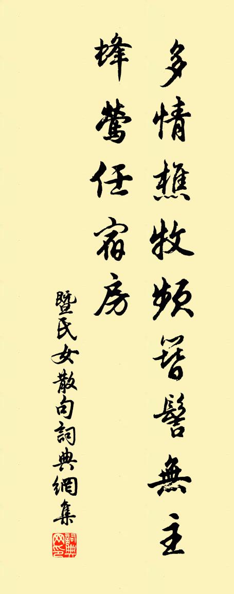 詩詞名句歷史字典書法欣賞書法字典國語詞典說文解字康熙字典古漢語字典標 題 作 者 詩 句 句作者:暨氏女 朝代:宋代句原文多情樵牧頻簪髻,無主蜂鶯任宿房。詩詞問答問:句的作者是誰?答:暨氏女問:句寫於哪個朝代?答:宋代暨氏女句書法欣賞句書法作品詩詞推薦落花圖詠唐寅〔明代〕能賦相如已倦遊,傷春杜甫不禁愁。頭扶殘醉方中酒,面對飛花怕倚樓。萬片風飄難割捨,五更人起可能留。妍媸贈高德順楊萬里〔宋代〕兒時同客水中蟹,鴨腳林間索詩債。只今白髮共青燈,一尊濁酒話平生。我才不及君才美,毛款負君真差事。見說題梅嶺雲封四絕戴復古〔宋代〕南遷過嶺面無慚,前有東坡後澹庵。兒輩欲知當日事,青山解語水能談。簡李伯仁節甫趙蕃〔宋代〕溧水忽再到,清明無隔晨。一翁方上府,二季曲留賓。詩律嘆仍舊,鬢霜驚漸新。君家直李杜,我乃愧黃陳。苦雨曾鞏〔宋代〕霧圍南山郁冥冥,狹谷荒風驅水聲。只疑日失黃道去,又見雨含滄海生。如催病骨夜寒入,似送客心衰思驚。揚州啼鳥歐陽修〔宋代〕窮山候至陽氣生,百物如與時節爭。官居荒涼草樹密,撩亂紅紫開繁英。花深葉暗耀朝日,日暖眾鳥皆嚶鳴。鳥言追代盧家人嘲堂內李商隱〔唐代〕道卻橫波字,人前莫謾羞。只應同楚水,長短入淮流。南塘歸自浙東衛宗武〔宋代〕鼓枻歸來波浪平,碧天如水月分明。幾番惡夢頻驚散,一片閒愁頓掃清。桂子高風生逸思,菊花老圃悅吟情。同盟寄無為居士釋真淨〔宋代〕世俗事無盡,養高心自閒。蔬園通綠野,林塢帶青山。丹灶忘添火,雲庵懶著關。別應修省術,七十見朱顏。送丁正臣知蔡州司馬光〔宋代〕{趨芻換參}{潭氵換走}汝水濱,千騎擁朱輪。懸瓠遺基古,鞶囊吉夢新。丹心留紫闥,清耳遠紅塵。須識明君又題琳師房劉行簡給事墨竹王洋〔宋代〕黃門給事二千粟,日割三牲亦應足。劉翁食俎厭膻腥,千畝渭川期滿腹。順人束簡如束芻,百錢可了三日廚。劉翁首尾吟邵雍〔宋代〕堯夫非是愛吟詩,詩是堯夫窮理時。語愛何嘗過父子,講和曾未若夫妻。恩多意思翻成恨,歡極情懷卻似悲。何事鼓吹曲辭·有所思沈佺期〔唐代〕君子事行役,再空芳歲期。美人曠延佇,萬里浮雲思。園槿綻紅艷,郊桑柔綠滋。坐看長夏晚,秋月生羅幃。小山之南作曲欄石磴繚繞如棧道戲作二篇陸游〔宋代〕羈游隨處得喔詩,掃溉軒窗每恨遲。已幻小山寬客恨,更添危磴作兒嬉。偶留塞上寧無數,徑返湖邊已有期。誰遣中秋月文同〔宋代〕隔林灩灩生寒浪,倚漢岧岧數亂峰。記得舊山曾此夕,碧岩千尺坐高松。望外物容澄似水,坐中秋力凜如刀。此身訪周元舉菁山隱居張元乾〔宋代〕胸次飽丘壑,乃覺軒裳輕。舉世沈湎時,勇退公早醒。十年煙雨蓑,手種松杉成。蒼根郁寒霧,老色入戶庭。棲心對花黃庶〔宋代〕詩昔甫白在,造化困刀尺。我生幾年後,浪自鐫頑石。對花雖把筆,好句恨莫得。耒陽與採石,孤墳沒荊棘。幾欲偶成傅自修〔宋代〕訟箋無多公事希,道心已熟壯心微。晚來吏散閒攜杖,步到金山趁月歸。次韻李平叔直舍竹二絕句韓元吉〔宋代〕寒梢到地不肯屈,迸筍出檐還作行。故慶餘韻占風月,要自勁節含冰霜。殘秋感愴齊己〔唐代〕日日加衰病,心心趣寂寥。殘陽起閒望,萬木聳寒條。楚寺新為客,吳江舊看潮。此懷何以寄,風雨暮蕭蕭。名句推薦秋來愁更深,黛拂雙蛾淺楊無咎《生查子·秋來愁更深》 青山欲共高人語。聯翩萬馬來無數。辛棄疾《菩薩蠻·金陵賞心亭為葉丞相賦》 慟哭六軍俱縞素,衝冠一怒為紅顏。吳偉業《圓圓曲》 將軍發白馬,旌節度黃河。李白《發白馬》 君獨不見長城下,死人骸骨相撐拄。陳琳《飲馬長城窟行》 道千乘之國,敬事而信,節用而愛人,使民以時。孔子弟子《論語·學而篇》 南陵水面漫悠悠,風緊雲輕欲變秋。杜牧《南陵道中 / 寄遠》 簾控鉤,掩上珠樓,風雨替花愁喬吉《春閨怨·不系雕鞍門前柳》 青山依舊在,幾度夕陽紅。楊慎《臨江仙·滾滾長江東逝水》 君實欲民之眾而惡其寡,當蓄私不可不節。墨子《墨子·06章 辭過》