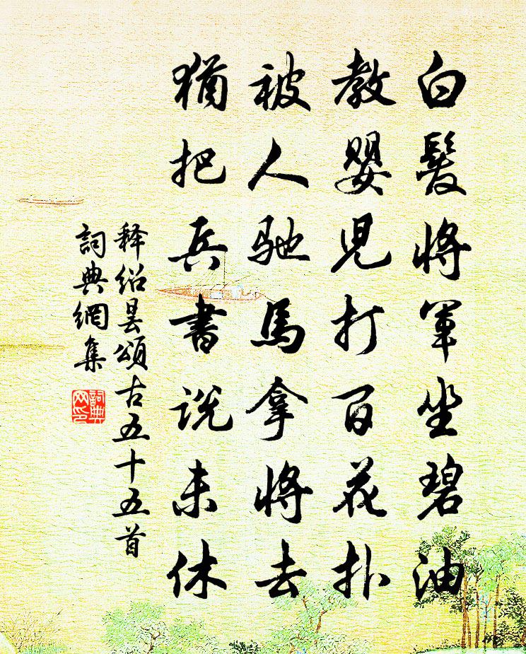 詩詞名句歷史字典書法欣賞書法字典國語詞典說文解字康熙字典古漢語字典標 題 作 者 詩 句 頌古五十五首作者:釋紹曇 朝代:宋代頌古五十五首原文白髮將軍坐碧油,教嬰兒打百花撲。被人馳馬拿將去,猶把兵書說未休。詩詞問答問:頌古五十五首的作者是誰?答:釋紹曇問:頌古五十五首寫於哪個朝代?答:宋代釋紹曇頌古五十五首書法欣賞頌古五十五首書法作品詩詞推薦中江道中李新〔宋代〕茆結蕭蕭宅,松周淺淺出。斧桑雲墮綠,堤水月留灣。楊蕊風團去,蟲絲燕掠還。行經雙只堠,曾未徹重關。精衛·北風盪天地夏完淳〔明代〕北風盪天地,有鳥鳴空林。志長羽翼短,銜石隨浮沈。崇山日以高,滄海日以深。愧非補天匹,延頸振哀音。辛苦水調歌頭(甲辰中秋和傅山父韻)李曾伯〔宋代〕幻出廣寒境,羅襪淨無塵。素娥風格分明,玉骨水為神。手攬清光盈掬,眼看山河一色,閱盡古今人。對影且長嘯郊居晚行呈章令四首趙蕃〔宋代〕斜陽渺渺下前陂,牛自安眠兒得嬉。行過中林卻回顧,眼邊依約有新詩。和張按察秋山二首賦孤山何夢桂〔宋代〕錢塘日夜水東流,回首孤山綠尚稠。千載老仙隨鶴去,百年此地少人游。相逢柳色還青眼,說著梅花總白頭。身後牧羊兒土鼓朱元璋〔明代〕群羊朝牧遍山坡,松下常吟樂道歌。土鼓抱時山鬼聽,石泉濯處澗鷗和。金華誰識仙機密,蘭渚何知道術多。歲久秋日書懷三首白玉蟾〔宋代〕桂花已是上番香,楓葉飄紅柿葉黃。社日雨多晴較少,秋風晝熱暮差涼。獻錢尚父貫休〔唐代〕貴逼花人來不自花由,龍驤花鳳翥勢難花收。滿堂花醉三千客,一劍霜寒十四州。鼓角揭天嘉氣冷,風濤動地海山李國博遺浙姜建茗梅堯臣〔宋代〕吳姜漬吳糟,越茗苞越籜。咀辛聊案杯,啜味可奴酪。但拜故人貺,何言為物薄。我心易厭足,不比填溝壑。三月三日西湖第三橋四首方回〔宋代〕正月橋西賣酒家,柳初青眼草初芽。重來紅紫隨風雨,猶有野田黃茶花。酬僕射牛相公晉國池上別後至甘棠館忽夢同游…口號見寄劉禹錫〔唐代〕已嗟池上別魂驚,忽報夢中攜手行。此夜獨歸還乞夢,老人無睡到天明。東籬陸游〔宋代〕漫道深居晝掩關,東籬栽接不曾閒。每因清夢遊敷水,自覺前身隱華山。花發時時攜綠酒,客來往往羨朱顏。藥爐呈秦楚材吳可〔宋代〕倒指煙塵歲月深,引杯看劍漫悲吟。平生自嘆雕蟲手,末路空慚舐犢心。剩喜星郎上雲漢,苦憐鶴髮避山林。君家次韻穎叔觀燈蘇軾〔宋代〕安西老守是禪僧,到處應然無盡燈。永夜出遊從萬騎,諸羌入看擁千層。便因行樂令投甲,不用防秋更打冰。振旅南鄉子(和元規)張繼先〔宋代〕無奈這群迷。味色聲中若系羈。盡任改頭兼換面,何悲。不染伊時不管伊。春去又秋兮。莫遣空逾十二時。好把自行香子 自詠王哲〔元代〕有個王三,風害狂顛。棄榮華、乞化為先。恩山愛海,猛舍俱捐。也晃栽花,不料藥,不耕田。落魄婪耽,到處成餞駱四二首李嶠〔唐代〕平生花何以樂,花斗花夜相逢。曲中驚別緒,醉里失愁容。星月懸秋漢,風霜入曙鍾。明日臨溝水,青山幾萬重。題周廉彥所收李甲畫三首三鴨晁補之〔宋代〕鴨急風吹雪滿汀洲,迎臘淮南憶倦遊。小鴨枯荷野艇冷,去年今日凍高郵。踏莎行向滈〔宋代〕萬水千山,兩頭三緒。憑高望斷迢迢路。錢塘江上客歸遲,落花流水青春暮。步步金蓮,朝朝瓊樹。目前都是傷心挽永康守成寺簿同年二首程公許〔宋代〕模楷親前哲,丰姿自軼群。迴翔垂白髮,凌厲即青雲。幕府列功簿,詩書清塞氛。寶仙催命駕,拱木漫新墳。名句推薦但存方寸地,留與子孫耕。馮夢龍《喻世明言·卷二十二》 楚鄉飛鳥沒,獨與碧雲還。錢起《送夏侯審校書東歸》 腳踏車欲問邊,屬國過居延。王維《使至塞上》 江南可採蓮,蓮葉何田田。佚名《江南》 一沐三捉髮,一飯三吐哺。司馬遷《史記·魯周公世家》 細雨斜風作曉寒。淡煙疏柳媚晴灘。蘇軾《浣溪沙·元豐七年十二月二十四日從泗州劉倩叔游南山》 慘慘柴門風雪夜,此時有子不如無。黃景仁《別老母》 垂釣板橋東,雪壓蓑衣冷。釋敬安《題寒江釣雪圖》 雲盡月如練,水涼風似秋。歐陽詹《荊南夏夜水樓懷昭丘直上人云夢李莘》 不見穿針婦,空懷故國樓。孟浩然《他鄉七夕》