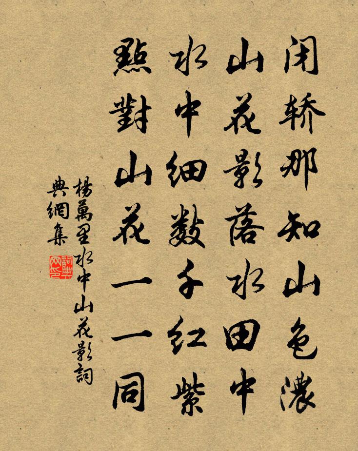 詩詞名句歷史字典書法欣賞書法字典國語詞典說文解字康熙字典古漢語字典標 題 作 者 詩 句 水中山花影作者:楊萬里 朝代:宋代水中山花影原文閉轎那知山色濃,山花影落水田中。水中細數千紅紫,點對山花一一同。詩詞問答問:水中山花影的作者是誰?答:楊萬里問:水中山花影寫於哪個朝代?答:宋代問:楊萬里的名句有哪些?答:楊萬里名句大全楊萬里水中山花影書法欣賞水中山花影書法作品詩詞推薦廣信試院追和東坡催試官考校韻喻良能〔宋代〕深院鎖涼秋,西風坐間好。几淨窗明塵不飛,似躡紅雲至三島。數枝淡淡桂新香,千帶垂垂柳初老。此邦天下秀,題畫馬圖李復〔宋代〕龍種天駒產渥窪,五雲毛色散成花。瑤池一去無訊息,只許丹青紙上夸。頌十玄談釋印肅〔宋代〕達達,遍滿河沙微塵剎。本來無語似陽春,雨過花枝連夜發。次四六叔韻劉子翬〔宋代〕吾家小步兵,辭林獨輝映。攜詩過山堂,句挾風雲潤。思嵇遠命駕,訪戴屢乘興。訂古釋群疑,談玄發清聽。年均贈蘇崑生陳維崧〔清代〕吳苑春如繡。笑野老、花顛酒惱,百無不有。淪落半生知己少,除卻 * 屠狗。算此外、誰歟吾友?忽聽一聲河滿覆甌峰陳岩〔宋代〕生鐵團團鑄翠巒,一甌倒覆白雲端。甌中姓氏無人識,應被山靈靜揭看。朱仲寔少府到官無幾日即入僉幕官滿送行二首戴復古〔宋代〕才智人難及,上 * 用賢。梅仙無一事,蓮幕坐三年。政譽傾千里,歸途仰二天。辟書聞早上,松菊莫留連。上元後連數日小雨作寒戲作陸游〔宋代〕春風催暖入園林,一片雲生又作陰。留得梅花三日住,誰雲造物本無心?巴峽聞猿釋文兆〔宋代〕倚棹望雲際,寥寥出峽清。心如無一事,愁不在三聲。帶露諸峰迥,懸空片月明。何人同此聽,徹曉得詩成。詠棋子贈弈僧張喬〔唐代〕黑白誰能用入玄,千回生死體方圓。空門說得恆沙劫,應笑終年為一先。新堤趙崇鉘〔宋代〕淡煙衰草雨絲絲,小醉微吟倒接籬。吟到水西雲影北,莞然一笑已無詩。法駕導引陳與義〔宋代〕簾漠漠,簾漠漠,天澹一簾秋。自洗玉舟斟白醴,月華微映是空舟。歌罷海西流。劉郎浦口號呂溫〔唐代〕吳蜀成婚此水潯,明珠步障幄黃金。誰將一女輕天下,欲換劉郎鼎峙心。前漢門高祖周曇〔唐代〕愛子從烹報主時,安知強啜不含悲。太公懸命臨刀幾,忍取杯羹欲為誰。午睡陸游〔宋代〕槐楸陰里綠窗開,天與先生作睡媒。流汗未乾衣上雨,大聲已發鼻端雷。枕鐫松石分琴薦,簟織風漪取笛材。卻起送江陰簿江楚材先輩宋祁〔宋代〕黌舍久過從,清言服阿戎。半綸人結綬,一箭水分風。行稻鮮原綠,攀花雜樹紅。羨君談有助,新論得王充。次韻持上人題延慶寺清玉軒張良臣〔宋代〕水芳未動城南路,一一僧檐有竹看。政爾塵埃能自表,故應悠久澹相安。長楊曉獵干戈肅,古棘春朝萬玉寒。碧眼題東老庵史功舉〔宋代〕弁山凝翠碧橫天,霅水開鑒流清泉。隱君東老志高潔,一庵結在青山邊。平生倒屣愛佳客,買書不惜傾囊錢。秋負林貴文買牡丹見贈至彭村偶題辛棄疾〔宋代〕寶刀和雨剪流霞,送到彭村刺史家。聞道名園春已過,千金還買暨家花。初發石首城謝靈運〔南北朝〕白珪尚可磨,斯言易為緇。雖抱中孚爻,猶勞貝錦詩。寸心若不亮,微命察如絲。日月垂光景,成貸遂兼茲。出宿名句推薦來掃千山雪,歸留萬國花。袁枚《春風》 忽聞歌古調,歸思欲沾巾。杜審言《和晉陵陸丞早春遊望》 雲山行處合,風雨興中秋。高適《送魏八》 鳳皇舟上楚女,妙舞,雷喧波上鼓孫光憲《河傳·柳拖金縷》 日日思君不見君,共飲長江水。李之儀《卜運算元·我住長江頭》 手種堂前垂柳,別來幾度春風?歐陽修《朝中措·送劉仲原甫出守維揚》 此身行作稽山土,猶吊遺蹤一泫然。陸游《沈園二首》 青青園中葵,朝露待日晞。佚名《長歌行》 圓荷浮小葉,細麥落輕花。杜甫《為農》 離離原上草,一歲一枯榮。白居易《草 / 賦得古原草送別》