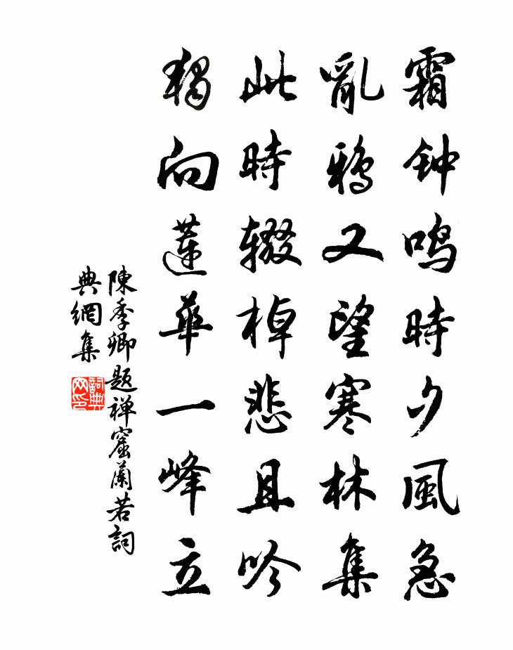 詩詞名句歷史字典書法欣賞書法字典國語詞典說文解字康熙字典古漢語字典標 題 作 者 詩 句 題禪窟蘭若作者:陳季卿 朝代:唐代題禪窟蘭若原文霜鐘鳴時夕風急,亂鴉又望寒林集。此時輟棹悲且吟,獨向蓮華一峰立。詩詞問答問:題禪窟蘭若的作者是誰?答:陳季卿問:題禪窟蘭若寫於哪個朝代?答:唐代問:題禪窟蘭若是什麼體裁?答:七古陳季卿題禪窟蘭若書法欣賞題禪窟蘭若書法作品注釋全唐詩:卷868-21詩詞推薦如夢令·纖月黃昏庭院納蘭性德〔清代〕纖月黃昏庭院,語密翻教醉淺。知否那人心?舊恨新歡相半。誰見?誰見?珊枕淚痕紅泫。聞砧(一作寄邊衣)裴說〔唐代〕深閨乍冷鑒開篋,玉箸微微濕紅頰。一陣霜風殺柳條,濃煙半夜成黃葉。垂垂白練明如雪,獨下閒階轉淒切。只知登單州城樓呂希哲〔宋代〕斷霞孤鶩欲寒天,無復青山礙目前。世路崎嶇飽經歷,始知平地是神仙。步蟾宮章耐軒〔宋代〕未開大如木犀蕊。開後是、梅花小底。然只欲住山林,肯容易、結根城市。葉兒又與冬青比。算何止、香聞七里。甲午除夜元好問〔金代〕暗中人事忽推遷,坐守寒灰望復燃。已恨太官余曲餅,爭教漢水入膠船?神功聖德三千牘,大定明昌五十年。甲子風雨中誦潘邠老詩韓淲〔宋代〕滿城風雨近重陽,獨上吳山看大江。老眼昏花忘遠近,壯心軒豁任行藏。從來野色供吟興,是處秋光合斷腸。今古菩薩蠻(送太夫人就養南安)郭應祥〔宋代〕佳辰昨日傳筒黍。今朝重把離觴舉。別駕奉安輿。前呵方塞途。龐眉真壽相。兩處交迎養。庾嶺到星沙。風光屬一唐享昊天樂第十二武則天〔唐代〕式乾路,辟天扉。回日馭,動雲衣。登金闕,入紫微。望仙駕,仰恩徽。和叔崇清明後四絕王柏〔宋代〕緩步微吟竹一枝,情懷不比少年時。少年春思無歸宿,卻是如今老會嬉。殢人嬌蘇軾〔宋代〕別駕來時,燈火熒煌無數。向青瑣、隙中偷覰。元來便是,共采鸞仙侶。方見了,管須低聲說與。百子流蘇,千枝潘德久有龍眠三馬百失其一俾予賦詩王居安〔宋代〕三馬往往皆龍駒,神駿肯與凡馬俱。忽不見者其前驅,定應悄上天之衢。君得其二已有餘,我欲與君分此圖。駑才送黃秀才李中〔唐代〕雨餘飛絮亂,相別思難任。酒罷河橋晚,帆開煙水深。蟾宮須展志,漁艇莫牽心。岐路從茲遠,雙魚信勿沈。疇依王柏〔宋代〕禹乃嗣興,載平水土。天錫九疇,彝倫攸敘。克儉克勤,不伐不矜。有典有則,貽厥子孫。奉和襲美二游詩任詩陸龜蒙〔唐代〕吳之辟疆園,在昔勝概敵。前聞富修竹,後說紛怪石。風煙慘無主,載祀將六百。草色與行人,誰能問遺蹟?不知西江月佚名〔宋代〕好個馬山居士,功名富貴浮雲。庵兒側傍萬杉陰。煙里時橫小艇。律中林鍾將半,華堂壽斝頻斟。聲聲齊祝百千齡壽崔西清二首洪咨夔〔宋代〕幾年生一賢,大任天所授。三光五嶽氣,半點無缺漏。胸中老規摹,超出造化囿。靜為動之機,燕坐運宇宙。艮居偈傾一百六十九首釋智朋〔宋代〕依時及節,歲歲元正啟祚。葭管灰飛,勾芒布令。春牛頭黃,歲稔年康。立春日晨起對積雪張九齡〔唐代〕忽對林亭雪,瑤華處處開。今年迎氣始,昨夜伴春回。玉潤窗前竹,花繁院裡梅。東郊齋祭所,應見五神來。梅碑易士達〔宋代〕冷蕊誰回筆底春,不教花落更芬芬。自從揭在吟窗里,常帶催詩一片雲。漢武任隨〔宋代〕殊庭深恨隔仙曹,桂館蜚廉事轉勞。銀闕尚沈滄海闊。井幹空拂絳河高。萯陽弋獵侵多稼,朔塞旌旗照不毛。苦信名句推薦一時勸人以口,百世勸人以書。袁黃《了凡四訓·積善之方》 紙灰飛作白蝴蝶,淚血染成紅杜鵑。高翥《清明日對酒》 芄蘭之葉,童子佩韘。佚名《芄蘭》 昔人已乘黃鶴去,此地空餘黃鶴樓。崔顥《黃鶴樓 / 登黃鶴樓》 九日悲秋不到心。鳳城歌管有新音。晏幾道《鷓鴣天·九日悲秋不到心》 天與三台座,人當萬里城。張九齡《奉和聖制送尚書燕國公赴朔方》 夜雨剪春韭,新炊間黃粱。杜甫《贈衛八處士》 江水三千里,家書十五行。袁凱《京師得家書》 弱則保命,不可作強;強則斂翼,休求盡善。來俊臣《羅織經·保身卷第七》 昨夜吳中雪,子猷佳興發。李白《答王十二寒夜獨酌有懷》