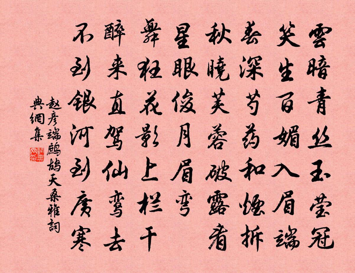 詩詞名句歷史字典書法欣賞書法字典國語詞典說文解字康熙字典古漢語字典標 題 作 者 詩 句 鷓鴣天(桑雅)作者:趙彥端 朝代:宋代鷓鴣天(桑雅)原文雲暗青絲玉瑩冠。笑生百媚入眉端。春深芍藥和煙拆,秋曉芙蓉破露看。星眼俊,月眉彎。舞狂花影上欄乾。醉來直駕仙鸞去,不到銀河到廣寒。詩詞問答問:鷓鴣天(桑雅)的作者是誰?答:趙彥端問:鷓鴣天(桑雅)寫於哪個朝代?答:宋代問:鷓鴣天(桑雅)是什麼體裁?答:詞趙彥端鷓鴣天(桑雅)書法欣賞鷓鴣天(桑雅)書法作品詩詞推薦句賈仲穎〔宋代〕燈花寒影里,詩句雨聲中。盡開窗戶容秋月,遍倚闌乾看晚山。送知無見釋心月〔宋代〕百城煙水夜光寒,巾子峰頭曾細觀。轉得身來天已曉,目前贏得黑漫漫。夜泊廬江聞故人在東林寺以詩寄之王昌齡〔唐代〕江路經廬阜,松門入虎溪。聞君尋寂樂,清夜宿招提。石鏡山精怯,禪枝怖鴿棲。一澄如悟道,為照客心迷。晝寢宴坐軒憶與蘇才翁會別蔡襄〔宋代〕投涼下馬臥僧家,繞簟清風卷絳妙。修竹滿前微雨過,遠山無際薄雲遮。武侯舊隱人應到,閩粵孤城日自斜。解與同樂天和微之深春二十首(同用家花車斜四韻)劉禹錫〔唐代〕何處深春好,春深萬乘家。宮門皆映柳,輦路盡穿花。池色連天漢,城形象帝車。旌旗暖風裡,獵獵向西斜。何處昆丘楊備〔宋代〕雲里山花翠欲浮,當時片玉轉難求。卞和死後無人識,石腹包藏不採收。朝宗饋食且復招飲陳起〔宋代〕相親逾骨肉,何以結情深。下箸覺可口,同盤還上心。撥灰君句就,曝背我寒侵。屢有梅窗約,行將共晚斟。苦吟趙汝鐩〔宋代〕幾度燈花落,苦吟難便成。寒窗明月滿,樓上打三更。周祀五帝歌 青帝雲門舞庾信〔南北朝〕甲在日。鳥中星。禮東後。奠蒼靈。樹春旗。命青史。候鴈還。東風起。歌木德。舞震宮。泗濱石。龍門桐。孟之泊秋浦李中〔唐代〕葦岸風高宿雁驚,維舟特地起鄉情。漁兒隔水吹橫笛,半夜空江月正明。食櫻筍二首蘇轍〔宋代〕林竹抽萌不忍挑,誰家盈束伴晨樵。籜龍似欲號無罪,食客安知惜後凋。不願鹽梅調鼎味,姑從律呂應簫韶。林間金陵雜興二百首蘇泂〔宋代〕縛屋牽牛旋旋歸,淮邊綠野盡耕犁。弓刀武備何曾識,只是當初田舍兒。風光草際浮陳璀〔唐代〕春風泛搖草,旭日遍神州。已向花間積,還來葉上浮。曉光緣圃麗,芳氣滿街流。澹蕩依朱萼,颻颺帶玉溝。向空較藝書事再呈永叔並同院諸公王珪〔唐代〕小雨班班拂曉除,新禽格礫靜相呼。眼窺夜卷千花碧,肺渴春盤幾露珠。只見樓頭飄落絮,不知門外長青蕪。玉階和蘇仲南邵湖會飲三首張耒〔宋代〕新亭當絕島,景物更清妍。耳熱風前酒,心澄水底天。觀魚方有得,薦味肯烹鮮。默坐吟春草,知君似惠連。宿野廟金人瑞〔清代〕眾響漸已寂,蟲於佛面飛。半窗關夜雨,四壁掛僧衣。寄題蕪湖深道所居二首獨樂堂李彌遜〔宋代〕韋郎江海士,心與凡子各。折腰卑小官,不事乾祿學。觀身一牛毛,閱世兩蝸角。紛華豈不好,名教自有樂。虛堂晚日程公許〔宋代〕西崦落照暈金鉦,斂退痴雲作嫩晴。忽忽暝煙行十里,前頭燈火是鵑城。滿江紅姜夔〔宋代〕仙姥來時,正一望、千傾翠瀾。旌旗共、亂雲俱下,一依前山。命駕群龍金作軛,相從諸娣玉為冠。向夜深、風定題企疏堂張元乾〔宋代〕出處當師漢大夫,立朝常擬賦歸歟。賜金端為供行樂,燕客猶疑是送車。欲識吳門重解組,要符潭府向移書。聞知名句推薦蘭帳玉人睡覺,怪春衣、雪沾瓊綴。章楶《水龍吟·燕忙鶯懶芳殘》 迴廊遠砌生秋草,夢魂千里青門道。馮延巳《菩薩蠻·迴廊遠砌生秋草》 臨官莫如平,臨財莫如廉。劉向《說苑·政理》 東飛伯勞西飛燕,黃姑織女時相見。蕭衍《東飛伯勞歌》 音塵絕,西風殘照,漢家陵闕。李白《憶秦娥·簫聲咽》 如知其非義,斯速已矣,何待來年。孟子《孟子·滕文公章句下·第八節》 唯君子為能通天下之志。佚名《易傳·彖傳上·同人》 銀鞍照白馬,颯沓如流星。李白《俠客行》 亭皋木葉下,隴首秋雲飛柳惲《搗衣詩》 聖人不法古,不脩今。法古則後於時,脩今則塞於勢。商鞅《商君書·開塞》