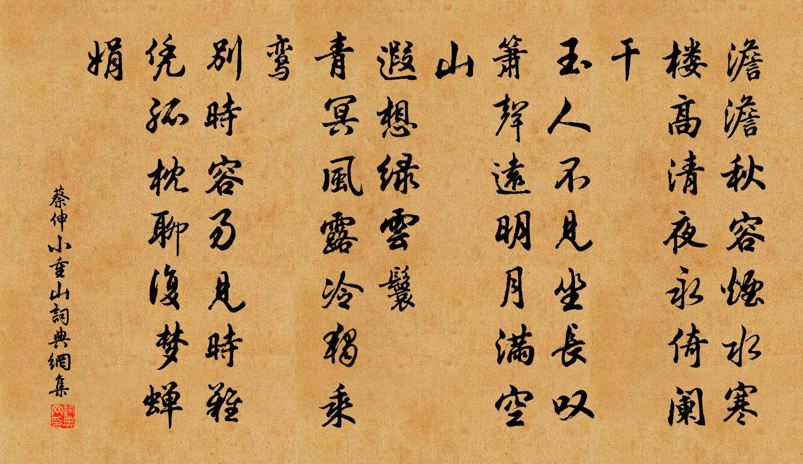 詩詞名句歷史字典書法欣賞書法字典國語詞典說文解字康熙字典古漢語字典標 題 作 者 詩 句 小重山作者:蔡伸 朝代:宋代小重山原文澹澹秋容煙水寒。樓高清夜永,倚闌乾。玉人不見坐長嘆。簫聲遠,明月滿空山。遐想綠雲鬟。青冥風露冷,獨乘鸞。別時容易見時難。憑孤枕,聊復夢蟬娟。詩詞問答問:小重山的作者是誰?答:蔡伸問:小重山寫於哪個朝代?答:宋代問:小重山是什麼體裁?答:詞蔡伸小重山書法欣賞小重山書法作品詩詞推薦建平縣道中項安世〔宋代〕糖甖花開官路香,客子欲歸官路長。稻田水足新秧黃,小麥吐秀南風涼。村村煮酒開官坊,家家禁忌障朁房。門前之廣都憩鐵像院陸游〔宋代〕歲暮天苦寒,風雨復乘之。道邊得古寺,欣然具晨炊。瘦樹立中庭,斷蔓絡短籬。小僧為返爐,童子燒槁枝。坐令開先寺前望瀑布晁補之〔宋代〕白虹晝下崑崙頂,半入青林久不回。下洞水輪穿地底,冰崖吼怒卻重來。金縷曲 送茅山道人,並寄山中諸道友張之翰〔元代〕回首茅山路。渺滔滔、長江南畔,碧山無數。曾被天風吹醉夢,直到華陽深處。也親見、鸞驂鶴馭。覺後分明空記變法白居易〔唐代〕自慚到府來周歲,惠愛威稜一事無。唯是改張官酒法,漸從濁水作醍醐。楊國夫人趙氏挽章周麟之〔宋代〕猗蘭奕葉神明胄,四德宜家綽有餘。盛事可稽彤筆史,當年曾夢紫函書。子登虎榜朝輝弁,夫握龍韜拱殿廬。長樂雜詩 其一陶淵明〔魏晉〕遙遙從羈役,一心處兩端。掩淚汛東逝,順流追時遷。日沒星與昂,勢翳西山巔。蕭條隔又涯,惆悵念常餐。慷慨詠後山鎮水月奇觀閣吳勢卿〔宋代〕厭逐京華輦路塵,歸來傑閣敞虛明。斜陽兩岸暮山紫,明月一天秋水橫。芳草盡頭黃犢樂,蘆花深處白鷗聲。是中點絳唇趙子發〔宋代〕野岸孤舟,斷橋明月穿流水。雁聲嘹嚦。雙落行人淚。去歲吾家,曾插黃花醉。今那是。杖藜西指。看即成千里。扇子詩李石〔宋代〕師資為學之規,朋友為學之勸。說與潤屋千金,何似傳家萬卷。和漁翁四絕劉黻〔宋代〕世業相承不裹頭,一家全在水中浮。有魚便可供沈醉,休問清流與濁流。禱雨陽山曹彥約〔宋代〕暮投突兀淨為坊,早踏崎嶇翠作岡。露氣失涼風帶暑,嵐陰欺曉日韜光。不憂時事禽空語,可怪凶年草更芳。欲問記揚州舊事陳造〔宋代〕合宮嚼蕊今柳枝,燕台酷賞騷人詩。國色天香豈凡品,瓊枝璧月信好辭。向來弄影對簫鼓,楚山高深自雲雨。若為送彭孕先赴辰州教授趙蕃〔宋代〕因行碧湘門,倏念黃草尾。曩辭戴安道,同者歐陽子。那知三年過,僅謂一日爾。惟辰雖陋邦,分教多名士。前瞻滿江紅沈瀛〔宋代〕半世飄蓬,今何幸、得歸鄉曲。卻還似、重來燕子,認巢新屋。好是秋晴風日美,飯香雲子炊如玉。念蟹螯、滿把和陸司業習靜寄所知張籍〔唐代〕幽室獨焚香,清晨下未央。山開登竹閣,僧到出茶床。收拾新琴譜,封題舊藥方。逍遙無別事,不似在班行。郊進退律賦水鄉三實唐士恥〔宋代〕冰雪胸懷七澤姿,纖纖舞袖學雙飛。袢襟應念人間世,灌頂何如山上芝。荷葉巧偷鸚鵡背,蓴絲密綴燕雛衣。回塘仲秋書事陸游〔宋代〕斷雲歸岫雨初收,茅舍蕭條古渡頭。短褐老人垂九十,松枯石瘦不禁秋。賦得風動萬年枝樊陽源〔唐代〕珍木羅前殿,乘春任好風。振柯方裊裊,舒葉乍濛濛。影動丹墀上,聲傳紫禁中。離披偏向日,凌亂半分空。輕拂歲晚幽興陸游〔宋代〕萬里風波行路難,君恩尚許綴祠官。中庭鬱郁藥苗長,絕壁颼颼松吹寒。泥巷有人尋杜甫,雪廬無吏問袁安。清晨名句推薦新知遭薄俗,舊好隔良緣。李商隱《風雨》 長記海棠開後,正傷春時節李清照《好事近·風定落花深》 江海不擇小助,故能成其富。韓非及後人《韓非子·大體》 相見爭如不見,多情何似無情。司馬光《西江月·寶髻松松挽就》 荒戍落黃葉,浩然離故關。溫庭筠《送人東遊》 傳屐朝尋藥,分燈夜讀書。於鵠《題鄰居》 一片春愁待酒澆。江上舟搖,樓上簾招。蔣捷《一剪梅·舟過吳江》 至今雲雨帶愁容,月斜江上,征棹動晨鐘牛希濟《臨江仙·峭壁參差十二峰》 迴廊四合掩寂寞,碧鸚鵡對紅薔薇。李商隱《日射》 臨難不顧生,身死魂飛揚阮籍《詠懷其五十三》