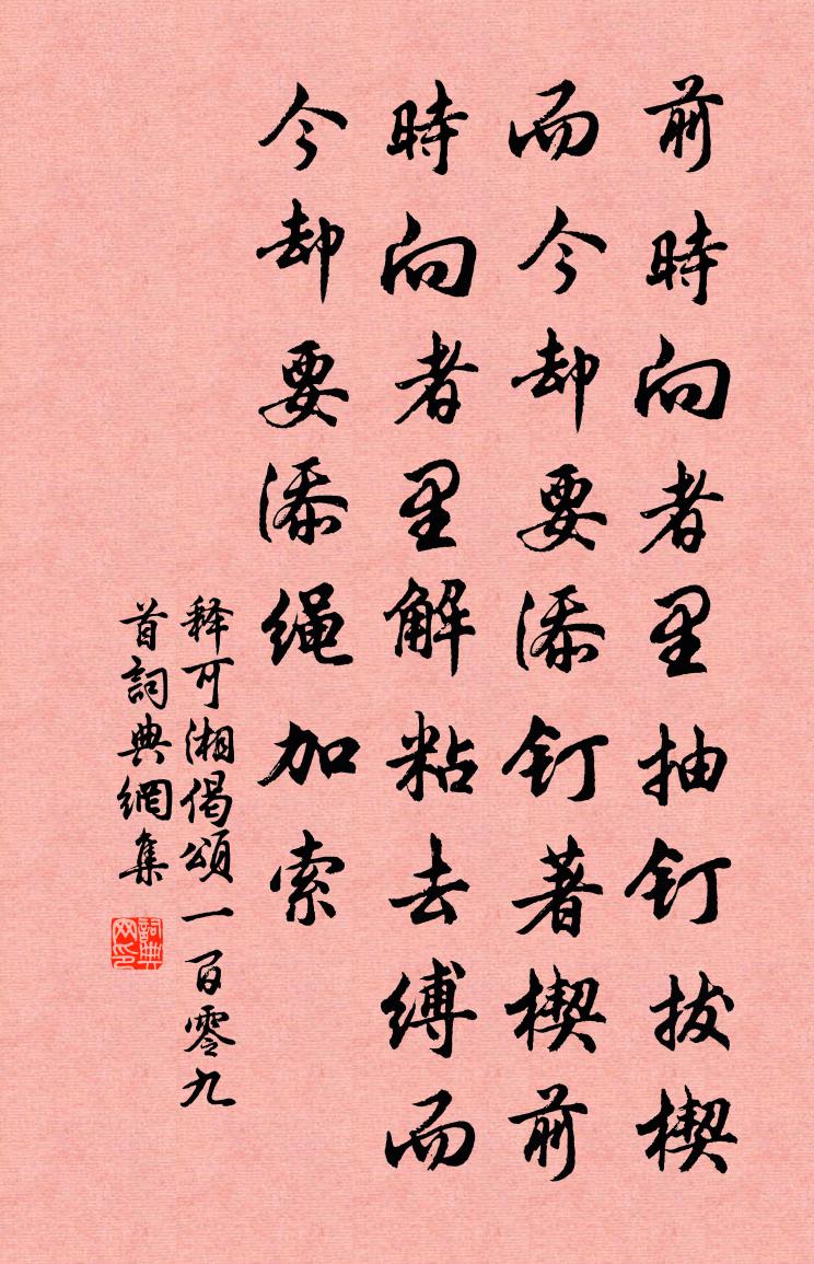 詩詞名句歷史字典書法欣賞書法字典國語詞典說文解字康熙字典古漢語字典標 題 作 者 詩 句 偈頌一百零九首作者:釋可湘 朝代:宋代偈頌一百零九首原文前時向者里抽釘拔楔,而今卻要添釘著楔。前時向者里解粘去縛,而今卻要添繩加索。詩詞問答問:偈頌一百零九首的作者是誰?答:釋可湘問:偈頌一百零九首寫於哪個朝代?答:宋代釋可湘偈頌一百零九首書法欣賞偈頌一百零九首書法作品詩詞推薦和韓毅伯求鹿皮韻王炎〔宋代〕文豹以皮豜以肉,鹿兼坐此命難贖。梅花膚革充靴材,人恰跣行畏傷足。送趙仲禮入大理寺簿孫應時〔宋代〕忠孝吾根柢,功名古緒餘。月雲無染著,鏡象本空虛。不必相同異,何妨小闊疏。達庵今宦達,味此意何如。永叔內翰見索謝公游嵩書感嘆希深師魯子聰幾梅堯臣〔宋代〕昔在洛陽時,共游花馳陌。尋花不見人,前代公侯宅。深堂鎖塵埃,空壁斗蜥蜴。楸陰花 * ,野蔓纏石碧。池魚次韻葛天民翁卷〔宋代〕接得詩來勝接書,憶君情思豁然舒。卻看城裡誰家竹,又鎖湖邊舊住廬。曾有退之憐賈島,豈無得意薦相如。欲知送黃天河樂雷發〔宋代〕天河那可到,山頂翠參差。村屋煎黃蠟,官爐焙荔支。地蠻遊宦少,縣小迓賓遲。鼻祖曾吟處,荒苔想滿碑。和永叔柘枝歌梅堯臣〔宋代〕漁陽三疊音隆隆,紅蕖亂坼當秋風。披香擁霧出妖嫮,嫵眉壯發翩驚鴻。鏘鏘雜佩離芳渚,珠帽紅靴振金縷。相迎和人回文五首蘇軾〔宋代〕蛾翠斂時聞燕語,淚珠彈處見鴻歸。多情妾似風花亂,薄倖郎如露草曦。觀南郊回仗佚名〔唐代〕傳警千門寂,南效彩仗回。但驚龍再見,誰識日雙開。德澤施雲雨,恩光變燼灰。閱兵貔武振,聽樂鳳凰來。候刻題張藍田訟堂錢起〔唐代〕角巾高枕向晴山,頌簡庭空不用關。秋風窗下琴書靜,夜景門前人吏閒。稍覺淵明歸思遠,東皋月出片雲還。奉送王相公赴幽州(一作韓翃詩,題下有巡邊二字)張繼〔唐代〕黃閣開幃幄,丹墀拜冕旒。位高湯左相,權總漢諸侯。不改周南化,仍分趙北憂。雙旌過易水,千騎入幽州。塞草初八日早出洪澤閘泛淮虞儔〔宋代〕乾道年中再講和,當時議者厭干戈。長淮不管蛟龍怒,巨艦寧容鵝鸛過。歲晚民方愁道路,天寒我亦困風波。中流甲申歲作楊冠卿〔宋代〕急雨來排難,余蒸頓解嚴,時蜩鳴露柳,客燕度風簾。屈指秋無幾,安心氣自恬。夜涼都不寐,落月瑩虛檐。鵲橋仙 七夕范成大〔宋代〕雙星良夜,耕慵織懶,應被群仙相妒。娟娟月姊滿眉顰,更無奈、風姨吹雨。相逢草草,爭如休見,重攪別離心緒別所親林景熙〔宋代〕人生重離別,況此雙鬢蓬。亭柳非故色,昨夜吹霜風。臨分復攜手,野色猶蒙蒙。愁深轉無語,寫入潺湲中。一水頌證道歌證道歌釋印肅〔宋代〕報導摩訶般若力,是境是心全不識。凌雲謾道見桃花,月面依然言不及。胡笳曲王貞白〔唐代〕隴底悲笳引,隴頭鳴北風。一輪霜月落,萬里塞天空。戍卒淚應盡,胡兒哭未終。爭教班定遠,不念玉關中。雜興十二首方回〔宋代〕七十合致仕,已閒十六年。不謂得此壽,念之豈非天。固窮甘蔬飯,窒慾省藥錢。脫遇人負我,微慍遄釋然。豈無富春行贈范振晁補之〔宋代〕錢塘江北百里余,漲沙不復生菰蒲。沙田老桑出葉麤,江潮打根根半枯。八月九月秋風惡,風高駕潮晚不落。鼓聲秋浦清溪雪夜對酒,客有唱山鷓鴣者李白〔唐代〕披君貂襜褕,對君白玉壺。雪花酒上滅,頓覺夜寒無。客有桂陽至,能吟山鷓鴣。清風動窗竹,越鳥起相呼。持此重九日登石閣三首邵雍〔宋代〕事出一時間,時過事莫還。當時深可愛,過後不堪看。夏去休言暑,冬來始講寒。人能知此理,憂患自難乾。名句推薦女兒年幾十五六,窈窕無雙顏如玉。蕭衍《東飛伯勞歌》 共看明月應垂淚,一夜鄉心五處同。白居易《望月有感》 君子周而不比,小人比而不周。孔子弟子《論語·為政篇》 獨在異鄉為異客,每逢佳節倍思親。王維《九月九日憶山東兄弟 / 九月九憶山東兄弟》 離別家鄉歲月多,近來人事半消磨。賀知章《回鄉偶書二首》 流年莫虛擲,華發不相容。方乾《送從兄郜 / 韋郜 / 途中別孫璐》 惟仁者宜在高位。孟子《孟子·離婁章句上·第一節》 莫見長安行樂處,空令歲月易蹉跎。李頎《送魏萬之京》 上士聞道,勤而行之;中士聞道,若存若亡;下士聞道,大笑之。老子《老子·德經·第四十一章》 長歌吟松風,曲盡河星稀。李白《下終南山過斛斯山人宿置酒》