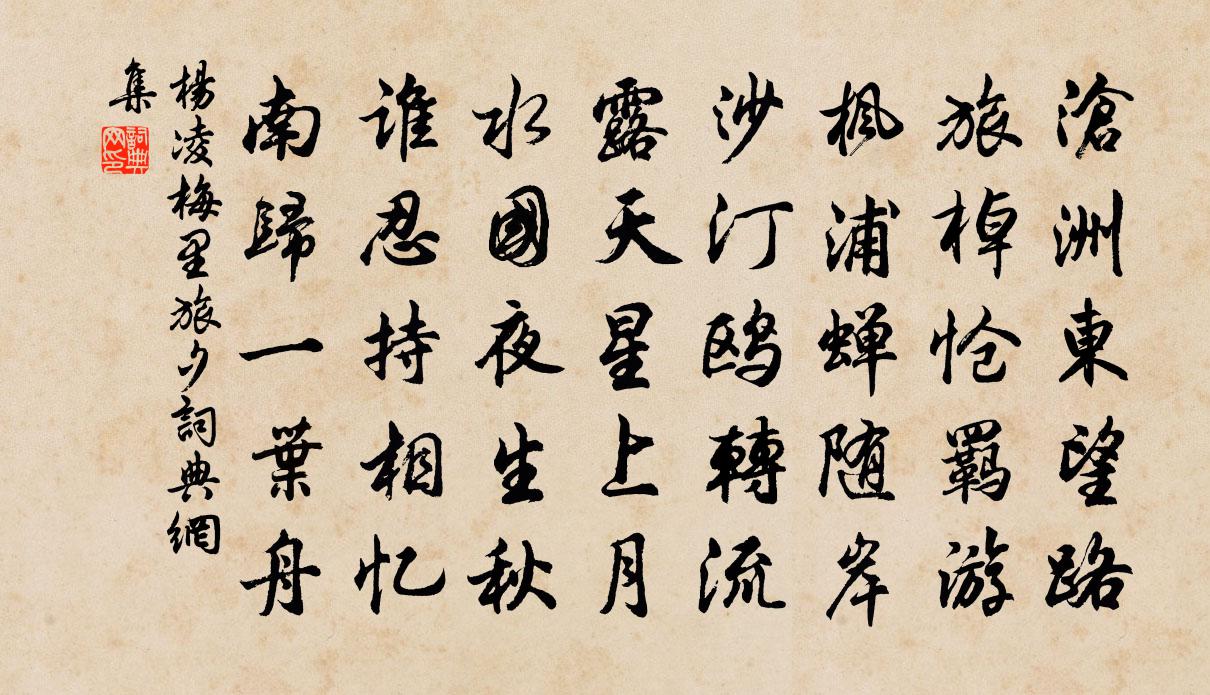 詩詞名句歷史字典書法欣賞書法字典國語詞典說文解字康熙字典古漢語字典標 題 作 者 詩 句 梅里旅夕作者:楊凌 朝代:唐代梅里旅夕原文滄洲東望路,旅棹愴羈游。楓浦蟬隨岸,沙汀鷗轉流。露天星上月,水國夜生秋。誰忍持相憶,南歸一葉舟。詩詞問答問:梅里旅夕的作者是誰?答:楊凌問:梅里旅夕寫於哪個朝代?答:唐代問:梅里旅夕是什麼體裁?答:五律楊凌梅里旅夕書法欣賞梅里旅夕書法作品注釋全唐詩:卷291_2詩詞推薦旅中送遷客吳融〔唐代〕天南不可去,君去吊靈均。落日青山路,秋風白髮人。言危無繼者,道在有明神。滿目盡胡越,平生何處陳。元日寄韋氏妹杜甫〔唐代〕近聞韋氏妹,迎在漢鍾離。郎伯殊方鎮,京華舊國移。春城回北斗,郢樹發南枝。不見朝正使,啼痕滿面垂。頌古三首釋道行〔宋代〕不於三界現身意,誰謂維摩談不二。山空晝永鳥無聲,春光不在千花里。雙松亭徐僑〔宋代〕雙松如老虬,拜然俯於地。山下草細微,降從所非類。昂藏烈丈夫,肯與樵牧比。樛枝若欲頹,直乾固不倚。外柔南柯子 示眾 金蓮正宗記卷五郝大通〔元代〕地肺重陽子,崑崙太古仙。二人結約未生前。托居凡世,飛下大羅天。共闡玄元教,行藏度有緣。奈何不悟似流泉次韻答張誾張閣見寄李廌〔宋代〕我思佳人在何許,太行之陽濟川上。結茆賦詩臨清流,我情搖搖日西向。盤谷秋來陰復晴,谷口與誰來耦耕。賣刀樂樵吟金朋說〔宋代〕木美牛山手斧息,爛柯林下度長年。有時岩底問漁者,利害相論理豁然。和陳長卿賦芭蕉二首王洋〔宋代〕一幅青天世外珍,詩人得句共清新。書生几上側理紙,巫女廟中巴峽神。長恐天寒憑日暮,不將翠袖染緇塵。世間春日即事六言劉克莊〔宋代〕椒酒桃符改舊,麥芒菜甲司新。東皇太乙用事,不能粉飾陳人。鷓鴣天陳三聘〔宋代〕指剝春蔥去采苹。衣絲秋藕不沾塵。眼波明處偏宜笑,眉黛愁來也解顰。巫峽路,憶行雲。幾番曾夢曲江春。相逢浣溪沙·門隔花深舊夢遊吳文英〔宋代〕門隔花深夢舊遊,夕陽無語燕歸愁。玉纖香動小簾鉤。落絮無聲春墜淚,行雲有影月含羞。東風臨夜冷於秋。自京師將赴黔南竇鞏〔唐代〕風雨荊州二月天,問人須雇峽中船。西南一望雲和水,猶道黔南有四千。答李司戶夔宋之問〔唐代〕遠方來下客,輶軒攝使臣。弄琴宜在夜,傾酒貴逢春。駟馬留孤館,雙魚贈故人。明朝散雲雨,遙仰德為鄰。燈下讀玄真子漁歌因懷山陰故隱追擬陸游〔宋代〕長安拜免幾公卿,漁父橫眠醉未醒。煙艇小,釣車腥,遙指梅山一點青。孤兒行佚名〔兩漢〕孤兒生,孤子遇生,命獨當苦。父母在時,乘堅車,駕駟馬。父母已去,兄嫂令我行賈。南到九江,東到齊與魯。春秋戰國門范蠡周曇〔唐代〕西子能令轉嫁吳,會稽知爾啄姑蘇。跡高塵外功成處,一葉翩翩在五湖。水晶簾/南歌子佚名〔宋代〕誰道秋期遠,正旬浹、雙星相見。雨足西簾,正玉井蓮開,壽筵初展。麈尾呼風袢暑淨,那更著、綸巾羽扇。殢清壽范漕吳泳〔宋代〕鷹鸇好彈擊,自謂居使之。鳳凰不鷙搏,群狡亦莫欺。但使德意多,何用風采為。西台十六州,人自春熙熙。金剛隨機無盡頌法界通花分第十九釋印肅〔宋代〕不辭山路遠,要見唐朝面。對面也不識,誰知者方便。哭李韶王元〔唐代〕韶也命何奇,生前與世違。貧棲古梵剎,終著舊 * 。雅句僧抄遍,孤墳客吊稀。故園今孰在,應見夢中歸。名句推薦悵臥新春白袷衣,白門寥落意多違。李商隱《春雨》 枉己者不能直人,忘親者不能忠君。張廷玉《明史·列傳·卷六十七》 責人勿厲,小惠或有大得。來俊臣《羅織經·保身卷第七》 林花著雨胭脂濕,水荇牽風翠帶長。杜甫《曲江對雨》 算陰晴,渾似幾番,渭城故人離會。吳文英《永遇樂·乙巳中秋風雨》 唯見鴻雁飛,令人傷懷抱。高適《登百丈峰二首》 殘雪庭陰,輕寒簾影,霏霏玉管春葭。王沂孫《高陽台·和周草窗寄越中諸友韻》 朱顏那有年年好,逞艷游、贏取如今韓疁《高陽台·除夜》 故聲聞過情,君子恥之。孟子《孟子·離婁章句下·第十八節》 歲暮陰陽催短景,天涯霜雪霽寒宵。杜甫《閣夜》