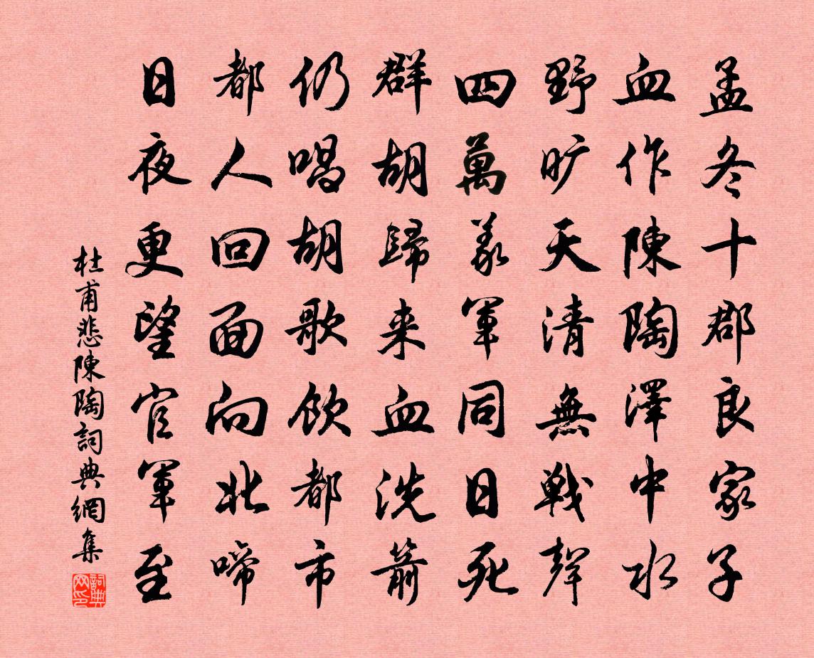 陳陶,地名,即陳陶斜,又名陳陶澤,在長安西北。唐肅宗至德元載(756)冬,唐軍跟安史叛軍在這裡作戰,唐軍四五萬人幾乎全軍覆沒。來自西北十郡(今陝西一帶)清白人家的子弟兵,血染陳陶戰場,景象是慘烈的。杜甫這時被困在長安,詩即為這次戰事而作。