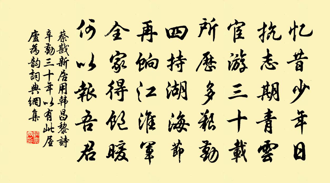 詩詞名句歷史字典書法欣賞書法字典國語詞典說文解字康熙字典古漢語字典標 題 作 者 詩 句 新居用韓昌黎詩辛勤三十年以有此屋廬為韻作者:蔡戡 朝代:宋代原文憶昔少年日,抗志期青雲。宦遊三十載,所歷多艱勤。四持湖海節,再餉江淮軍。全家得飽暖,何以報吾君。詩詞問答問:《新居用韓昌黎詩辛勤三十年以有此屋廬為韻》的作者是誰?答:蔡戡問:該詩寫於哪個朝代?答:宋代問:該詩是什麼體裁?答:五古書法欣賞新居用韓昌黎詩辛勤三十年以有此屋廬為韻書法作品詩詞推薦柳溪別墅姚孝錫〔宋代〕安車隨意飽甘肥,晚食徐行理亦齊。山市日高人未集,柴門客至餞無啼。溪橋散望攜筇度,野寺牽吟信筆題。容膝紅白牡丹吳融〔唐代〕不必繁弦不必歌,靜中相對更情多。殷鮮一半霞分綺,潔澈旁邊月颭波。看久願成莊叟夢,惜留須倩魯陽戈。重來送章傳道東歸三十八韻強至〔宋代〕一日或數篇,數日喔一軸。夫子之於詩,夜補晝不足。長吟天地間,萬象困題目。天徒飽其才,而特餒其腹。聲名峽山寺竹枝詞五首楊萬里〔宋代〕天齊浪自說浯溪,峽與天齊真箇齊。未必峽山高爾許,看來只恐是天低。久雨文同〔宋代〕寒鳩劬劬屋上鳴,欲使此雨何時晴。山中有客抱幽郁,日日起望東方明。今朝晚霞發光焰,喜極再拜當西楹。須臾寄黃希聲利登〔宋代〕相會不幾日,相別又經時。居然感我懷,何以寫所思。舉目皆我友,我心知者誰。知心而久離,此情悲不悲。義靈廟迎享送神曲游九言〔宋代〕青溪煽兮氛妖,洶二浙兮波濤。花石粲兮江南驛騷,匪氓好亂兮生不聊。欻蠻方兮同嘯,紛醜類兮江皋。愬精誠兮和虞永康梅花十絕句魏了翁〔宋代〕滄江卜室數年間,畚築栽培僅息肩。生色油然已如此,箇中自有不須禪。偈十六首釋行瑛〔宋代〕朔風如刀,痛利人骨。千山萬山,雪映寒日。心知春氣來,目睹梅花發。遊子南方歸不歸,曉堂閒卻龜毛拂。句張淏〔宋代〕今朝執手難言處,此去傾懷更有誰。縣舍西亭二首王安石〔宋代〕山根移竹水邊栽,已見新篁破嫩苔。可惜主人官便滿,無因長向此徘徊。木芙蓉釋輝〔宋代〕霜深才吐艷,日暮更饒紅。掩映殘荷浦,馮夷敗菊業。過華山潘閬〔宋代〕高愛三峰插太虛,掉頭吟望倒騎驢。旁人大笑從他笑,終擬移家向此居。頌古十首釋慧空〔宋代〕鬼門帖卦鬼猶驚,又見毛頭掃帚星。若得過關公驗正,夜深把手御街行。舟次橫河呈孫季和通守蘇泂〔宋代〕冉冉歸雲不自閒,紛紛暮靄已依山。時光盡入髭鬚里,行色元非草樹間。舊臘新正能幾許,粗衣糲飯試諸難。吾生相和歌辭襄陽曲李端〔唐代〕襄陽堤路長,草碧柳枝黃。誰家女兒臨夜妝,紅羅帳里有燈光。雀釵翠羽動明璫,欲出不出脂粉香。同居女伴正衣題趙子昂摹唐人二戲馬駒方回〔宋代〕我嘗遠過燕山北,樹木已無草一色。騏驥驊騮動萬匹,互齧交蹄戲跳躑。誰歟畫此雙名駒,似斗非斗相嬉娛。唐人頌古四十四首釋師範〔宋代〕持來送去樣團團,覆陰兒孫義不寒。何似當時休擘破,渾侖留與後人看。嘲魯儒李白〔唐代〕魯叟談五經,白髮死章句。問以經濟策,茫如墜煙霧。足著遠遊履,首戴方山巾。緩步從直道,未行先起塵。秦家玉堂春王哲〔元代〕得得修行,有令捷徑走。子午俱無,何須卯酉。只用兩珍,於余堪廝守。鉛汞從教結作*。憑則成丹,般般盡總透名句推薦江闊雲低、斷雁叫西風。蔣捷《虞美人·聽雨》 故音樂者,所以動盪血脈,通流精神而和正心也。司馬遷《史記·樂書》 九華山路雲遮寺,清弋江村柳拂橋。杜牧《宣州送裴坦判官往舒州時牧欲赴官歸京》 扁舟昨泊,危亭孤嘯,目斷閒雲千里。吳潛《鵲橋仙·扁舟昨泊》 以子之矛陷子之盾韓非及後人《韓非子·難一》 風自火出,家人;君子以言有物而行有恆。佚名《易傳·象傳下·家人》 前事之不忘,後事之師。劉向《戰國策·趙一·張孟談既固趙宗》 覺來眄庭前,一鳥花間鳴。李白《春日醉起言志》 白髮漁樵江渚上,慣看秋月春風。楊慎《臨江仙·滾滾長江東逝水》 莫道君行早,更有早行人。佚名《增廣賢文·上集》
