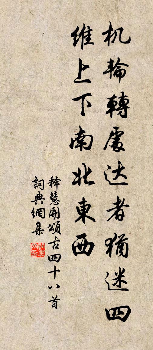 詩詞名句歷史字典書法欣賞書法字典國語詞典說文解字康熙字典古漢語字典標 題 作 者 詩 句 頌古四十八首作者:釋慧開 朝代:宋代頌古四十八首原文機輪轉處,達者猶迷。四維上下,南北東西。詩詞問答問:頌古四十八首的作者是誰?答:釋慧開問:頌古四十八首寫於哪個朝代?答:宋代釋慧開頌古四十八首書法欣賞頌古四十八首書法作品詩詞推薦貧居春怨雍陶〔唐代〕貧居盡日冷風煙,獨向檐床看雨眠。寂寞春風花落盡,滿庭榆莢似秋天。題玉澗八景八首王柏〔宋代〕落日下大野,江邊漁事收。小舟橫斷岸,長笛一聲秋。擬白馬篇滕岑〔宋代〕白馬紫游韁,意氣何飄揚。五陵富貴子,人謂天上郎。春華動新鞭,□蓋生輝光。行經幾台觀,下馬毬鞠場。吹彈石榴樹白居易〔唐代〕可憐顏色好陰涼,葉剪紅箋花撲霜。傘蓋低垂金翡翠,薰籠亂搭繡衣裳。春芽細炷千燈焰,夏蕊濃焚百和香。見說所苦之中無以遣悶更題新竹別獻五章幸賜披覽李至〔宋代〕牡丹灼灼看何厭,芍藥夭夭種已多。卻要閒紅兼閒紫,不辭侵逕復又莎。舊根今歲移才活,新筍前春出便過。猶欠求范子默染鴉青紙二首黃庭堅〔宋代〕深如女發蘭膏罷,明似山光夜月余。為染溪藤三百個,待渠湔拂一床書。洞仙歌劉秉忠〔元代〕倉陳五斗,價重珠斛。陶令家貧苦無畜。倦折腰閭里,棄印歸來,門外柳、春至無言自綠。山明水秀,清勝宜茅屋蝶戀花·檻菊愁煙蘭泣露晏殊〔宋代〕檻菊愁煙蘭泣露,羅幕輕寒,燕子雙飛去。明月不諳離恨苦,斜光到曉穿朱戶。(雙飛去 一作:雙來去;離恨苦次韻太守向公登樓眺望二首秦觀〔宋代〕庖煙起處認孤村,天色清寒不見痕。車輞湖邊梅濺淚,壺公祠畔月銷魂。封強儘是春秋國,廟食多懷將相恩。試問酬哥舒大見贈白居易〔唐代〕去歲歡游何處去,曲江西岸杏園東。花下忘歸因美景,尊前勸酒是春風。各從微宦風塵里,共度流年離別中。今日奉和御製讀五代史後唐史夏竦〔宋代〕長興秉鈞者,子晦道攸隆。剛介昌言遠,忠清茂澤豐。懿文常體道,妙略早從戎。可惜虧同德,當年阻建功。謝張帥趙蕃〔宋代〕試仰元戎貴,還瞻簿領卑。居間凡幾級,其勢可懸知。屢進黃堂拜,夙蒙青眼期。筵華紛饜飫,飲劇聽淋漓。既納論詩寄碩父五首趙蕃〔宋代〕溧陽罕賢才,兩沈好兄弟。讀書不求功,其涯未可既。古人豈難到,顧我力行爾。茲道果何如,在此不在彼。江上楊時〔宋代〕寒雲暮羃結秋陰,月淡霜娥冷不禁。更祝江波休蕩漾,莫令清影碎浮金。偈頌一百六十首釋宗杲〔宋代〕今朝又是端午節,文殊善財忙不徹, * 活人藥不靈,自添腦後三斤鐵。觀音妙智力,能救世間苦。是甚麽,鐵蛇贈僧孚賀鑄〔宋代〕北道交遊竇瞭然,手持丹訣口談禪。吾年方少不解事,貪酒放歌相助癲。十載驅車道梁楚,汴水之陽一環堵。著書正月趙璜〔唐代〕正月今朝半,陽台信未回。水芹寒不食,山杏雨應開。世網留三宿,真源寄一杯。因聲謝猿鳥,歲晏會歸來。三洪遺墨石刻汪炎昶〔宋代〕幾錢典質樂毅論,十鼓尚嵌周宣詩。鄉急黃樓須入夜,碑埋峴首豈無時。中元節日登舟赴官巴西兄侄偕親友追送三十里程公許〔宋代〕隨牒倦塵土,歸夢長紛紜。及歸歲阻飢,負米良艱勤。細摹食粥帖,長歌送窮文。忽棒毛生檄,往擷魯宮芹。元方對酒倪瓚〔元代〕題詩石壁上,把酒長松間。遠水白雲度,晴天孤鶴還。虛亭映苔竹,聊此息躋攀。坐久日已夕,春鳥聲關關。名句推薦海記憶體知己,天涯若比鄰。王勃《送杜少府之任蜀州 / 送杜少府之任蜀川》 思君如滿月,夜夜減清輝。張九齡《賦得自君之出矣》 箭在弦上,不得不發羅貫中《三國演義·第三十二回》 卷峭寒萬里,平沙飛雪。吳文英《暗香疏影·夾鍾宮賦墨梅》 都雲作者痴,誰解其中味。曹雪芹《紅樓夢·第一回》 日長睡起無情思,閒看兒童捉柳花。楊萬里《閒居初夏午睡起》 嘶馬搖鞭何處去?曉禽霜滿樹。牛希濟《謁金門·秋已暮》 繁采寡情,味之必厭。劉勰《文心雕龍·情采》 天清一雁遠,海闊孤帆遲。李白《送張舍人之江東》 採蓮南塘秋,蓮花過人頭。佚名《西洲曲》