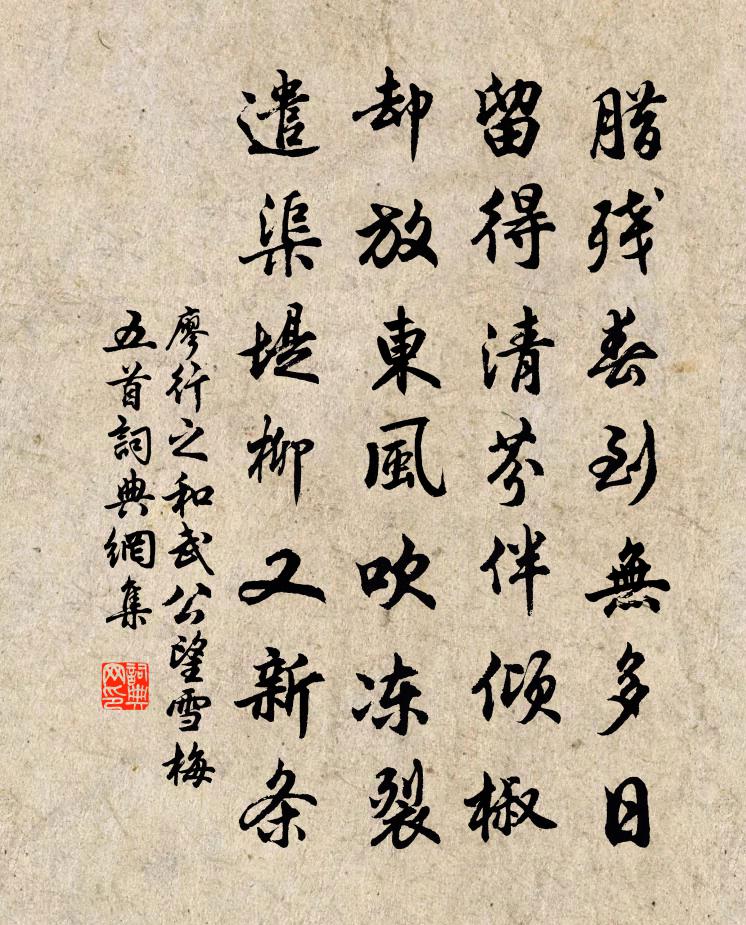 詩詞名句歷史字典書法欣賞書法字典國語詞典說文解字康熙字典古漢語字典標 題 作 者 詩 句 和武公望雪梅五首作者:廖行之 朝代:宋代和武公望雪梅五首原文臘殘春到無多日,留得清芬伴傾椒。卻放東風吹凍裂,遣渠堤柳又新條。詩詞問答問:和武公望雪梅五首的作者是誰?答:廖行之問:和武公望雪梅五首寫於哪個朝代?答:宋代廖行之和武公望雪梅五首書法欣賞和武公望雪梅五首書法作品詩詞推薦祀馬將軍竹枝辭馬之純〔宋代〕麥隴桑疇溪路斜,溪南溪北自千家。當年戰守知誰力,好把寒泉薦菊花。兜率寺作林憲〔宋代〕歸雲薄如霧,徐行江上山。徘徊印松竹,輕風約之還。悠然渡江去,余影猶闌斑。白鳥更自在,幾點落遠灘。送張十八歸桐廬劉長卿〔唐代〕歸人乘野艇,帶月過江村。正落寒潮水,相隨夜到門。白鷺白居易〔唐代〕人生四十未全衰,我為愁多白髮垂。何故水邊雙白鷺,無愁頭上亦垂絲?滿江紅(丁巳中秋)劉克莊〔宋代〕說與行雲,且撋就、嫦娥今夕。俄變見、金蛇能紫,玉蟾能白。九萬里風清黑眚,三千世界純銀色。想天寒、桂老再游南華臨出門書記妙瑩獻絕句索留題賦兩篇曾豐〔宋代〕詩數江西派,禪歸嶺表宗。他寧無出手,終莫敢當鋒。欠子廣長舌,資吾磊塊胸。打包隨牒跡,豈料適相逢。春日遣興二首張耒〔宋代〕流光向老惜芳菲,搔首悲歌心事違。綠野染成延晝永,辭紅吹盡放春歸。荊榛廢苑人閒牧,風雨空城烏夜飛。斷送九月八日類試別所與同事飲而痁作魏了翁〔宋代〕彼顓氏子太鴟張,藥裹丹瓢為汝忙。堆案文書埋白日,閉門風雨厄重陽。酒嘗友我胡為崇,菊亦愁余未肯黃。閒玩趙待制輓詞樓鑰〔宋代〕詩近劉賓客,手追歐率更。雙旌古良吏,萬卷老書生。世諦浮雲薄,生緣曉夢驚。吁嗟東向議,何日遂施行。石魚湖上醉歌元結〔唐代〕石魚湖,似洞庭,夏水欲滿君山青。山為樽,水為沼,酒徒歷歷坐洲島。長風連日作大浪,不能廢人運酒舫。我持至邑有感二首趙蕃〔宋代〕老稚歡呼南北街,爭看前日令君來。看花不比玄都觀,儘是當時手自栽。即事陸游〔宋代〕生來骨相本酸寒,天遣沙頭把釣竿。但稱山人擫耳帽,敢希楚客切雲冠。李參政生日二首魏了翁〔宋代〕湖淺霜雁寒,天高老龍蟄。悠悠瀛海間,時運遞訊息。黃鐘一龠回,槁瘁亦敷澤。茹茅趣連征,墐戶同一辟。向來馬詩二十三首·其十七李賀〔唐代〕白鐵銼青禾,砧間落細莎。世人憐小頸,金埒畏長牙。月華清(憶別)馬子嚴〔宋代〕瑟瑟秋聲,蕭蕭天籟,滿庭搖落空翠。數遍丹楓,不見葉間題字。人何處、千里嬋娟,愁不斷、一江流水。遙睇。三游洞陳岩〔宋代〕清風披拂蘚苔痕,洞裡仙鄉萬古春。有路盡通塵世客,來游何獨是三人。和史君喜雨周南〔宋代〕百萬疲氓飢欲啼,陰靈一夕靡雲旗。谷芒綠潤沾天澤,梅子黃肥帶雨時。薄宦經時誰舉手,豐年重見且信眉。諸生寄文浩百法(間欲擁毳參禪)齊己〔唐代〕當時六祖在黃梅,五百人中眼獨開。入室偈聞傳絕唱,升堂客謾恃多才。鐵牛無用成真角,石女能生是聖胎。聞說夢中作游山絕句陸游〔宋代〕霜風吹帽江村路,小蹇迢迢委轡行。忽到雲山幽絕處,穿林啼鳥不知名。墨梅林季仲〔宋代〕一枝炯炯照人寒,絕似溪橋立馬看。只恐春風解相怨,漏他訊息入毫端。名句推薦時光只解催人老,不信多情,長恨離亭,淚滴春衫酒易醒。晏殊《採桑子·時光只解催人老》 殘酒憶荊高,燕趙悲歌事未消。陳維崧《南鄉子·邢州道上作》 松樹千年終是朽,槿花一日自為榮。白居易《放言五首·其五》 圓魄上寒空,皆言四海同。李嶠《中秋月二首·其二》 殊方日落玄猿哭,舊國霜前白雁來。杜甫《九日五首·其一》 上窗風動竹,月微明。呂渭老《小重山·七夕病中》 合意客來心不厭,知音人聽話偏長。馮夢龍《警世通言·卷一》 文豈有常體,但以有體爲常李大師、李延壽《南史·列傳·卷三十二》 林斷山明竹隱牆。亂蟬衰草小池塘。蘇軾《鷓鴣天·林斷山明竹隱牆》 望斷金馬門,勞歌采樵路。孟浩然《田園作》