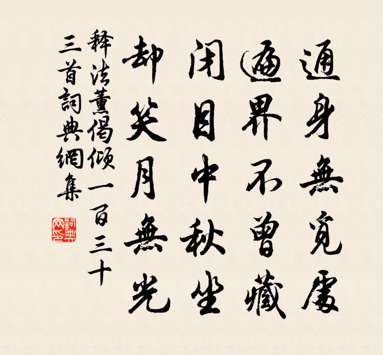 詩詞名句歷史字典書法欣賞書法字典國語詞典說文解字康熙字典古漢語字典標 題 作 者 詩 句 偈傾一百三十三首作者:釋法薰 朝代:宋代偈傾一百三十三首原文通身無覓處,遍界不曾藏。閉目中秋坐,卻笑月無光。詩詞問答問:偈傾一百三十三首的作者是誰?答:釋法薰問:偈傾一百三十三首寫於哪個朝代?答:宋代釋法薰偈傾一百三十三首書法欣賞偈傾一百三十三首書法作品詩詞推薦市橋間竹雞聲錢時〔宋代〕泥滑滑,向誰語,山南山北幽林裹。一朝籠入鬧廛中,猶自千聲萬聲不知止。爾勿呼,人憎汝。浣溪沙沈與求〔宋代〕花信催春入帝關。玉霙爭臘去留間。不禁風力又吹殘。客舍不眠清夜冷,縈愁一縷裊旃檀。空庭月落斗欄乾。雜題陸游〔宋代〕茆屋三間已太奢,柴乾米白喜無涯。非賢敢竊優賢祿,願折蓴絲與蕨芽。管順甫以湘竹為青奴兒貺為名湘夫人賦以謝之李曾伯〔宋代〕妾家淇園北封君,劂祖慈事宗蒼篔。子孫異代貞節聞,枝分一派從南巡。千古流落湘江濱,幾番雨露敷新榮。斑斑書范景山先丈逸事陳著〔宋代〕朅來范公亭,聞昔范老子。盛德自有銘,逸事有來紀。如彼沙匯墳,實葬外舅氏。累累冢十四,誰計後不祀。懷券湓江鄧林〔宋代〕遠樹一重重,煙村與市通。難尋元亮宅,遙酹菊花叢。蜀浪番牆外,廬山幾席中。何時邊事息,來此作漁翁。碧角簟曹松〔唐代〕細皮重疊織霜紋,滑膩鋪床勝錦茵。八尺碧天無點翳,一方青玉絕纖塵。蠅行只恐煙粘足,客臥渾疑水浸身。五月聖號雅二篇趙湘〔唐代〕皇振厥猷,法天以寧。我法我度,我經我營。或風或雨,或雷或霆。日月昭然,奮皇之明。霜肅以平,露澤以清。無諸策題問顏亡絕好軻沒無傳劉子翬〔宋代〕孔林黃玉花飛埃,一派淵源有自林。具體好時心似谷,厲辭傳處口如雷。聞聲儘是緇帷客,見色無非古市槐。卻訝種藥苗二首其一種甖粟蘇轍〔宋代〕三年杜門,莫適往還。幽人衲僧,相對忘言。飲之一杯,失笑欣然。我來潁川,如游廬山。出城送客,不及,步至溪上,二首蘇軾〔宋代〕春來六十日,笑口幾回開。會作堂堂去,何妨得得來。倦遊行老矣,舊隱賦歸哉。東望峨眉小,盧山翠作堆。建寧浦城李頻行祠周弼〔宋代〕建安梨岳老梨木,刻作唐朝建州牧。香爐忽動吹寒灰,浦城環翠陰風來。嶺頭頑石盡能走,澗下奔泉皆倒回。猿猱酬別杜二嚴武〔唐代〕獨逢堯典日,再睹漢官時。未效風霜勁,空慚雨露私。夜鍾清萬戶,曙漏拂千旗。並向殊庭謁,俱承別館追。斗城初至金陵蘇轍〔宋代〕山川過雨曉光浮,初看江南第一州。路繞匡廬更南去,懸知是處可忘憂。黃雀食新二首楊萬里〔宋代〕侯門信口總稱珍,只見陳人不見新。三日荔投香味變,況開醬瓿柫蛛塵。嘲教授徐用亨〔宋代〕誰把先生號冷官,令名深愧馥秋蘭。孟公豈是陳驚座,子夏元非杜小冠。涇渭合流雖若混,雲泥夐絕不相干。寄言歸長安許渾〔唐代〕三年何處淚汍瀾,白帝城邊曉角殘。非是無心戀巫峽,自緣□臂到長安。黔江水暖還曾飲,楚岫雲深不識寒。大抵滿江紅佚名〔宋代〕斗帳高眠,寒窗靜、瀟瀟雨意。南樓近、更移三鼓,漏傳一水。點點不離楊柳外,聲聲只在芭蕉里。也不管、滴破琴曲歌辭越裳操韓愈〔唐代〕雨之施,物以孳。我何意於彼為?自周之先,其艱其勤。以有疆宇,私我後人。我祖在上,四方在下。厥臨孔威,塵灰駱賓王〔唐代〕洛川流雅韻,秦道擅苛威。聽歌樑上動,應律管中飛。光飄神女襪,影落羽人衣。願言心未翳,終冀效輕微。名句推薦待人寬一分是福,利人實利己的根基。洪應明《菜根譚·概論》 痴心做處人人愛,冷眼觀時個個嫌。馮夢龍《喻世明言·卷三》 人生自是有情痴,此恨不關風與月。歐陽修《玉樓春·尊前擬把歸期說》 寄意寒星荃不察,我以我血薦軒轅。魯迅《自題小像》 記得去年今夕,釃酒溪亭,淡月雲來去。文徵明《念奴嬌·中秋對月》 天蒼蒼,野茫茫。風吹草低見牛羊。佚名《敕勒歌》 紅葉黃花秋意晚,千里念行客。晏幾道《思遠人·紅葉黃花秋意晚》 偶因一著錯,便為人上人。曹雪芹《紅樓夢·第二回》 情似遊絲,人如飛絮。淚珠閣定空相覷。周紫芝《踏莎行·情似遊絲》 漠漠帆來重,冥冥鳥去遲。韋應物《賦得暮雨送李胄 / 賦得暮雨送李曹》