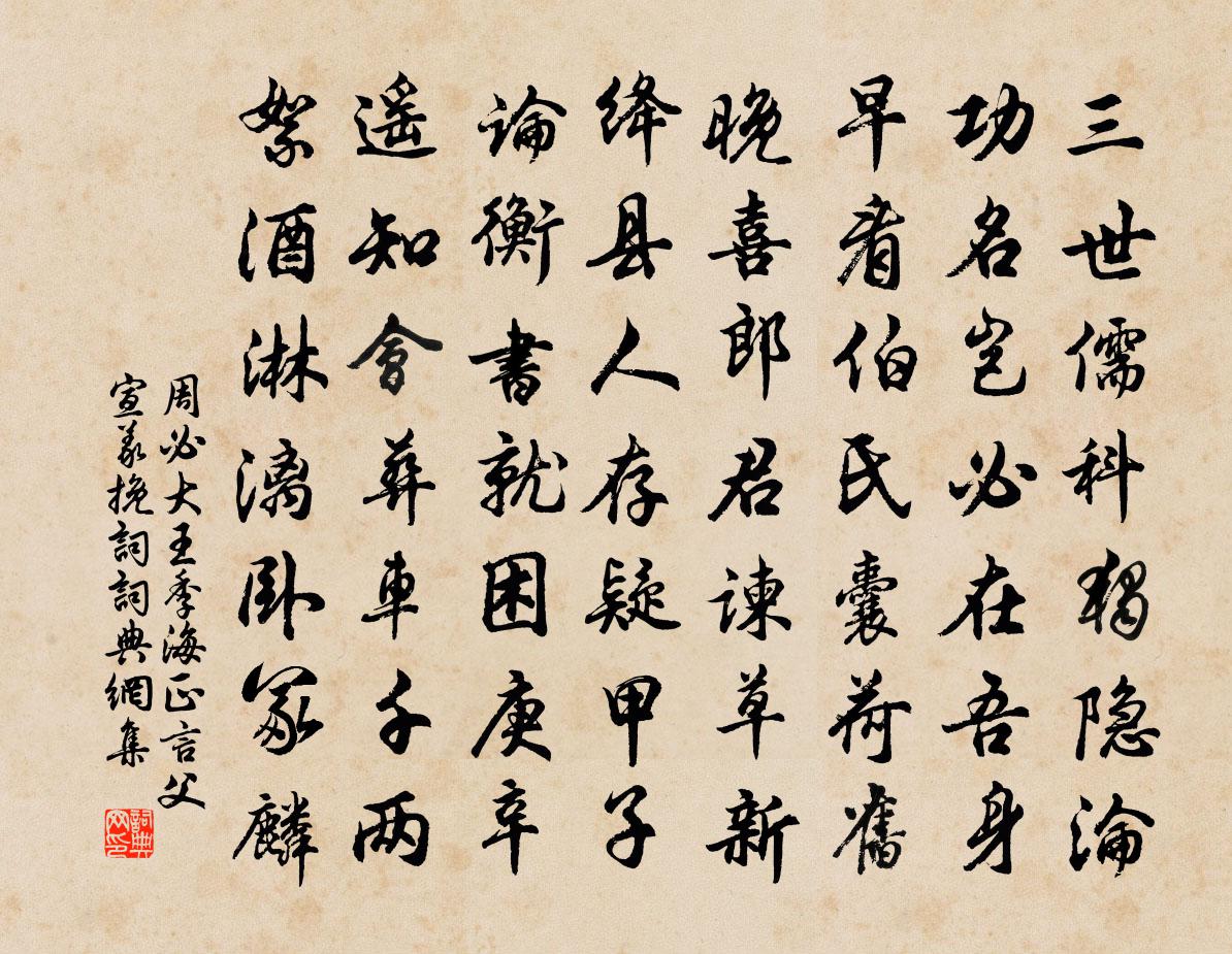 詩詞名句歷史字典書法欣賞書法字典國語詞典說文解字康熙字典古漢語字典標 題 作 者 詩 句 王季海正言父宣義輓詞作者:周必大 朝代:宋代王季海正言父宣義輓詞原文三世儒科獨隱淪,功名豈必在吾身。早看伯氏囊荷舊,晚喜郎君諫草新。絳縣人存疑甲子,論衡書就困庚辛。遙知會葬車千兩,絮酒淋漓臥冢麟。詩詞問答問:王季海正言父宣義輓詞的作者是誰?答:周必大問:王季海正言父宣義輓詞寫於哪個朝代?答:宋代周必大王季海正言父宣義輓詞書法欣賞王季海正言父宣義輓詞書法作品詩詞推薦別張袁州五首彭龜年〔宋代〕平生學不力,莫移資稟偏。疏愚寡周防,戇直絀巧諞。出身仕官府,何幸依仁賢。樸樕本無庸,刻畫幾成妍。江湖和江子我竹夫人晃沖之〔宋代〕黃籐白簟倦呼廬,高臥南窗示楷模。郭芍藥情元最密,鄭櫻桃變近相疏。下帷度日甘同夢,陶幾冬年得異書。晚向清明雨中趙處澹〔宋代〕竹繞清渠長嫩蒲,數聲村角晚吹梧。山家最怕清明雨,打落殘花一片無。贈朗上人王之道〔宋代〕淨剃霜髭展舊真,自疑容貌是前身。僧中獨守三千戒,詩里閒銷七十春。僻寺蘇深人到少,故山雲好夢歸頻。禪齋西江月佚名〔宋代〕瓊沼融成沆瀣,冰檐滴盡真珠。一園草木氣方蘇。又學楊花飛舞。何必亂飄密灑,卻疑細糝輕鋪。誰將粉墨畫成圖陪始平公燕柳溪司馬光〔宋代〕溪光不動柳風輕,玉帳森沈擁萬兵。鷗入煙中閒自舞,魚翻波面喜相迎。樓船下視晴天碧,鼓吹前驅遠陌清。桃李昔昔鹽二十首。那能惜馬蹄趙嘏〔唐代〕雲中路杳杳,江畔草淒淒。妾久垂珠淚,君何惜馬蹄。邊風悲曉角,營月怨春鼙。未道休徵戰,愁眉又復低。蘇幕遮 丹陽祠堂王處一〔元代〕彥明姜,鍾子政。文舉先生,三友於中省。各發丹誠用得正。助闡玄門,轉化昌陽境。玉陽王,為袖領。外誘諸公句王琪〔宋代〕煙徑掠花飛遠遠,曉窗驚夢語匆匆。酒醒彭龜年〔宋代〕世間顛倒事,一切自酒出。醒時清明心,醉後不可覓。醉時顛倒苗,或發醒時實。酒能醉人形,不能醉人心。心儻青玉案 戊戌元元宵客京師賦張野〔元代〕千門夜色霏香霧。又春滿、朝天路。回首舊遊誰與語。金波影里,水晶簾下,總是關心處。征衫著破愁成縷。留滯句程師孟〔宋代〕高城落日龍吟角,遠水浮煙蜃吐樓。玉樓春毛滂〔宋代〕壓玉為漿麟作。珠樹瓊葩長不謝。翠簾繡暖燕歸來,寶鴨花香蜂上下。沙堤佩馬催公駕。月白風清天不夜。重來雜劇·包待制陳州糶米佚名〔元代〕楔子(沖末扮范學士領祗候上,詩云)博覽群書貫九經,鳳凰池上顯崢嶸。殿前曾獻昇平策,獨占鰲頭第一名。老送簡棲上人之建州覲使君舅皎然〔唐代〕亂峰江上色,羨爾及秋行。釋氏推真子,郗家許貴甥。氎花新雨淨,帆葉好風輕。千里依元舅,回潮亦有情。晚秋郊居八首趙蕃〔宋代〕梨棗熟時須一雨,江南底忽類中州。南人不識北人事,懍懍已懷禾黑憂。敘州弟輓詩魏了翁〔宋代〕人物寂寥甚,天心分付誰。御戎傷畜縮,講學病支離。吏橫民重足,時危命一絲。若人天亦靳,撫事轉傷悲。春日絕句陸游〔宋代〕故園蛺蠂最多種,百草長時花亂開。窮巷春風元不到,一雙誰遣過牆來?竹溪再和余亦再作劉克莊〔宋代〕掇英可以忘憂,採薇可以求仁。忙殺遮西日客,愧死攫白晝人。轎中坐睡朱翌〔宋代〕飽食登長道,箯輿枕臂眠。鼻間真栩栩,腹外亦便便。徒倚兩竿竹,咍台四仆肩。忽然成小憩,放手即醒然。名句推薦女子今有行,大江溯輕舟。韋應物《送楊氏女》 士君子立言,貴平正,尤貴精詳。王永彬《圍爐夜話·第二五則》 丈夫貧賤應未足,今日相逢無酒錢。高適《別董大二首》 一念開明,反身而誠王陽明《傳習錄·卷中·答陸原靜書》 落花夜雨辭寒食。塵香明日城南陌。吳文英《菩薩蠻·落花夜雨辭寒食》 黃昏寒立更披襟,露浥清香悅道心。司空圖《白菊雜書四首》 爽口物多終作疾,快心事過必為殃。馮夢龍《喻世明言·卷三》 中心愿,平虜保民安國。宋江《滿江紅·喜遇重陽》 偷彈清淚寄煙波,見江頭故人,為言憔悴如許。袁去華《劍器近·夜來雨》 翠華想像空山里,玉殿虛無野寺中。杜甫《詠懷古蹟五首·其四》