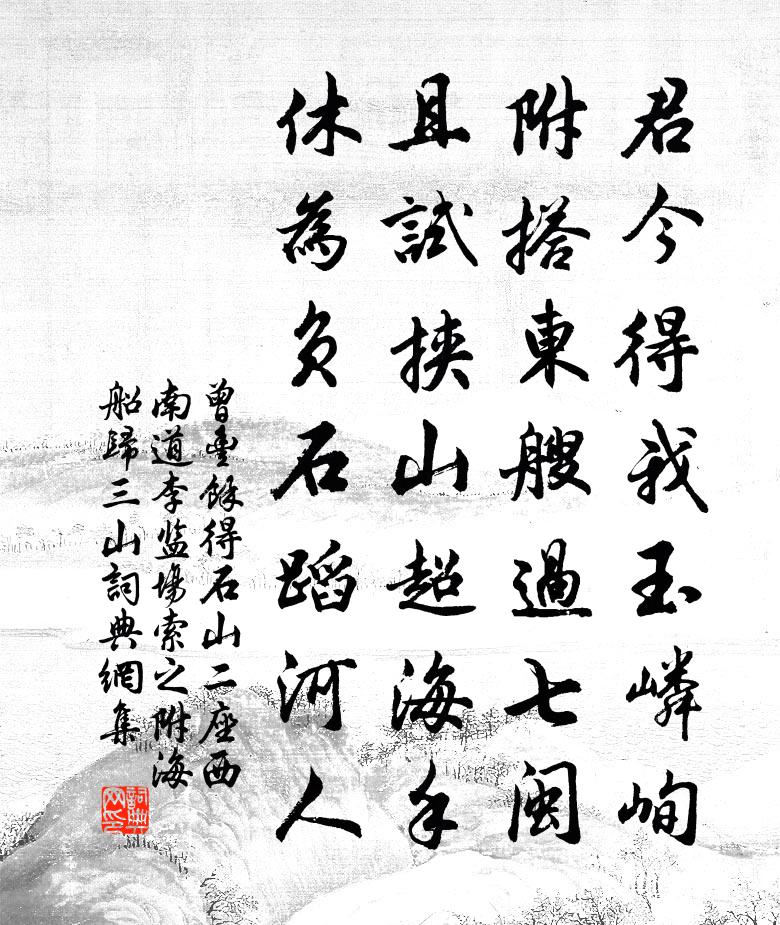 詩詞名句歷史字典書法欣賞書法字典國語詞典說文解字康熙字典古漢語字典標 題 作 者 詩 句 余得石山二座西南道李監場索之附海船歸三山作者:曾豐 朝代:宋代原文君今得我玉嶙峋,附搭東艘過七閩。且試挾山超海手,休為負石蹈河人。詩詞問答問:《余得石山二座西南道李監場索之附海船歸三山》的作者是誰?答:曾豐問:該詩寫於哪個朝代?答:宋代書法欣賞余得石山二座西南道李監場索之附海船歸三山書法作品詩詞推薦雨中花(七夕)楊無咎〔宋代〕漠漠雲輕,涓涓露重,西風特地颼颼。覺良宵初永,袢暑微收。乘鶴緱山,浮槎銀漢,尚想風流。笑人間兒戲,瓜送喻叔奇工部知處州楊萬里〔宋代〕厭直含香與握蘭,一麾江海泝冰灘。括蒼山水名天下,工部風煙入筆端。新國小遲懷印綬,故園暫許理漁竿。即看野興陸游〔宋代〕水作縠紋微起伏,天如卵色半陰晴。偶來竹下搘頤坐,卻向藤陰曳杖行。西埭人喧荻船過,東村燈上緯車鳴。幽居句葉祐之〔宋代〕木葉臨風皆好色,稻田流水亦新聲。送張無夢歸天台山馬知節〔宋代〕暫至朝真主,卻思歸舊峰。只依三事布,唯有一枝筇。月上當孤室,風生自古松。陰功從此滿,何處覓遺蹤。道中寄同舍孫應時〔宋代〕風聲卷蘆竹,雪意滿江天。水落石可數,沙寒鷗自眠。回頭渺城郭,留眼寄山川。老去重來否,吟餘一惘然。偈頌六十七首釋原妙〔宋代〕工夫不到不方圓,寬著程途急著鞭。但得此心常不昧,從教滄海變桑田。金牛道中李新〔宋代〕龍鱗鳳翼阻騰驤,仰首青雲自涉茫。漢月滿衣諳客思,巴音側耳覺吾鄉。金牛有路通秦惠,籌筆無功愧蜀王。只笑句劉鏜〔宋代〕月下有聞思望市,山中無曲舞胎仙。試中和節詔賜公卿尺詩陸復禮〔唐代〕春仲令初吉,歡娛樂大中。皇恩貞百度,寶尺賜群公。欲使方隅法,還令規矩同。捧觀珍質麗,拜受聖恩崇。如荷周元特詹事輓詞二首韓元吉〔宋代〕道學尊閭里,衣冠見偉人。雞群真野鶴,麕角目祥麟。讜論追前輩,清時識諍臣。他年激貧懦,風動霅溪濱。送任壽朋赴襄陽令項安世〔宋代〕際天南北{左麥右來}麰盛,夾漢東西巘崿長。為客曾夸心膽壯,送君令嘆鬢毛蒼。五官置屬蓮成匯,七校屯兵柳偈頌一百六十首釋宗杲〔宋代〕今朝十月旦,為君重衍算。兩個五日文,地來是一貫。頂門具眼人,記取這公案。八月上弦夕鄭清之〔宋代〕輕風熨貼晚雲開,為放中秋半月來。待得月圓多值雨,不如今夕共樽罍。題旅舍壁陸游〔宋代〕老子殘年未易量,出門隨處得彷徉。窗欞日淡僧房暖,灶突煙青旅甑香。濁酒可求敲野店,舊題猶在拂頹牆。閒來和傅大農與僚故別詩鮑照〔南北朝〕絕節無緩響。傷鴈有哀音。非同年歲意。誰共別離心。伊昔謬通塗。冠屣預人林。浮江望南嶽。登潮窺海陰。孰謂小江陸游〔宋代〕出郭四十里,孟冬天尚和。風生帆力健,木落月明多。小市人聲散,長橋炬火過。吾生幾來往,撫枕獨悲歌。鷓鴣天·博山寺作辛棄疾〔宋代〕不向長安路上行。卻教山寺厭逢迎。味無味處求吾樂,材不材間過此生。寧作我,豈其卿。人間走遍卻歸耕。一松癸酉歲元日中書致齋感事晏殊〔宋代〕一葉春王拆瑞筇,八齋西省夕香濃。多年不宿金閨署,半夜再聞長樂鍾。卻展舊編探史漢,更慚高步接夔龍。十思奉和翁文堯員外文秀、光賢、晝錦之什黃滔〔唐代〕鄉名里號一朝新,乃覺台恩重萬鈞。建水閩山無故事,長卿嚴助是前身。清泉引入旁添潤,嘉樹移來別帶春。莫憑名句推薦池上憑闌愁無侶。奈此個、單棲情緒。柳永《甘草子·秋暮》 凡事之本,必先治身呂不韋《呂氏春秋·紀·季春紀》 日射人間五色芝,鴛鴦宮瓦碧參差。元好問《浣溪沙·日射人間五色芝》 水滿田疇稻葉齊,日光穿樹曉煙低。徐璣《新涼》 懷家寒食夜,中酒落花天。趙長卿《臨江仙·暮春》 秋雨一何碧,山色倚晴空。方岳《水調歌頭·平山堂用東坡韻》 今人不見古時月,今月曾經照古人。李白《把酒問月·故人賈淳令予問之》 但夢想、一枝瀟灑,黃昏斜照水周邦彥《花犯·小石梅花》 塞垣多少思歸客,留著長條贈遠遊。朱栴《官橋柳色》 不要人夸好顏色,只留清氣滿乾坤。王冕《墨梅》