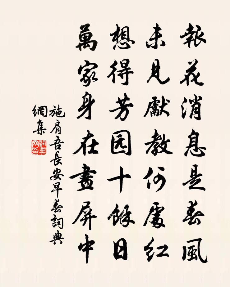 詩詞名句歷史字典書法欣賞書法字典國語詞典說文解字康熙字典古漢語字典標 題 作 者 詩 句 長安早春作者:施肩吾 朝代:唐代長安早春原文報花訊息是春風,未見先教何處紅。想得芳園十餘日,萬家身在畫屏中。詩詞問答問:長安早春的作者是誰?答:施肩吾問:長安早春寫於哪個朝代?答:唐代問:長安早春是什麼體裁?答:七絕施肩吾長安早春書法欣賞長安早春書法作品注釋全唐詩:卷494-135詩詞推薦六月郡庠尊經閣前種竹三得雨書喜示同舍黎廷瑞〔宋代〕移種來數日,三沾沛雨恩。雷公念同族,龍伯愛諸孫。鞭活金髯走,梢寒翠鬣翻。拂雲吾所望,好為護霜根。七不堪詩七首宋祁〔宋代〕六不堪,不樂俗人共。聒聒沸蟈集,紛紛臭孥眾。寓居南軒朱槔〔宋代〕雲氣披猖月意孤,冬青倒影上庭隅。燈橫老薺蛾方法,書掩新芸蠹已無。一世盡知關魯酒,十年不擬嘆齊竽。支頤山信至說平泉別墅草木滋長地轉幽深悵然思歸復此作李德裕〔唐代〕忽聞樵客語,暫慰野人心。幽徑芳蘭密,閒庭秀木深。麇麚來澗底,鳧鵠遍川潯。誰念滄溟上,歸歟起嘆音。東西京二絕蘇轍〔宋代〕親祀甘泉歲一終,屬車徐動不驚風。宓妃何預詞臣事,指點譏呵豹尾中。醉後作小草因成長句陸游〔宋代〕天教老去未全衰,猶欠縱橫萬首詩。家近將軍觴詠地,身如太史滯留時。酒翻銀浪紅螺醆,墨涌玄雲紫玉池。流落頭陀贊黃庭堅〔宋代〕梵語頭陀,華言抖擻。淨一真心,振三毒垢。如來親試,迦葉稱首。聖教推崇,哲人遵守。衣三食四,住處五名。雷州八首蘇軾〔宋代〕粵嶺風俗殊,有疾時勿藥。束帶趨房祀,用史巫紛若。弦歌薦繭栗,奴至洽觴酌。呻吟殊未已,更把雞骨灼。秋夜蘇泂〔宋代〕一點流螢自入扉,清風都向草頭吹。眠稀又被啼螿妒,看見新涼上小時。和子瞻自淨土步至功臣寺蘇轍〔宋代〕山平村塢連,野寺鐘相答。晚陰生林莽,落日猶在塔。行招兩社僧,共步青山月。送客渡石橋,迎客出林樾。幽尋日峰庵陳著〔宋代〕便道得幽尋,清風引入深。庵依山石腳,僧說老岩心。到處鬼無墓,此山松獨林。人生竟何事,搔首立青陰。次韻何學諭送行二首陳造〔宋代〕新詩念報答,呫囁未能書。落筆群英右,惟君一敵如。窮愁疎翰墨,客路費羲舒。延合青冥上,摩研正望渠。送陸務觀李石〔宋代〕近別已不易,遠別良更難。莫作遠近想,便覺宇宙寬。聚散與出處,等以道眼看。君去便鄉國,我留為親歡。吳蜀和潘經略廣州峽山五首釋寶曇〔宋代〕雲山最佳處,猿鳥無缺供。人影墮清鏡,花氣來晴峰。苔蘚上佛壁,兔絲蔓寒松。何年發天閟,當在浩劫中。天道吟邵雍〔宋代〕天道不雖知,人情未易窺。雖聞言語處,更看作為時。隱几功夫大,揮戈事業卑。春秋賴乘興,出用小車兒。頌古十七首釋道行〔宋代〕棒下血淋淋,真鍮不博金。鴛鴦親繡出,休更覓金針。題倪魯玉詩後二首劉克莊〔宋代〕自從風雅陵夷後,吟到梅村世豈多。曠達知章歸後作,軒昂予美醉時歌。擊蒙何止聞童稚,譴瘧猶堪去病魔。一聽暮春月內署書閣前海棠花盛開率爾七言八韻寄張洎〔宋代〕去歲海棠花發日,曾將詩句詠芳妍。今來花發春依舊,君已雄飛玉案前。驟隔清塵樞要地,獨攀紅蘂艷陽天。疏枝杭州送裴大澤赴廬州長史李白〔唐代〕西江天柱遠,東越海門深。去割慈親戀,行憂報國心。好風吹落日,流水引長吟。五月披裘者,應知不取金。次韻郭刪定觀潮四絕喻良能〔宋代〕天池潮汐渺難推,何事多盈亦有虧。生長濤淵頭縱白,問之訊息莫能知。名句推薦是節東籬菊,紛披為誰秀。杜甫《九日寄岑參》 終日望君君不至,舉頭聞鵲喜。馮延巳《謁金門·風乍起》 便做春江都是淚,流不盡,許多愁。秦觀《江城子·西城楊柳弄春柔》 輕則寡謀,驕則無禮。左丘明《國語·周語·王孫滿觀秦師》 凡知說,有益於理者,為之;無益於理者,舍之。荀子《荀子·儒效》 乍咽涼柯,還移暗葉,重把離愁深訴王沂孫《齊天樂·蟬》 新妝宜面下朱樓,深鎖春光一院愁。劉禹錫《和樂天春詞 / 春詞》 榮非己莫恃,禍惟他勿縱。來俊臣《羅織經·瓜蔓卷第十二》 支離東北風塵際,漂泊西南天地間。杜甫《詠懷古蹟五首·其一》 日光寒兮草短,月色苦兮霜白。李華《弔古戰場文》