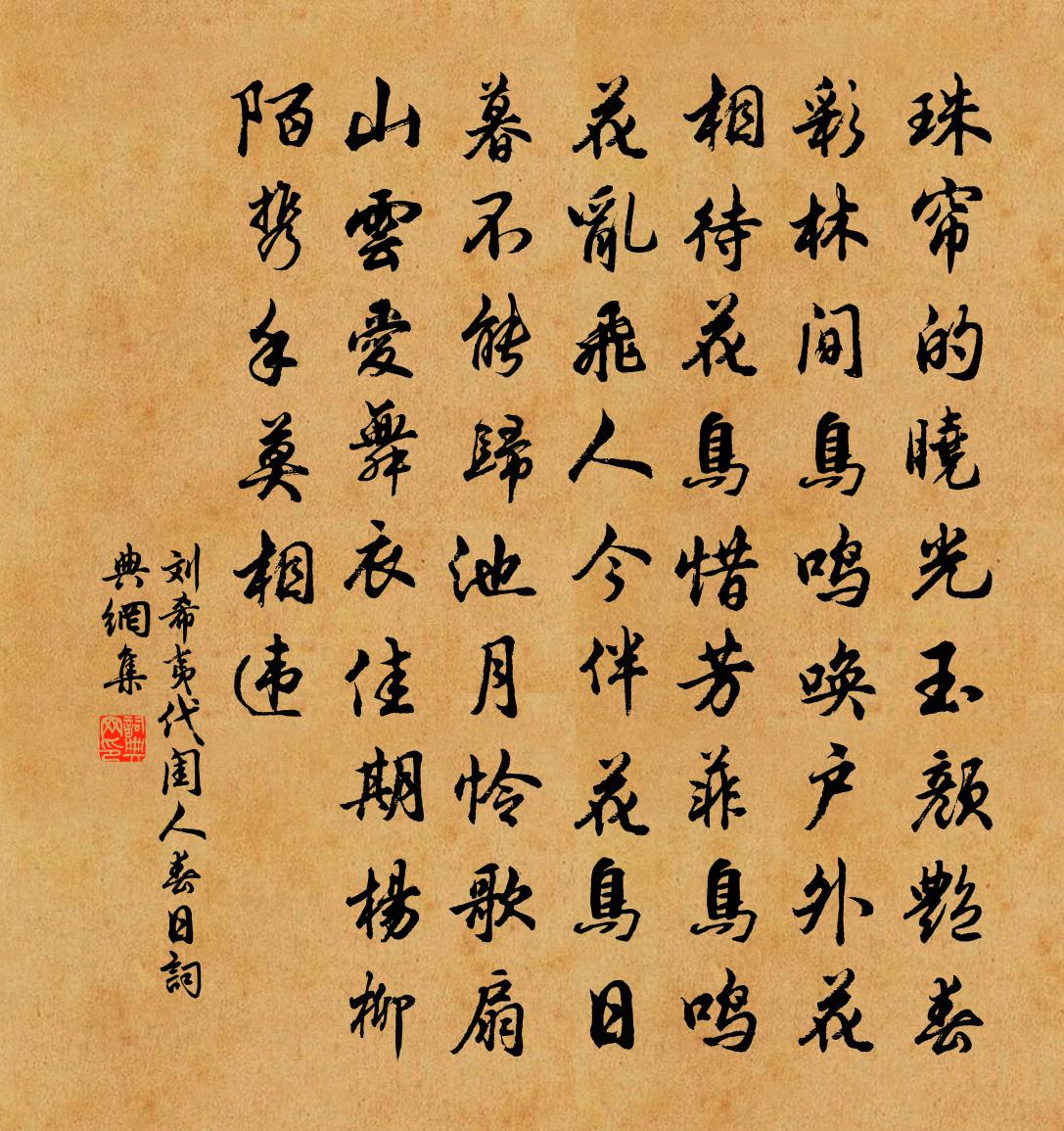 詩詞名句歷史字典書法欣賞書法字典國語詞典說文解字康熙字典古漢語字典標 題 作 者 詩 句 代閨人春日作者:劉希夷 朝代:唐代代閨人春日原文珠簾的曉光,玉顏艷春彩。林間鳥鳴喚,戶外花相待。花鳥惜芳菲,鳥鳴花亂飛。人今伴花鳥,日暮不能歸。池月憐歌扇,山雲愛舞衣。佳期楊柳陌,攜手莫相違。詩詞問答問:代閨人春日的作者是誰?答:劉希夷問:代閨人春日寫於哪個朝代?答:唐代問:代閨人春日是什麼體裁?答:五排劉希夷代閨人春日書法欣賞代閨人春日書法作品注釋全唐詩:卷82_11詩詞推薦偈五首釋覺阿上〔宋代〕航海來探教外傳,要離知見脫蹄筌。諸方參遍草鞋破,水在澄潭月在天。戊子六月十三日曝書得史院賜筆感懷晁補之〔宋代〕君王孝悌纂修意,丞相忠良典領宜。卻恨身為周柱史,不令人識漢官儀。當年請郡新進笑,今日曝書陳跡迷。猶有秀州道中游九言〔宋代〕一春煙雨歇空濛,高下川原杳靄中。畢竟春光遮不得,滿村花柳自青紅。華之高壽魯齋先生七十金履祥〔宋代〕有車班班,有來自東。子曰予耄,落此新宮。靜坐偶成舒岳祥〔宋代〕作意投床寐不熟,嗒然隱几睡偏安。從來萬事無心好,心到無心自是難。點絳唇(國香蘭)王十朋〔宋代〕芳友依依,結根遙向深林外。國香風遞。始見殊蕭艾。雅操幽姿,不怕無人采。堪紉佩。靈均千載。九畹遺芳在。秋晴張嵲〔宋代〕時事任從兒輩說,新詩誰得老夫降。鬼名罷檢秋堂靜,臥看風枝動晚窗。沁園春陳人傑〔宋代〕何如爾。杜子美平生困躓不偶,而嘆老羞卑之言少,愛君憂國之意多,可謂知所愁矣。若於著衣吃飯,一一未能忘送高學士知越錢惟演〔宋代〕粉署為郎鬢雪侵,酒酣風駛惜分襟。雲迷水館春旗潤,樹繞山城暝角深。下擔掛鈎傳密意,渡江桃葉聽遺音。孤鶯宿新安村步王貞白〔唐代〕淅淅寒流漲淺沙,月明空渚遍蘆花。離人偶宿孤村下,永夜聞砧一兩家。漢武帝於宮中宴西王母曹唐〔唐代〕鰲岫雲低太一壇,武皇齋潔不勝歡。長生碧字期親署,延壽丹泉許細看。劍佩有聲宮樹靜,星河無影禁花寒。秋風玉樓春(海棠)王詵〔宋代〕錦城春色花無數。排比笙歌留客住。輕寒輕暖袷衣天,乍雨乍晴寒食路。花雖不語鶯能語。莫放韶光容易去。海棠題薛公肅問梅圖李石〔宋代〕湖風吹衣筇九節,瘦如梅花骨欲折。詩魂別後誰與招,獨立西湖樹邊月。沁園春(弄溪賦)辛棄疾〔宋代〕有酒忘杯,有筆忘詩,弄溪奈何。看縱橫斗轉,龍蛇起陸,崩騰決去,雪練傾河。裊裊東風,悠悠倒景,搖動雲山往復無間釋重顯〔宋代〕禺中巳,荊棘園林遍大地。南北東西卒未休,金剛焰復從何起。朝中措 與石子璋別,求作樂府,得麻字元好問〔金代〕驚弦裂石筆生華。清興入悲笳。為愛南山夜獵,笑人杜曲桑麻。高歌醉眼,千金駿馬,八月仙槎。都把平生湖海,頌證道歌證道歌釋印肅〔宋代〕我師得見然燈佛,歷劫有為從此沒。心心相印了無生,為君幾下蒼龍窟。關試後筵上別同人杜荀鶴〔唐代〕日午離筵到夕陽,明朝秦地與吳鄉。同年多是長安客,不信行人慾斷腸。寄題周功父溪園三詠嫣然亭張栻〔宋代〕聞說亭花好,居然似蜀鄉。色深姿不俗,香淡意能長。高燭留深夜,輕陰護晚芳。何心較桃李,只擬答春光。鷓鴣天(壽叔祖母)廖行之〔宋代〕曾宴瑤池萬玉宮。鸞驂此日自從容。杓攜鶉首坤維外,歲在降婁虎坎中。生指李,壽方瞳。雲仍今有鵲巢風。傳家名句推薦千里鶯啼綠映紅,水村山郭酒旗風。杜牧《江南春》 江晚正愁予,山深聞鷓鴣。辛棄疾《菩薩蠻·書江西造口壁》 兼相愛,交相利。墨子《墨子·15章 兼愛(中)》 白髮悲花落,青雲羨鳥飛。岑參《寄左省杜拾遺》 如今但暮雨,蜂愁蝶恨,小窗閒對芭蕉展。呂渭老《薄倖·青樓春晚》 帶雨牡丹無氣力,黃鸝愁雨濕。汪莘《謁金門·簾漏滴》 女蘿發馨香,菟絲斷人腸。李白《古意》 謗書盈篋不復辯,脫身來看江南山。謝逸《送董元達》 獨上小摟春欲暮,愁望玉關芳草路。韋莊《木蘭花·獨上小樓春欲暮》 人心統耳目官骸,而於百體為君,必隨處見神明之宰王永彬《圍爐夜話·第十二則》