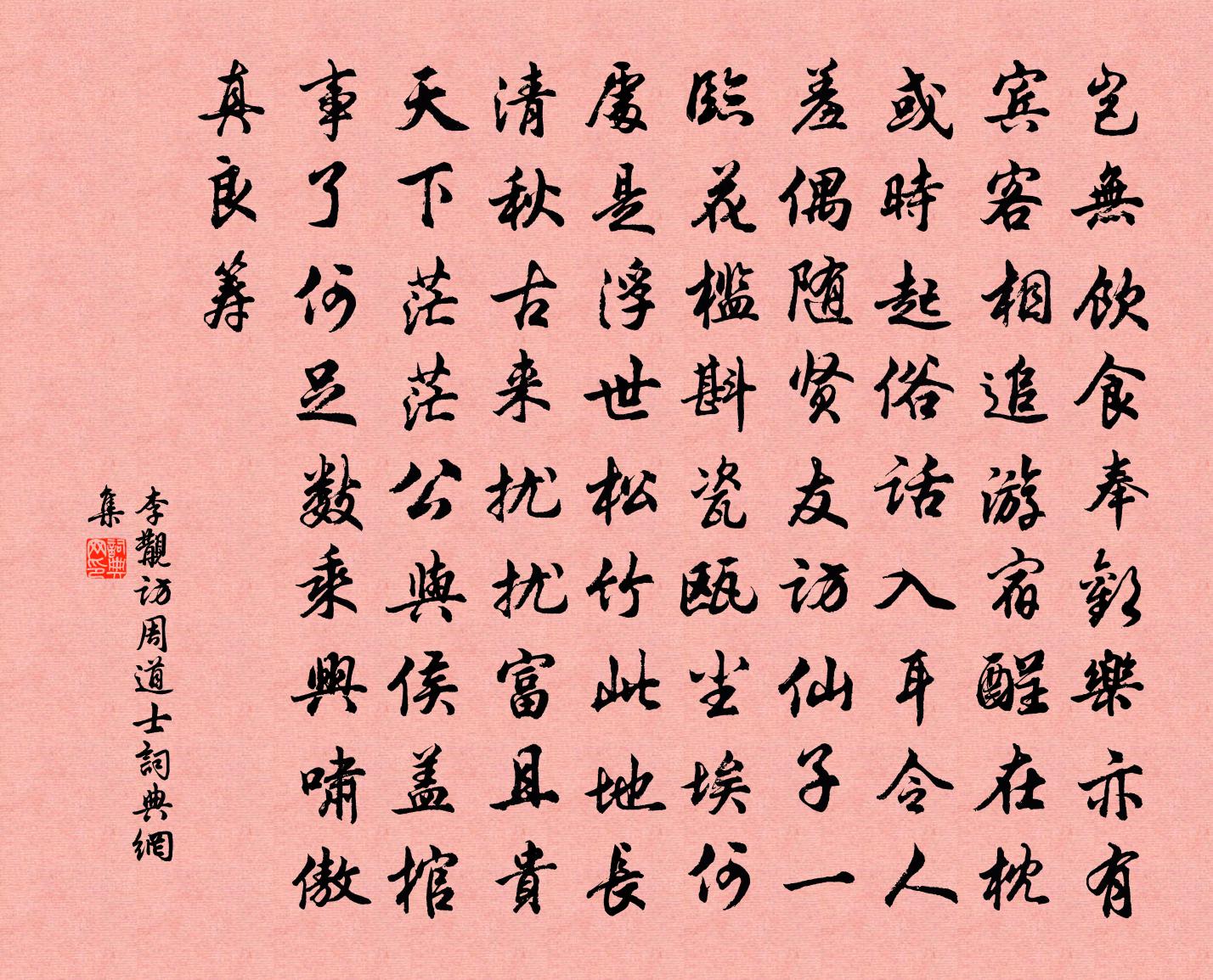 詩詞名句歷史字典書法欣賞書法字典國語詞典說文解字康熙字典古漢語字典標 題 作 者 詩 句 訪周道士作者:李覯 朝代:宋代訪周道士原文豈無飲食奉歡樂,亦有賓客相追游。宿酲在枕或時起,俗話入耳令人羞。偶隨賢友訪仙子,一臨花檻斟瓷甌。塵埃何處是浮世,松竹此地長清秋。古來擾擾富且貴,天下茫茫公與侯。蓋棺事了何足數,乘興嘯傲真良籌。詩詞問答問:訪周道士的作者是誰?答:李覯問:訪周道士寫於哪個朝代?答:宋代李覯訪周道士書法欣賞訪周道士書法作品詩詞推薦青玉案佚名〔宋代〕人生南北如歧路。世事悠悠等風絮。造化小兒無定據。翻來覆去,倒橫直豎,眼見都如許。伊周功業何須慕。不學惜奴嬌賀鑄〔宋代〕玉立佳人,韻不減、吳蘇小。賦深情、華年韶妙。疊鼓新歌,最能作、江南調。縹緲。似陽台、嬌雲弄曉。有客臨首尾吟邵雍〔宋代〕堯夫非是愛吟詩,詩是堯夫忖度時。先見固能無後悔,至誠方始有前知。已之欲處人須欲,心可欺時天可欺。只被菩薩蠻晁端禮〔宋代〕百花未報芳菲信。一枝探得春風近。只有雪爭光。更無花似香。孤標天賦與。冷艷誰能顧。庭院好深藏。莫教開路河上莫歸過南湖二絕蘇轍〔宋代〕西來白水滿南池,走馬池邊日落時。橋底荷花無限思,清香乞與路人知。淤田水淺客來遲,解舫都門問幾時。誰道家釀酒鄉四首曾幾〔宋代〕醉鄉即是無何有,歡伯相招歸去休。全以箇中為境界,更於底處覓溫柔。游荷溪西禪寺馬廷鸞〔宋代〕仿佛招提寄遠村,緇郎草草佛燈昏。水將綠繞縈如帶,山送青來列在門。句里風騷耆舊遠,胸中丘壑典刑存。滿懷望驛台 三月三十日白居易〔唐代〕靖安宅里當窗柳,望驛台前撲地花。兩處春光同日盡,居人思客客思家。木蘭花慢 龜溪寄張小山張雨〔元代〕問出山小草,誰與伴,五湖游。便憶昔風光,桃花流水,杜若芳洲。來時洞門無鎖,倩鶴群、長繞侍仙樓。邂逅小七月二日大風作一晝夜方止土人去此風潮信也張嵲〔宋代〕風潮初見土人云,始愧鯫生泥昔言。卻以所經疑柱史,著書應只為中原。題徐子比獨秀亭二首曾豐〔宋代〕之子於人第一流,于山也獨拔其尤。高亭未與山相稱,直起元龍百尺樓。正宮塞鴻秋 門前五柳侵江路鄭光祖〔元代〕門前五柳侵江路,莊兒緊靠著白萍渡。除彭澤縣令無心做,淵明老子達時務。頻將濁酒沽,識破興亡數。醉時節笑寄同年宗兄桐江府判去言五首方回〔宋代〕好山多處說嚴陵,官事閒時定一登。野寺豈無僧十百,愛僧須是愛詩僧。湖上觀釣顧逢〔宋代〕每見湖堤畔,持竿立柳陰。不多吞餌者,空起羨魚心。嚴瀨山林石,磻溪歲月深。何如池館上,倚檻看浮沉。多情(庚午年在桃林場作)韓偓〔唐代〕天遣多情不自持,多情兼與病相宜。蜂偷野蜜初嘗處,鶯啄含桃欲咽時。酒盪襟懷微駊騀,春牽情緒更融怡。水香同年楊謹仲教授生日周必大〔宋代〕伯起宜橫講殿經,若為臨賀復廬陵。朝來冠雀銜三鱣,敢賀先生自此升。臨江仙陳亮〔宋代〕五百年間非一日,可堪只到今年。雲龍欲化艷陽天。從來耆舊傳,不博地行仙。昨夜風聲何處度,典型猶在南山。次韻法觀送紅梅栽葛立方〔宋代〕羅襪初凌一水間,霜深應怯夜來寒。含章檐下渾冰雪,卻要騷人帶醉看。括酹江月林正大〔宋代〕問陶彭澤,有田園活計,歸來何晚。昨夢皆非今覺是,實迷途其未遠。松菊猶存,壺觴自酌,寄傲南窗畔。閒雲出送鐵佛專使釋重顯〔宋代〕荷策來尋我,泛舟思舊山。不知何處月,相照在深灣。風助秋濤急,雲兼野樹閒。到時如請益,先憶趙州關。名句推薦處事有何定憑,但求此心過得去王永彬《圍爐夜話·第三九則》 成事不說,遂事不諫,既往不咎。孔子弟子《論語·八佾篇》 春去秋來也,愁心似醉醺。歐陽炯《巫山一段雲·春去秋來也》 家家乞巧望秋月,穿盡紅絲幾萬條。林傑《乞巧》 終然獨不見,流淚空自知。李白《獨不見》 借與門前磐石坐,柳陰亭午正風涼。范成大《夏日田園雜興》 生年不滿百,常懷千歲憂。佚名《生年不滿百》 人生貴得適意爾,何能羈宦數千里以要名爵!劉義慶《世說新語·識鑒》 日日望鄉國,空歌白薴詞。張籍《薊北旅思 / 送遠人》 喜遇重陽,更佳釀今朝新熟。宋江《滿江紅·喜遇重陽》