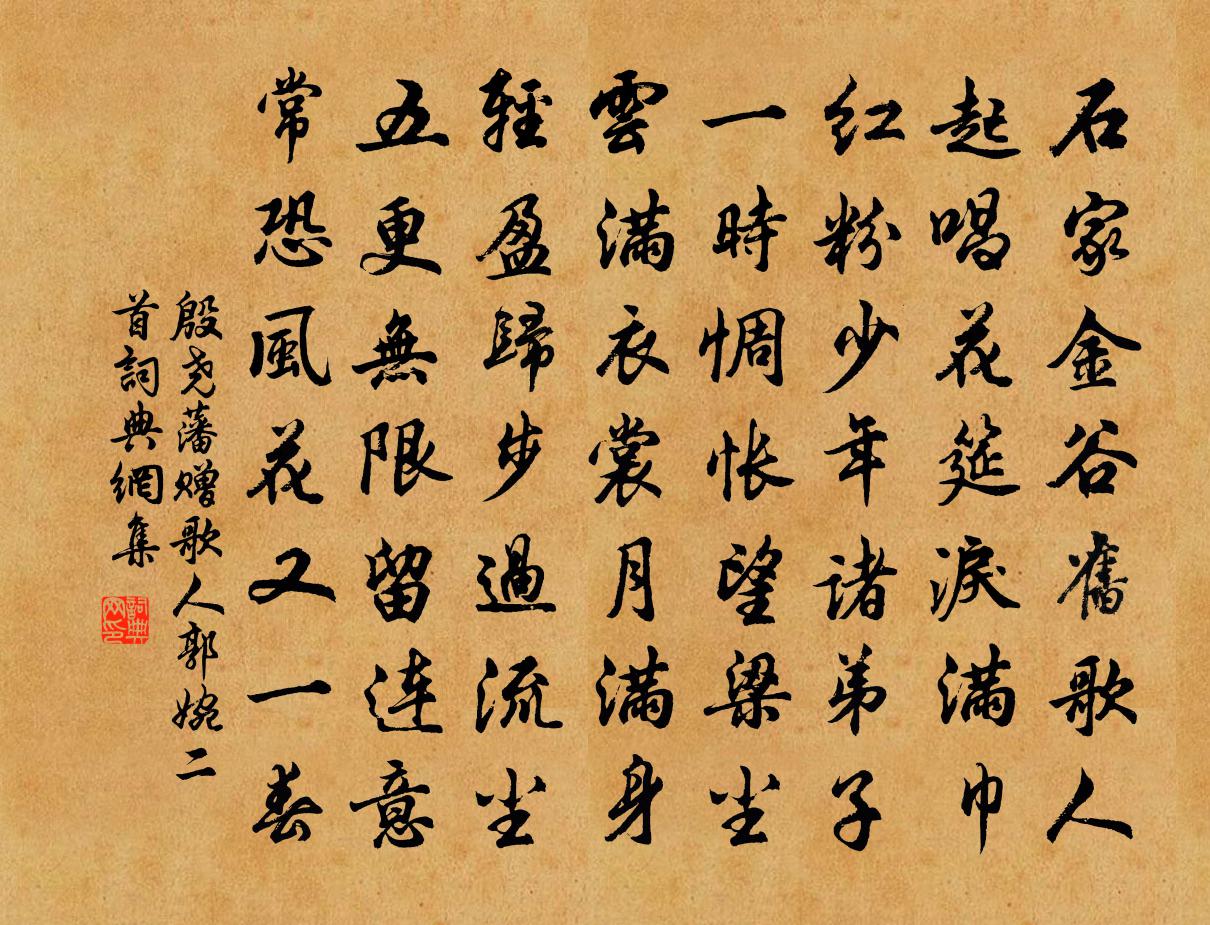 詩詞名句歷史字典書法欣賞書法字典國語詞典說文解字康熙字典古漢語字典標 題 作 者 詩 句 贈歌人郭婉二首作者:殷堯藩 朝代:唐代贈歌人郭婉二首原文石家金谷舊歌人,起唱花筵淚滿巾。紅粉少年諸弟子,一時惆悵望梁塵。雲滿衣裳月滿身,輕盈歸步過流塵。五更無限留連意,常恐風花又一春。詩詞問答問:贈歌人郭婉二首的作者是誰?答:殷堯藩問:贈歌人郭婉二首寫於哪個朝代?答:唐代問:贈歌人郭婉二首是什麼體裁?答:七絕殷堯藩贈歌人郭婉二首書法欣賞贈歌人郭婉二首書法作品注釋全唐詩:卷492-76詩詞推薦望海潮(揚州芍藥會作)晁補之〔宋代〕人間花老,天涯春去,揚州別是風光。紅藥萬株,佳名千種,天然浩態狂香。尊貴御衣黃。未便教西洛,獨占花王十一日簡王進之趙蕃〔宋代〕曉枕聞檐溜,閒筇立寺門。宿酲連卯酒,幽趣落無言。山色丹青濕,梅花璧玉溫。誰能此乘興,風味昔人存。懷宣州李司法鄭會〔宋代〕憶著宣城郡,能詩李法曹。秋今已過半,夢亦罕相遭。風葉亂無數,雨螢飛不高。獨來窗下坐,燈影照離騷。蓮亭朱景玄〔唐代〕回塘最幽處,拍水小亭開。莫怪闌乾濕,夜宿來。戲贈勤長老范成大〔宋代〕從君揮塵演金乘,我已無心纏葛藤。第一圓通三鼓夢,大千世界一窗燈。罷參柏子庭前意,權作梅花樹下僧。飯飽戲題鄧肅〔宋代〕我欲開樽百物無,鄰家酒熟各觴吾。扶杖出門又應供,三生恐是賓頭盧。追酬故高蜀州人日見寄杜甫〔唐代〕自蒙蜀州人日作,不意清詩久零落。今晨散帙眼忽開,迸淚幽吟事如昨。嗚呼壯士多慷慨,合沓高名動寥廓。嘆我丁酉皿月十日之官毗陵,舟行阻風,宿椆陂江楊萬里〔宋代〕蟲聲兩岸不堪聞,把燭銷愁且一尊。誰宿此船愁似我?船篷猶帶燭煙痕。元日觀百僚朝會包佶〔唐代〕萬國賀唐堯,清晨會百僚。花冠蕭相府,繡服霍嫖姚。壽色凝丹檻,歡聲徹九霄。御爐分獸炭,仙管弄雲韶。日照六月歸途徐璣〔宋代〕星明殘照數峰晴,夜靜惟聞水有聲。六月行人須早起,一天涼露濕衣輕。宦情每向途中薄,詩句多於馬上成。故里衰疾鄭獬〔宋代〕大夢為生固有涯,屢攻衰疾可驚嗟。時於耳竅嘯秋蚓,並向目睛飛黑花。門 * 羅同翟尉,座隅占鵩類長沙。支離揀花梅堯臣〔宋代〕紫絲暉粉綴蘚花,綠羅布葉攢飛霞。鶯舌未調香萼醉,柔風細吹銅梗斜。金鞍結束果下馬,低枝不礙無闌遮。長陵中秋月晏殊〔宋代〕一輪霜影轉庭梧,此夕羈人獨向隅。未必素娥無悵恨,玉蟾清冷桂華孤。村景陳與義〔宋代〕黃昏吹角聞呼鬼,清曉持竿看牧鵝。蠶上樓時桑葉少,水鳴車處稻苗多。句陳伯強〔宋代〕丈人論行輩,高出五嶽列。憶山中顧況〔唐代〕春還不得還,家在最深山。蕙圃泉澆濕,松窗月映閒。薄田臨谷口,小職向人間。去處但無事,重門深閉關。寄小王徐子晉華岳〔宋代〕十載長沙路二千,歸心日夜在長安。居家有譽眉空白,戀闕無謀心謾丹。獲雁不聞蘇子信,沐猴徒笑楚人冠。馬蹄踏莎行 寄京兆徐公譚處端〔元代〕方寸靈田,何曾拂掃。塵埃久暗生荒草。神泉散漫不凝澄,如何結得長生寶。雲水尋真,逍遙訪道。離家便是離煩再次韻三首陳造〔宋代〕俗塵我亦憐多病,道價師今重五天。投老鼎山追舊約,未妨林壑著臞仙。寓言劉克莊〔宋代〕生有縫春諷,死無封禪書。不須求大手,吾自表幽墟。名句推薦不見襄陽登覽,磨滅遊人無數,遺恨黯難收。陸游《水調歌頭·多景樓》 何日請纓提銳旅,一鞭直渡清河洛。岳飛《滿江紅·登黃鶴樓有感》 遙望洞庭山水色,白銀盤裡一青螺劉禹錫《望洞庭》 必得之事,不足賴也;必諾之言,不足信也。管仲《管子·形勢》 福善之門莫美於和睦,患咎之首莫大於內離。班固《漢書·傳·宣元六王傳》 能行之者未必能言,能言之者未必能行。司馬遷《史記·孫子吳起列傳》 漢家天子今神武,不肯和親歸去來。王之渙《涼州詞二首》 但箭雁沈邊,梁燕無主。劉辰翁《蘭陵王·丙子送春》 舉杯互敬屠蘇酒,散席分嘗勝利茶。 * 《元旦口占用柳亞子懷人韻》 百歲落半途,前期浩漫漫。李白《登敬亭山南望懷古贈竇主簿》