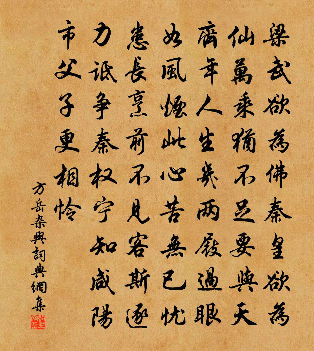 詩詞名句歷史字典書法欣賞書法字典國語詞典說文解字康熙字典古漢語字典標 題 作 者 詩 句 雜興作者:方岳 朝代:宋代雜興原文梁武欲為佛,秦皇欲為仙。萬乘猶不足,要與天齊年。人生幾兩屐,過眼如風煙。此心苦無已,憂患長烹前。不見客斯逐,力詆爭秦權。寧知鹹陽市,父子更相憐。詩詞問答問:雜興的作者是誰?答:方岳問:雜興寫於哪個朝代?答:宋代方岳雜興書法欣賞雜興書法作品詩詞推薦獄中學騷體盧照鄰〔唐代〕夫何秋夜之無情兮,皎皇悠悠而太長。目戶有其幽這兮。愁人披此嚴霜。見河漢之西落,聞鴻雁之南翔。山有佳兮句陶弼〔宋代〕陰微辨樵火,霽早誤僧鍾。游邊感懷二首張喬〔唐代〕貧游繚繞困邊沙,卻被遼陽戰士嗟。不是無家歸不得,有家歸去似無家。兄弟江南身塞北,雁飛猶自半年余。夜來出中新霽衛宗武〔宋代〕宿雨初收曉日升,晴川遠浸數峰青。西風一洗林巒翳,收拾秋容入畫屏。歲除即事十首劉克莊〔宋代〕聽得先生去,拋書喜欲顛。吾聞渥窪種,墮地不須鞭。亥月徐璣〔宋代〕亥月霜澄霽,幽窗晚更明。文書隨意閱,蘭菊與心清。洗硯須池暖,燃香得火輕。妻拿渾笑我,作計亦平平。贈回雪李群玉〔唐代〕回雪舞縈盈,縈盈若回雪。腰支一把玉,只恐風吹折。如能買一笑,滿斗量明月。安得金蓮花,步步承羅襪。病中詩十五首。送嵩客白居易〔唐代〕登山臨水分無期,泉石煙霞今屬誰。君到嵩陽吟此句,與教二十六峰知。誕日戲作亦可以瑞鷓鴣歌之姜特立〔宋代〕梅山誕日簇觥籌,更挾娉婷共勝游。此去只求閒富貴,人生須是老風流。長相思王之道〔宋代〕天四垂。山四圍。山色天容入坐帷。清風吹我衣。湖水東,江水西。東去西來無盡期。不如君共伊。和仲文西湖野步至新堰二首梅堯臣〔宋代〕決決堰根水,層層湖上田。寒魚猶著底,白鷺已發前。履惜春泥滑,衣從澀蔓牽。偶來成野望,歸興自留連。次韻分生五首陳著〔宋代〕詩筒狎至補前疏,快似西風卷峽初。一片襟懷誰似友,曾從仙李跨鯨魚。扇子詩李石〔宋代〕白團扇子白紗衣,怕見螢光作火吹。屈指西風明日是,會將束緼乞憐時。中峰林逋〔宋代〕中峰一徑分,盤折上幽雲。夕照前村見,秋濤隔嶺聞。長松含古翠,衰藥動微薰。自愛蘇門嘯,懷賢思不群。過淮陰縣題韓信廟,前用唐律,後用進退格楊萬里〔宋代〕來時月黑過淮陰,歸路天花舞故城。一劍光寒千古淚,三家市出萬人英。少年跨下安無忤,老父北邊愕不平。人物西園堂榭落成種植畢工偶成口號十首呈參政張周麟之〔宋代〕草木青歸二月天,川原明媚發春妍。臨流忽見寒梅影,皎若凌波洛浦仙。送郭乂雜言岑參〔唐代〕地上青草出,經冬今始歸。博陵無近信,猶未換春衣。憐汝不忍別,送汝上酒樓。初行莫早發,且宿霸橋頭。功名和陶歸園田居六首蘇軾〔宋代〕老人八十餘,不識城市娛。造物偶遺漏,同儕盡丘墟。平生不渡江,水北有幽居。手插荔支子,合抱三百株。莫言秋江辭張玉孃〔宋代〕煙迷浦口人跳稀,老松瘦竹橫斜暉。舟人鮒切葦羨美,竹葉香清蟹正肥。醉眠篷底呼下醒,一任春風吹髮影。起來西湖偶成謝雋伯〔宋代〕思遠樓西平嶼東,會昌湖上藕花風。水亭隔岸湘簾卷,人倚闌乾憶謝公。名句推薦今日江頭兩三樹,可憐和葉度殘春。元稹《離思五首》 長江一帆遠,落日五湖春。劉長卿《餞別王十一南遊》 令公桃李滿天下,何用堂前更種花。白居易《奉和令公綠野堂種花》 漠漠秋雲起,稍稍夜寒生。白居易《微雨夜行》 大丈夫相時而動。曹雪芹《紅樓夢·第四回》 知不知,上矣。過者之患,不知而自以為知。呂不韋《呂氏春秋·論·似順論》 樸實渾厚,初無甚奇,然培子孫之元氣者,必此人也。王永彬《圍爐夜話·第十九則》 無奈朝來寒雨,晚來風。李煜《相見歡·林花謝了春紅》 福來有由,禍來有漸。陳壽《三國志·吳書·吳主五子傳》 野蔬充膳甘長藿,落葉添薪仰古槐。元稹《遣悲懷三首·其一》