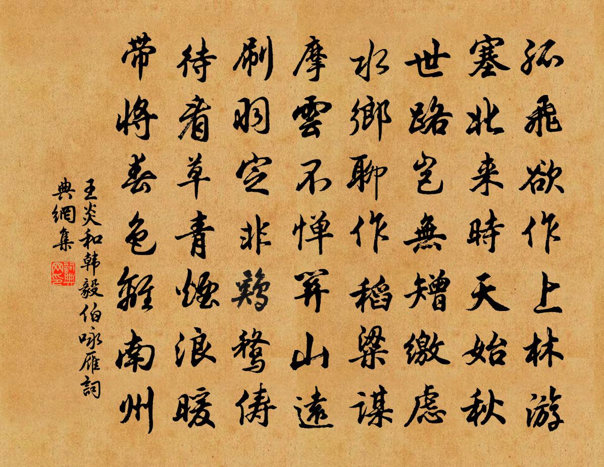 詩詞名句歷史字典書法欣賞書法字典國語詞典說文解字康熙字典古漢語字典標 題 作 者 詩 句 和韓毅伯詠雁作者:王炎 朝代:宋代和韓毅伯詠雁原文孤飛欲作上林游,塞北來時天始秋。世路豈無矰繳慮,水鄉聊作稻粱謀。摩雲不憚關山遠,刷羽定非雞鶩儔。待看草青煙浪暖,帶將春色離南州。詩詞問答問:和韓毅伯詠雁的作者是誰?答:王炎問:和韓毅伯詠雁寫於哪個朝代?答:宋代王炎和韓毅伯詠雁書法欣賞和韓毅伯詠雁書法作品詩詞推薦題金沙王安石〔宋代〕海棠開後數金沙,高架層層吐絳葩。咫尺西城無力到,不知誰賞魏家花。西林訪銛師陳造〔宋代〕天將宿雨淨春空,卻著湖山鼓吹中。載酒言辭藉花伴,運斤來看斲泥工。前身師定參寥子,拙宦吾今張長公。挽首酥中陳與義〔宋代〕醉中今古興衰事,詩里江湖搖落時。兩手尚堪杯酒用,寸心唯是鬢毛知。稽山擁郭東西去,禹穴生雲朝暮奇。萬里哭同年羅著作王禹偁〔宋代〕荒涼故宅何人住,寂寞孀妻即日還。一歲嬰兒安健否,巨源雖在謫深山。朝中措(莆中共樂台)趙師俠〔宋代〕斜陽留照有餘紅。煙靄淡冥濛。麥隴青搖一望,前山翠失雙峰。高台徙倚。松飄逸韻,梅減冰容。俯視塵寰如掌,池上近作假山引水穿石撒珠其上亦有可觀因成吳芾〔宋代〕終日塵勞困簿書,無因歸泛小西湖。且來池上看堆翠,更向峰前認撒珠。觸石有雲時點綴,隨風無雨自沾濡。老夫水龍吟(牡丹有感)陳著〔宋代〕好花天也多慳,放遲留做殘春主。豐肌弱骨,晴嬌無奈,新妝相妒。翠幕高張,玉闌低護,怕驚風雨。記年時、多逃暑小飲熟睡至暮陸游〔宋代〕桑落香浮槲葉杯,甘瓜綠李亦佳哉!虛堂頓解汗揮雨,高枕俄成鼻殷雷。靜聽風聲生檻竹,徐看日影轉庭槐。晚涼五雪詩用韻寓五字項安世〔宋代〕偪塞天星近,紛綸世事平。瘴消原谷長,蝗死岳芝生。徑合迷車轍,宵明誤鼓聲。絝寒空數挽,履綻莫深行。眼看減字木蘭花仇遠〔宋代〕雞兒畫曲。處處箏鳴雨屋。十載重遊。柳外啼烏也怨秋。粉楹醉墨。燕去樓空人不識。醉踏花陰。錯認人家月下門月夜贈項子謙蔡幼學〔宋代〕月色淨加水,奈此清興何。誰人當領此,隔屋呼項佗。駕言先我出,追隨費經過。履聲適相逢,歡然甜亭茶。乾坤惜黃花 重九日王哲〔元代〕萬紅憔悴。秋光獨銳。雖有番,顏色按,中央殊麗。時分惜黃花,九日同天意。冒濃霜。放開金蕊。籬畔淵明喜。賀新郎(次韻江定軒詠菊)馮取洽〔宋代〕句里思黃九。笑王郎、不奈寒芳,腰圍如柳。得似江郎饒雅趣,時攬黃花誑口。吐妙語、與之爭秀。閒繞珍從吟不相和歌辭。懊惱曲溫庭筠〔唐代〕藕絲作線難勝針,蕊粉染黃那得深。玉白蘭芳不相顧,倡樓一笑輕千金。莫言自古皆如此,健劍刜鍾鉛繞指。三秋送沈興宗察院出使湖南王安石〔宋代〕諫書平日皁囊中,朝路爭看一馬驄。漢節飽曾沖海霧,楚帆聊復借湖風。皇華命使今為重,直道酬君遠亦同。投老題宗室大年畫扇四首晁補之〔宋代〕西風入叢竹,慘澹帶秋陰。驚起中汦雁,衡陽萬里心。白髭行文天祥〔宋代〕憶昔守宣時,白上一根發。去之四五年,一化為七八。今年客衡湘,黑髭已多黃。眾黃忽一白,驚見如陵陽。白髮清心鏡 贈鐵李先生馬鈺〔元代〕隴西公,苦得別。六月爐頭,掉錘打鐵。養渾家、都要清閒,獨自受炙*。火燒瘡,汗滴血。萬苦千辛,何時是徹寄輔漢卿葛天民〔宋代〕憶殺平生輔漢卿,武夷山晨話寒更。不知新歲還家未,白髮衝冠有幾莖。紹興二十八年祀圜丘學士院〔宋代〕帝出於震,巽惟齊明。律日姑洗,以示潔清。我交於神,蠲意必精。既興而往,祈監斯誠。名句推薦三五年時三五月,可憐杯酒不曾消。黃景仁《綺懷》 記得別伊時,桃花柳萬絲。納蘭性德《菩薩蠻·新寒中酒敲窗雨》 相看兩不厭,只有敬亭山。李白《獨坐敬亭山》 名為虛,智者不計毀譽;利為上,愚者惟求良善。來俊臣《羅織經·制敵卷第五》 淡黃楊柳暗棲鴉。玉人和月摘梅花。賀鑄《減字浣溪沙·樓角初銷一縷霞》 曲闌深處重相見,勻淚偎人顫。納蘭性德《虞美人·曲闌深處重相見》 東風惆悵欲清明,公子橋邊沉醉。張泌《滿宮花·花正芳》 人無遠慮,必有近憂。佚名《增廣賢文·上集》 惡人自有惡人磨。施耐庵《水滸傳·第三十回》 樹柤梨橘柚者,食之則甘,嗅之則香;樹枳棘者,成而刺人。故君子慎所樹。韓非及後人《韓非子·外儲說左下》