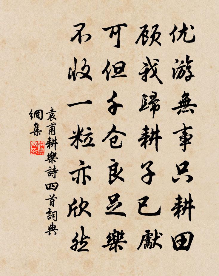 詩詞名句歷史字典書法欣賞書法字典國語詞典說文解字康熙字典古漢語字典標 題 作 者 詩 句 耕樂詩四首作者:袁甫 朝代:宋代耕樂詩四首原文優遊無事只耕田,顧我歸耕子已先。可但千倉良足樂,不收一粒亦欣然。詩詞問答問:耕樂詩四首的作者是誰?答:袁甫問:耕樂詩四首寫於哪個朝代?答:宋代袁甫耕樂詩四首書法欣賞耕樂詩四首書法作品詩詞推薦蔓菁花詩張嵲〔宋代〕遊絲百尺如堪挽,小蟲群飛欣日暖。蒿萊滿地不見春,唯有蔓菁迷病眼。無復陵陂間碎金,青苔漫想玄都觀。今朝凌閣學輓詩二首周必大〔宋代〕南渡衣冠墜,俄然氣象還。向微公數輩,誰濟國多限。劍履星辰上,風流水石間。名高仍壽考,天賦未全慳。採桑子韓淲〔宋代〕蕭蕭兩鬢吹華發,老眼全昏。徒倚衡門。歲晚寒消澗水痕。含情更覺滄洲遠,欲語誰論。窈窕孤村。細雨梅花只斷紹興祀岳鎮海瀆四十三首佚名〔宋代〕帝奠九壥,孰匪我疆。翳我東土,山川相望。祀事孔時,肅雍不忘。來峨濛鴻,郁哉洋洋。臨江仙(南樓席上壽張守)王質〔宋代〕八字山頭來較晚,彩雲未散南樓。夕陽千丈映簾鉤。君侯如欲老,江水莫教流。扇底清歌塵不動,胡床明月清秋。在伯用巴字韻垂示次韻以報趙蕃〔宋代〕我詩音節變巫巴,君向風流守故家。剝啄未嫌驚夢蝶,吟喔惟恐到昏鴉。沅湘自昔皆因適,蠻左於今況雜華。豈不夏日邀客飲月下偶作李彌遜〔宋代〕晴空倒掛秋江平,仙人攜盤上青冥。珊瑚無根倚霄漢,影落夜水魚龍驚。流金焦土天六月,腹欲生菌頭生蠅。恍然晚望有感寇準〔宋代〕出門望寒野,四顧惟椒坡。憶昔楚大夫,還此情如何。殘陽半明雨,水落西風多。因同下蔡恨,不覺增悲歌。山郭風雨朝霽悵然秋思羊士諤〔唐代〕桐竹離披曉,涼風似故園。驚秋對旭日,感物坐前軒。江燕飛還盡,山榴落尚繁。平生信有意,衰久已忘言。朱粹索詩作三絕謝之陳造〔宋代〕多謝詩翁肯唱予,挑燈泚筆復踟躕。龍文虎脊渠皆有,鶴膝蜂腰我未除。超師房釋道璨〔宋代〕岩桂花開滿院香,青莎葉底有鳴螿。人家只在西林住,雞犬聲中又夕陽。挽黃通判明叔座主度正〔宋代〕政在伾文過十年,幾多岩穴老英賢。公車牘上皆亨路,夜壑舟移閟下泉。事業鼎彝千古恨,文章衣缽萬燈傳。兌齋歸來橋曾幾〔宋代〕安車過橋時,童稚皆喜舞。題柱作歸來,元無長卿語。淳化鄉飲酒三十三章佚名〔宋代〕伊鵲成巢,珍禽扆止。婉彼佳人,配於君子。江村何宏甫載酒過清江戴復古〔宋代〕玉笥千峰雨,金風十日秋。誰能多載酒,來此共登樓。山立閱萬變,溪深納眾流。故人歸未得,我亦為詩留。送馮中允之任婺州王禹偁〔宋代〕東南宦跡多勝游,婺女星下溪山幽。嚴陵隱德七里瀨,沈約詩名八詠樓。岸上黍離經故國,湖邊木脫正高秋。承明頌古二十九首釋師體〔宋代〕夜叉頭,菩薩面。鬼搗谷,佛跳牆。同門共戶不相識,邁古超今地寸長。燈心戳破石人腳,扁鵲盧醫爭主張。虞美人(至當塗呈郭功甫)黃庭堅〔宋代〕平王本愛江湖住。鷗鷺無人處。江南江北水雲連。莫笑醯雞歌舞、瓮中天。當塗艤棹蒹葭外。賴有賓朋在。此身無鷓鴣天郭應祥〔宋代〕人道今年秋較遲。木樨全未放些兒。不因誕節開千歲,爭得今辰把一枝。呼寶鼎,伴渠伊。堂萱喜色正融怡。兒前韶州韶陽樓夜宴(一作題韶州驛樓)許渾〔唐代〕待月西樓卷翠羅,玉杯瑤瑟近星河。簾前碧樹窮秋密,窗外青山薄暮多。鴝鵒未知狂客醉,鷓鴣先讓美人歌。使君名句推薦長於春夢幾多時,散似秋雲無覓處。晏殊《木蘭花·燕鴻過後鶯歸去》 新來雁闊雲音,鸞分鑒影,無計重見。盧祖皋《宴清都·初春》 春來遍是桃花水,不辨仙源何處尋。王維《桃源行》 隔岸荒雲遠斷,繞磯小樹微明。歸莊《錦堂春·半壁橫江矗起》 月兒彎彎照九州,幾家歡樂幾家愁。佚名《月兒彎彎照九州》 明月何皎皎,照我羅床幃。佚名《明月何皎皎》 一日不見兮,思之如狂。司馬相如《鳳求凰 / 琴歌》 羞日遮羅袖,愁春懶起妝。魚玄機《贈鄰女 / 寄李億員外》 金帶連環束戰袍,馬頭沖雪度臨洮。馬戴《出塞詞》 積於不涸之倉者,務五穀也管仲《管子·牧民》