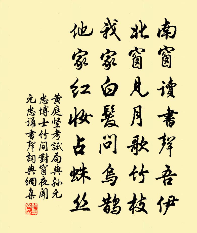 詩詞名句歷史字典書法欣賞書法字典國語詞典說文解字康熙字典古漢語字典標 題 作 者 詩 句 考試局與孫元忠博士竹間對窗夜聞元忠誦書聲作者:黃庭堅 朝代:宋代原文南窗讀書聲吾伊,北窗見月歌竹枝。我家白髮問烏鵲,他家紅妝占蛛絲。詩詞問答問:《考試局與孫元忠博士竹間對窗夜聞元忠誦書聲》的作者是誰?答:黃庭堅問:該詩寫於哪個朝代?答:宋代問:黃庭堅的名句有哪些?答:黃庭堅名句大全書法欣賞考試局與孫元忠博士竹間對窗夜聞元忠誦書聲書法作品詩文賞析原題:考試局與孫元忠博士竹間對窗夜聞元忠誦書聲調悲壯戲作竹枝歌三章和之詩詞推薦寧川道中潘獻可〔宋代〕十日為山客,今朝問水程。沙橫疑港斷,灘迅覺舟輕。遠近村舂合,高低漁火明。回頭忽蒼莽,一望一傷情。茅葦陳允平〔宋代〕白葦黃茅幾斷魂,數家雞犬不相聞。江南多少朱門閉,桑柘春深綠似雲。禱雨陽山曹彥約〔宋代〕暮投突兀淨為坊,早踏崎嶇翠作岡。露氣失涼風帶暑,嵐陰欺曉日韜光。不憂時事禽空語,可怪凶年草更芳。欲問求約丘葵〔宋代〕求約未能休厭繁,每於得處自難言。書曾過眼平心看,道不依形觸目存。木本草根如有見,山巔水際盡逢源。可憐暑中宴張穆父第董嗣杲〔宋代〕席地莫禁流汗體,陰陰竹樹埋虛堂。夜分幾傳逡巡酒,暑甚一沃沆瀣漿。不聽哀弦知興逸,才舒清簟覺心涼。青瓜雨後出城馬上作林之奇〔宋代〕既雨天氣佳,微雲淡如掃。欲尋煙際鍾,騎馬河邊草。紫椹飽黃鸝,人家夏蠶老。田婦踏繅車,隔籬語音好。嗟我酬崔峒王烈〔唐代〕徇世甘長往,逢時忝一官。欲朝青瑣去,羞向白雲看。榮寵無心易,艱危抗節難。思君寫懷抱,非敢和幽蘭。巫山一段雲 寄天長道眾尹志平〔元代〕山後春將暮,龍陽景漸佳。東園芭欖正開花。隨分有生涯。道友堅心長久。相見時時稽首。自然恬淡日和平。物外大龍湫樓鑰〔宋代〕北上太行東禹穴,雁盪山中最奇絕。龍湫一派天下無,萬口讚揚同一舌。行行路入兩山間,踏碎苔痕屐將折。山窮責子陶淵明〔魏晉〕白髮被兩鬢,肌膚不復實。雖有五男兒,總不好紙筆。阿舒已二八,懶惰故無匹。阿宣行志學,而不愛文術。雍端昭潭十愛梅摯〔宋代〕我愛昭州月,間宵入綺樓。涼生荔浦樹,冷熨桂江秋。朱戶千家啟,浮雲萬里收。誰夸魏公子,飛上鄴門游。九月九日李治〔唐代〕端居臨玉扆,初律啟金商。鳳闕澄秋色,龍闈引夕涼。野淨山氣斂,林疏風露長。砌蘭虧半影,岩桂發全香。滿蓋贈黃降自宜城赴官許昌曾鞏〔宋代〕所學從誰得最完,豫間新出已難攀。不搖聲利心能定,欲正哇淫手自刪。潁水珠璣來席上,鄢城桃李在人間。高齋寒食後一日作和林秀才蘇頌〔宋代〕寒食初過一百五,陌上風輕斂微雨。宮花鋪繡淺深紅,蜀柳垂絲千萬縷。都人士女趁時節,郡圃山樊樂樽俎。肯教壽安夫人輓詞李新〔宋代〕閨門秀色擢冰清,行佩蘭苕八十春。傳道先生為擇配,起家著作不憂貧。金花貼子分雙軸,子舍登瀛有幾人。千仞漁父詞宋高宗〔宋代〕駭浪吞舟脫巨鱗,結繩為網也難任。綸乍放,餌初沉,淺釣纖鱗味更深。夢至小益陸游〔宋代〕夢覺空山淚漬衿,西遊歲月苦駸駸。葭萌古路緣雲壁,桔柏浮梁暗櫟林。坐上新聲猶蜀伎,道傍逆旅已秦音。荷戈閒遊李建勛〔唐代〕攜酒復攜觴,朝朝一似忙。馬諳頻到路,僧借舊眠床。道勝他圖薄,身閒白日長。扁舟動歸思,高處見滄浪。偈頌七十二首釋祖欽〔宋代〕聲色無依,見聞不立。渡水問魚蹤,過山尋蟻跡。送舶使王監丞劉克莊〔宋代〕一琴不鼓攜歸浙,六轡如絲送入閩。魁傑西州今有汝,典司南庫豈無人。牙籌何足煩名勝,厘席方將問鬼神。公幹名句推薦病骨支離紗帽寬,孤臣萬里客江乾。陸游《病起書懷》 一葉葉,一聲聲,空階滴到明。溫庭筠《更漏子·玉爐香》 歌舞尊前,繁華鏡里,暗換青青發。薩都剌《念奴嬌·登石頭城次東坡韻》 闌風伏雨催寒食,櫻桃一夜花狼藉。納蘭性德《菩薩蠻·闌風伏雨催寒食》 重陽過後,西風漸緊,庭樹葉紛紛。晏殊《少年游·重陽過後》 三杯吐然諾,五嶽倒為輕。李白《俠客行》 待到重陽日,還來就菊花。孟浩然《過故人莊》 倉稟無宿儲,徭役猶未已。韋應物《觀田家》 翠葉吹涼,玉容消酒,更灑菇蒲雨。姜夔《念奴嬌·鬧紅一舸》 別來春半,觸目柔腸斷。李煜《清平樂·別來春半》