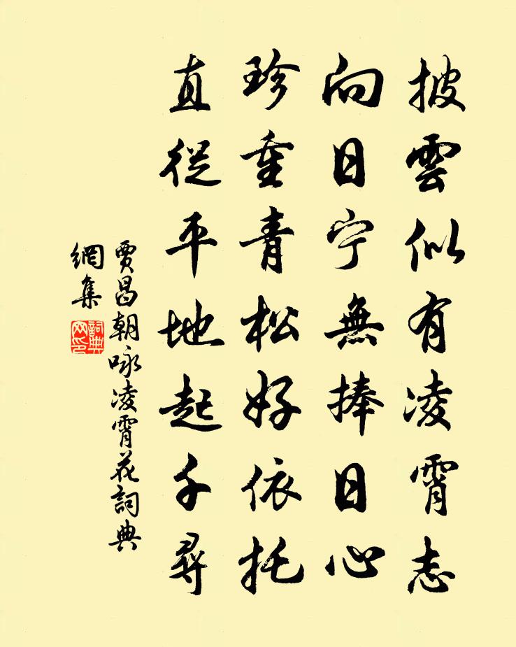 詩詞名句歷史字典書法欣賞書法字典國語詞典說文解字康熙字典古漢語字典標 題 作 者 詩 句 詠凌霄花作者:賈昌朝 朝代:宋代詠凌霄花原文披雲似有凌霄志,向日寧無捧日心。珍重青松好依託,直從平地起千尋。詩詞問答問:詠凌霄花的作者是誰?答:賈昌朝問:詠凌霄花寫於哪個朝代?答:宋代賈昌朝詠凌霄花書法欣賞詠凌霄花書法作品詩詞推薦述往二首陳杰〔宋代〕貞惠文子升士,睿聖武公好賢。晏平仲狐裘一,齊景公駟馬千。窗前種小梅樹今年未著花但春來綠陰亂眼每過鄭剛中〔宋代〕水邊移得竹邊栽,樹小條新花未開。綠葉參差須細看,尚疑低處有青梅。八月道宮聞鶯王洋〔宋代〕密林囀圓吭,流韻入清杳。當時太晚計,花前來不中。致使惜春人,問聲恨先老。正緣幽谷春,朋友在久要。爭春菩薩蠻(梅)趙長卿〔宋代〕肩輿曉踏江頭月。月華冷浸消殘雪。雪月照疏籬。梅花三兩枝。人憐花淡薄。花恨人牢落。不似那回時。醺醺醉玉泛茅山東溪儲光羲〔唐代〕清晨登仙峰,峰遠行未極。江海霽初景,草木含新色。而我任天和,此時聊動息。望鄉白雲里,發棹清溪側。松柏和兗弟與梁況之學士同作四絕句右呈況之常蘇頌〔宋代〕偶陪嘉約出重闉,自覺超然隔世塵。若欲遍游山下寺,直須經歲駐征輪。戊戌恭和御製徐元傑〔宋代〕明庭親策廣蒐賢,識治朋來誼少年。肆秩瓊林賓燕衎,載頒賓畫寵光延。此時禮樂三千字,他日丹青數百篇。螻蟻平湖俞桂〔宋代〕平湖一景堪圖畫,舟子煙波去復歸。舊日玄真無覓處,西山長見鷺鸞飛。寒食上冢楊萬里〔宋代〕逕直夫何細!橋危可免扶?遠山楓外淡,破屋麥邊孤。宿草春風又,新阡去歲無。梨花自寒食,進節只愁余。感興五首歐陽修〔宋代〕仕宦希寸祿,庶無饑寒迫。讀書事文章,本以代耕織。學成頗自喜,祿厚愈多責。挾山以超海,事有非其力。君子葛仙宅胡融〔宋代〕仙翁臥雲日,種松藥爐東。千載鱗鬣古,突兀成老龍。蛻骨入霄漢,橫身飲長風。上有玄鶴巢,下有白蟻宮。先生寄題館娃即靈岩寺周文璞〔宋代〕突兀僧藍是館娃,屟廊猶自隱晴霞。清明但長離宮草,精魄應棲野寺花。白薴黃蕉迷鶴市,紫蘭綠芷屬漁家。思量臨川投贈黃彥平〔宋代〕主計懷蕭相,臨氏起次公。履聲元自識,環賜固宜蒙。便覺長安近,寧論茂苑雄。別計無好語。虛忝薦賢中。浣溪沙江開〔宋代〕手拈花枝憶小苹。綠窗空鎖舊時春。滿樓飛絮一箏塵。素約未傳雙燕語,離愁還入賣花聲。十分春事倩行雲。句程師孟〔宋代〕七重樓向青霄動。題秋江菸草詩卷易士達〔宋代〕萬里長江浸碧流,煙籠細草滿孤洲。吟懷到此難排遣,獨立斜陽古渡頭。題蒙泉俞汝尚〔宋代〕幽人{左屬右斤}寒泉,井甃金曰蒙。井貴德不改,蒙以養為功。非徒玩清冷,潤液幽芳叢。說築傅岩下,伊耕莘次金東園農家雜詠八首楊公遠〔宋代〕四郊{左禾右罷}稏高低熟,幾處連耞湃聲。婦餉區區無寸暇,績麻猶趁月華明。聞杜鵑三首劉宰〔宋代〕當日停輈古道傍,大言聊以解愁腸。只今老去還吳下,無復驅車走四方。回中作溫庭筠〔唐代〕蒼莽寒空遠色愁,嗚嗚戍角上高樓。吳姬怨思吹雙管,燕客悲歌別五侯。千里關山邊草暮,一星烽火朔雲秋。夜來名句推薦明年豈無年,心事恐蹉跎。蘇軾《守歲》 月下飛天鏡,雲生結海樓。李白《渡荊門送別》 惟心會而不可口傳,可神通而不可語達。曹雪芹《紅樓夢·第五回》 焦首朝朝還暮暮,煎心日日復年年。曹雪芹《紅樓夢·第二十二回》 行到小溪深處,有黃鸝千百。秦觀《好事近·夢中作》 莫嫌舉世無知己,未有庸人不忌才。查慎行《三閭祠》 窮愁千萬端,美酒三百杯。李白《月下獨酌四首》 既秉上皇心,豈屑末代誚。謝靈運《七里瀨》 右手畫圓,左手畫方,不能兩成。韓非及後人《韓非子·功名》 把吳鉤看了,欄桿拍遍,無人會,登臨意。辛棄疾《水龍吟·登建康賞心亭》