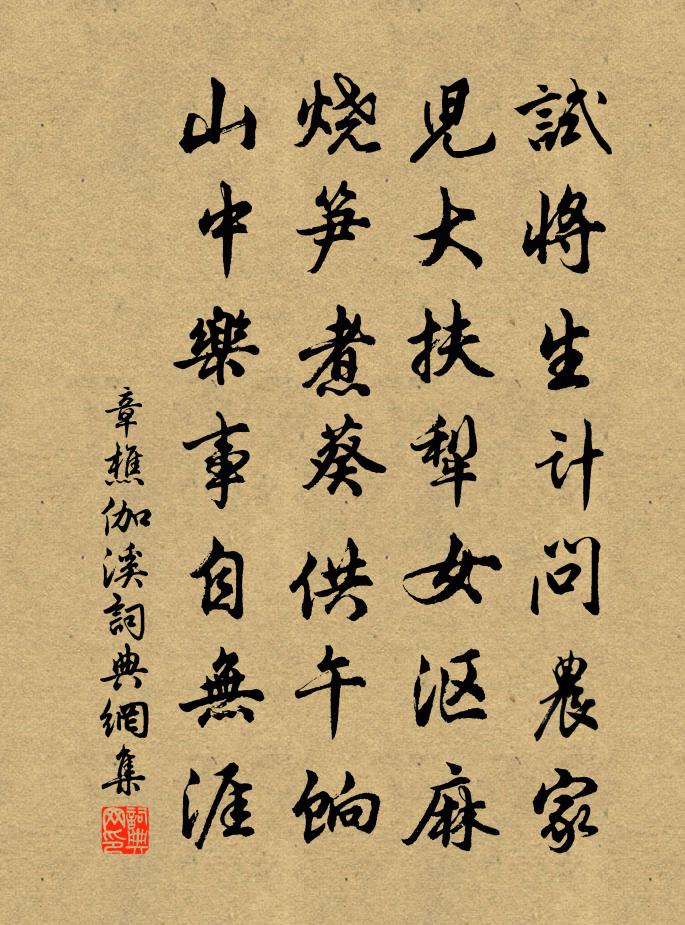 詩詞名句歷史字典書法欣賞書法字典國語詞典說文解字康熙字典古漢語字典標 題 作 者 詩 句 伽溪作者:章樵 朝代:宋代伽溪原文試將生計問農家,兒大扶犁女漚麻。燒筍煮葵供午餉,山中樂事自無涯。詩詞問答問:伽溪的作者是誰?答:章樵問:伽溪寫於哪個朝代?答:宋代章樵伽溪書法欣賞伽溪書法作品詩詞推薦百字謠(壽丘郎七月二十四日)方岳〔宋代〕河南靈地,信從生俊傑,皆由天佑。見說簪纓稱世襲,復是青氈還舊。學海淵源,筆端鋒鏑,未遜誰居右。使台暫送強甫赴惠安六言十首劉克莊〔宋代〕巽以行權亦可,方於事上未然。或迎使者負弩,或為刺史挽船。述懷陳傅良〔宋代〕有客盈門飯不足,有書千捲兒懶讀。王公勞問煬爭灶,樵牧相忘盜騎屋。古來堪笑如我少,生無一事能恰好。獨有明堂觀禮雜詠十三首回龍橋望駕王同祖〔宋代〕回龍橋上望龍顏,毅采英英仰視難。須信吾皇自神武,何憂中國不尊安。題法華山天衣寺曾會〔宋代〕十里湖光十里松,松陰路到十高峰。窗看渡口隨湖月,樓聽雲門度嶺鍾。梁帝缽含山雨潤,普賢台鏁蘚花重。誰人四安道中所見牟巘五〔宋代〕姑溪小隊帶薰風,笳鼓歡迎鶴髮翁。三十九年成一夢,幾多陳跡淚痕中。走筆謝高秘書送示詩文蘇泂〔宋代〕郊居近郭非寂寞,蟠竹結茅依野塘。白屋老人談黍稷,青雲學士送文章。藕花開後滿船月,楓葉落時緣路霜。年過放下庵即事三絕范成大〔宋代〕病後天魔不戰降,夢中千頃白鷗江。心空境寂聲塵盡,卻愛秋蠅撲紙窗。湖南蘭若示大乘諸公皎然〔唐代〕未到無為岸,空憐不繫舟。東山白雲意,歲晚尚悠悠。和用之題剡雪舒岳祥〔宋代〕兩岸青山一水流,蓑衣不著雪為裘。安道只應深樹里,青山不見便回舟。復作耳鳴范成大〔宋代〕東極空歌下始青,西方寶綱奏韶英。不須路入兜玄國,自有音聞室筏城。牛蟻誰知床下斗,雞蠅任向夢中鳴。如今觀江南牡丹張蠙〔唐代〕北地花開南地風,寄根還與客心同。群芳盡怯千般態,幾醉能消一番紅。舉世只將華勝實,真禪元喻色為空。近年變竹枝詞九首之二賀鑄〔宋代〕隔岸東西州,清川拍岸流。但聞竹枝曲,不見青翰舟。新霽城南舟中夜興陸游〔宋代〕身是江湖不繫船,雨余隨處一翛然。浮雲盡斂出青嶂,孤月徐升行碧天。收網漁歌移別浦,隔城塔影落前川。明朝晴歸陳著〔宋代〕兒造弄晴曦,安排老我歸。江收閒水退,山戴斷雲飛。晚色明官路,清寒攪客衣。行行到嵩曲,猶可及斜暉。鷓鴣天佚名〔宋代〕真箇親曾見太平。元宵且說景龍燈。四方同奏昇平曲,天下都無嘆息聲。長月好,定天晴。人人五夜到天明。如今偈十二首釋文準〔宋代〕祖師闕棙子,幽隱罕人知。不是悟心者,如何舉向伊。初寒陸游〔宋代〕逐祿天涯半此生,明時寬大許歸耕。山圍魚市寒無色,雨掠蓬窗夜有聲。白髮青燈身潦倒,殘蕪落葉歲崢嶸。爾來秋霜閣劉拯〔宋代〕翰林詩筆振千古,珊瑚照夜橫雕梁。高文勝地占江左,我來戴勝初降桑。雨師憤郁欲傾注,氣蒸柱礎如迸漿。清風奉和張僕射朝天行權德輿〔唐代〕元侯重寄貞師律,三郡四封今靜謐。丹轂常思闕下來,紫泥忽自天中出。軍裝喜氣倍趨程,千騎鳴珂入鳳城。周王名句推薦湖闊兼雲霧,樓孤屬晚晴。杜甫《陪裴使君登岳陽樓》 君似孤云何處歸,我似離群雁。周紫芝《卜運算元·席上送王彥猷》 江流天地外,山色有無中。王維《漢江臨泛 / 漢江臨眺》 曾把芳心深相許。故夢勞詩苦。史達祖《留春令·詠梅花》 東風且伴薔薇住,到薔薇、春已堪憐。張炎《高陽台·西湖春感》 四體不勤,五穀不分孔子弟子《論語·微子篇》 朔方三度重陽節,河曲乾旌歲歲忙。齊之鸞《九日登清水營城》 賭近盜,淫近殺。馮夢龍《警世通言·卷三十五》 城小賊不屠,人貧傷可憐元結《賊退示官吏》 官不得其才,比於畫地作餅,不可食也。吳兢《貞觀政要·卷三·論擇官》