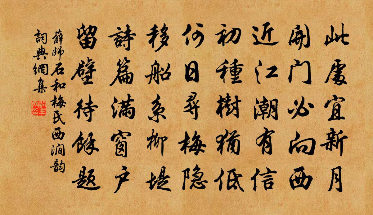詩詞名句歷史字典書法欣賞書法字典國語詞典說文解字康熙字典古漢語字典標 題 作 者 詩 句 和梅氏西澗韻作者:薛師石 朝代:宋代和梅氏西澗韻原文此處宜新月,開門必向西。近江潮有信,初種樹猶低。何日尋梅隱,移船系柳堤。詩篇滿窗戶,留壁待余題。詩詞問答問:和梅氏西澗韻的作者是誰?答:薛師石問:和梅氏西澗韻寫於哪個朝代?答:宋代薛師石和梅氏西澗韻書法欣賞和梅氏西澗韻書法作品詩詞推薦酹江月侯善淵〔元代〕貪財競色,利名牽、縈系何時休歇。鎮日忙忙如夢想,顛倒心猿馬劣。昧地謾天,多能已會,以巧翻為拙。萬般虛養蠶宋沆〔宋代〕男必耕耘女必蠶,古人尚爾我何貪。浴沂時候成春服,歌詠來歸道味甘。滿江紅(答景盧)洪适〔宋代〕衰老貪春,春又老、尊罍交溢。凝目處、清漪拍岸,四山堆碧。白也論文情最厚,維摩示病心難覓。到盤洲、車騎見紫荊花韋應物〔唐代〕雜英紛已積,含芳獨暮春。還如故園樹,忽憶故園人。醉歌汪元量〔宋代〕援兵不遣事堪哀,食肉權臣大不才。見說襄樊投拜了,千軍萬馬過江來。再用韻三首裘萬頃〔宋代〕亂飄窗戶重重積,巧入簾櫳細細飛。想見鈞天張樂處,瓊琚玉佩列千妃。水仙洪咨夔〔宋代〕萬卉淨如掃,風霜猶典刑。睟容閒整整,姱節矯亭亭。幾滑銅熏鼎,窗明石硯屏。窈深人不到,香觸夢魂醒。數日前夢一僧出二鏡求詩僧以鏡置日中其影甚蘇軾〔宋代〕君家有二鏡,光景如湛盧。或長如芭蕉,或圓如芙蕖。飛電著子壁,明月入我廬。月下合三壁,日月跳明珠。問子中秋不見月二首李若水〔宋代〕明月如君子,隱見自有時。頑雲巧障之,光耀不得施。賞心無復樂,對酒翻成悲。樹頭號秋風,日夜無停期。胡不送程公辟守洪州王安石〔宋代〕畫船插幟搖秋光,鳴鐃傳鼓水洋洋。豫章太守吳郡郎,行指鬥牛先過鄉。鄉人出孰航酒漿,炰龜鱠魚炊稻粱。芡頭春晴野步曹勛〔宋代〕春風搖天宇,散策喜徐步。樂與二三子,綠草池塘路。鳩鳴桑枯春,川闊牛羊暮。眷言益妍暖,更約窮逸趣。【雙調】大德歌 三關漢卿〔元代〕鄭元和,受寂寞,道是你無錢怎奈何?哥哥家緣破,誰著你搖銅鈴唱輓歌。因打亞仙門前過,恰便是司馬淚痕多。揚州后土廟瓊花香如蓮花落不著地丙子一夕大趙文〔宋代〕朔風吹沙淮浪白,二十四橋沉冷月。顛雷夜半撼蕪城,雪萼瓊絲破空碧。金瓶歲歲獻君王,玉罌泛酒蓮花香。明光寄楊八拾遺劉禹錫〔唐代〕聞君前日獨庭爭,漢帝偏知白馬生。忽領簿書游太學,寧勞侍從厭承明。洛陽本自宜才子,海內而今有直聲。為謝再六次韻徐子英江樓方回〔宋代〕最愁人處最高樓,空望三神想十洲。大藥不靈從老病,把茅酒在盍歸休。許追竹士陪梅友,肯羨蜂王慕蝶侯。曾點湖州歌九十八首 其十八汪元量〔宋代〕京口沿河賣酒家,東邊楊柳北邊花。柳搖花謝人分散,一向天涯一海涯。送張仲山守唐安二首李流謙〔宋代〕六十專城發未斑,更於何地覓三山。不妨談笑催科里,正賴清涼熱惱間。到日紅梅留臘在,公餘翠榴酌春慳。胡床次韻酬張仲思高郵見寄二首張鎡〔宋代〕春來慵把酒,間日伴僧齋。風雨梅花夢,豀山老子懷。有人非吏俗,同好任天涯。歸上青雲,幽期孰與偕。即事六絕鄧深〔宋代〕臥櫓無聲百丈斜,牽夫匍匐入蘆花。寒雲過雁愁相顧,踏損尋常落處沙。雜曲歌辭。竹枝李涉〔唐代〕荊門灘急水潺潺,兩岸猿啼煙滿山。渡頭年少應官去,月落西陵望不還。巫峽雲開神女祠,綠潭紅樹影參差。下牢名句推薦雙星何事今宵會,遺我庭前月一鉤。德容《七夕二首·其一》 回首暮雲遠,飛絮攪青冥。蘇軾《水調歌頭·昵昵兒女語》 肉腐出蟲,魚枯生蠹。荀子《荀子·勸學》 粉黛暗愁金帶枕,鴛鴦空繞畫羅衣,那堪辜負不思歸!顧敻《浣溪沙·雲淡風高葉亂飛》 春風不解禁楊花,蒙蒙亂撲行人面。晏殊《踏莎行·小徑紅稀》 山泉散漫繞階流,萬樹桃花映小樓。元稹《離思五首》 山有木兮木有枝,心悅君兮君不知。佚名《越人歌》 揚雲霓之晻藹兮,鳴玉鸞之啾啾。屈原《離騷》 子規夜半猶啼血,不信東風喚不回。王令《送春》 知文德武功,蓋因時而並用魏徵《隋書·列傳·卷三十二》