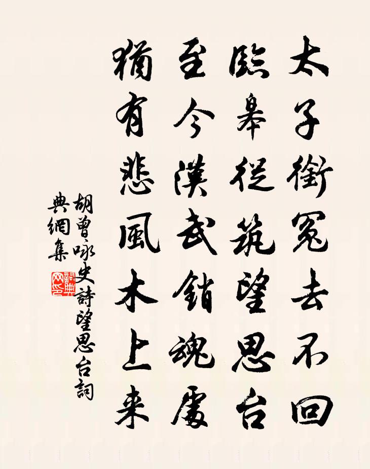 詩詞名句歷史字典書法欣賞書法字典國語詞典說文解字康熙字典古漢語字典標 題 作 者 詩 句 詠史詩望思台作者:胡曾 朝代:唐代詠史詩望思台原文太子銜冤去不回,臨皋從築望思台。至今漢武銷魂處,猶有悲風木上來。詩詞問答問:詠史詩望思台的作者是誰?答:胡曾問:詠史詩望思台寫於哪個朝代?答:唐代問:詠史詩望思台是什麼體裁?答:七絕胡曾詠史詩望思台書法欣賞詠史詩望思台書法作品注釋全唐詩:卷647-67詩詞推薦早過歷塘趙文〔宋代〕細細清風吹月明,筍輿如泛夜舟行。草根帶露有蟲語,茅屋閉門唯犬聲。鬼燐影寒驚遠去,曜靈睡起亦東征。踏車八月十五日過蓬豀書淨戒寺李新〔宋代〕瓦冷雲埋殿,燈長黑暗沙。藥靈閒草木,蔓走古龍蛇。石佛隨山老,松梯轉路賒。門前溪水淺,無處問仙家。題二妃廟李群玉〔唐代〕黃陵廟前春已空,子規啼血滴松風。不知精爽歸何處,疑是行雲秋色中。送熊退齋歸武夷蜀翁〔宋代〕君居建州溪,我住東浙尾。邂逅入壺山,於今幾寒暑。平生譚理道,涉獵頗自喜。考擊到精玄,我膚君骨髓。君學感懷二首楊公遠〔宋代〕長吟抱膝更欷噓,較著前時迥不如。世事看來巢幕燕,人生勘破上竿魚。投非所好緣工瑟,見匪相知嫩曳裾。造物涑口守風陳造〔宋代〕辦舟留襄陽,辟風泊涑口。和行秋甲辰,初到夏癸酉。跛鱉已自慣,束髮至衰朽。坐是冥得喪,況復多病後。絕憐會稽絕句三首曾鞏〔宋代〕花開日日去看花,遲日猶嫌影易斜。莫問會稽山外事,但將歌管醉流霞。登廬山唐寅〔明代〕匡廬山高高几重,山雨山煙濃復濃。移家欲往屏風疊,騎驢來看香爐峰。江上烏帽誰涉水,岩際白衣人采松。古句曉坐西齋韋應物〔唐代〕冬冬城鼓動,稍稍林鴉去。柳意不勝春,岩光已知曙。寢齋有單祶,靈藥為朝茹。盥漱忻景清,焚香澄神慮。公門洞仙歌(庚申樂淨錦棠盛開作)丘崈〔宋代〕花中憂物,欲賦無佳句。深染燕脂淺含露。被春寒無賴,不放全開,才半吐,翻與留連妙處。人間稱絕色,傾國傾大滌洞天留題趙珂夫〔宋代〕九鎖山藏一洞天,棲真大滌洞巍然。雲根石出仙人跡,天柱峰流漱玉爾。丹鳳岩前游熟路,翠蛟亭上揖來賢。我兒次郊行韻万俟紹之〔宋代〕蝶怕花殘舞更忙,隨風柳絮鬭輕狂。尋芳客去馬蹄倦,試酒人歸衣汗香。過雨人歸衣汗香。過雨千林舒翠葉,護田山中即目二首戴復古〔宋代〕岩路穿黃落,人家隱翠微。籠雞為鴨抱,網犬逐鶉飛。竹好堪延客,溪清欲浣衣。禪扉在何許,僧笠戴雲歸。懷元度四首王安石〔宋代〕秋水才深四五尺,扁舟斗轉疾於飛。可憐物色阻攜手,正是歸時君不歸。石塘周弼〔宋代〕水陸盡經過,地暄晴更和。鳥聲臨水近,人影向橋多。細雪傾殘橘,輕冰脆立荷。少為鹽米計,聽徹竹枝歌。夜厭厭(小石調)張先〔宋代〕昨夜小筵歡縱。燭房深、舞鸞歌鳳。酒迷花困共厭厭,倚朱弦、未成歸弄。峽雨忽收尋斷夢。依前是、畫樓鍾動。冷泉冬夜釋行海〔宋代〕數峰奇石翠層層,一片沙泉夜作冰。月照樹頭風不起,白猿應見倚闌僧。將進酒/梅花引賀鑄〔宋代〕城下路。淒風露。今人犁田古人墓。岸頭沙。帶蒹葭。漫漫惜時,流水今人家。黃埃赤日長安道。倦客無漿馬無草枕上陸游〔宋代〕香冷燈昏夢自驚,清愁冉冉帶餘酲。夜長誰作幽人伴,惟是蛩聲與月明。蜀中方乾〔唐代〕遊子去游多不歸,春風酒味勝餘時。閒來卻伴巴兒醉,豆蔻花邊唱竹枝。名句推薦江南幾度梅花發,人在天涯鬢已斑。劉著《鷓鴣天·雪照山城玉指寒》 青苔滿階砌,白鳥故遲留。杜牧《題揚州禪智寺》 為無為,事無事,味無味。老子《老子·德經·第六十三章》 無情有恨何人覺?月曉風清欲墮時。陸龜蒙《白蓮》 因病得閒殊不惡,安心是藥更無方。蘇軾《病中游祖塔院》 養不教,父之過。教不嚴,師之惰。王應麟《三字經·全文》 泥落畫梁空,夢想青春語。吳文英《生查子·秋社》 素臣稱有道,守在於四夷。田錫《塞上曲》 經一失長一智馮夢龍《警世通言·卷三》 絲長魚誤恐,枝弱禽驚踐。崔護《五月水邊柳》
