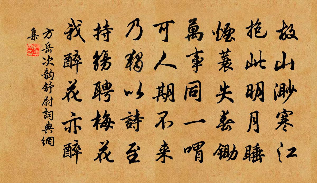 詩詞名句歷史字典書法欣賞書法字典國語詞典說文解字康熙字典古漢語字典標 題 作 者 詩 句 次韻舒尉作者:方岳 朝代:宋代次韻舒尉原文故山渺寒江,抱此明月睡。煙蓑失春鋤,萬事同一喟。可人期不來,乃獨以詩至。持觴聘梅花,我醉花亦醉。詩詞問答問:次韻舒尉的作者是誰?答:方岳問:次韻舒尉寫於哪個朝代?答:宋代方岳次韻舒尉書法欣賞次韻舒尉書法作品詩詞推薦江南弄 趙瑟曲沈約〔南北朝〕邯鄲奇弄出文梓。縈弦急調切流徵。玄鶴徘徊白雲起。白雲起。郁披香。離複合。曲未央。吳子野絕粒不睡過作詩戲之芝上人陸道士皆和蘇軾〔宋代〕聊為不死五通仙,終了無生一大緣。獨鶴有聲知半夜,老蠶不食已三眠。憐君解比人間夢,許我時逃醉後禪。會與頌證道歌證道歌釋印肅〔宋代〕空拳指上生實解,巡行數墨看經快。圓蟾光體指俱迷,枉入三途虛受罪。和使君王子堅游鄧氏天開圖畫韻程公許〔宋代〕春風滿城關笑顏,使君明當出遊山。東州山川北佳麗,凌雲耀日季孟間。紫絲步障元不要,飛檻層欄一憑眺。歲豐虎頭岩陳岩〔宋代〕下視眈眈猛若神,世方重利反輕身。縱教是虎真非石,藜藿來尋亦有人。舟中感懷三絕句呈太傅相公兼簡岳大用郎中陸游〔宋代〕雨打孤篷酒漸消,昏燈與我共無聊。功名本是無憑事,不及寒江日兩潮。十二月一日因出小憩愉閣而歸趙蕃〔宋代〕昨宵已辨雪中燈,今日晴來聊記曾。病骨可堪風似刮,衰眸自喜句如冰。雁因就暖長為客,魚為逃寒返墜罾。北去代吳景年次韻淨慈寺主僧頔上人二首陳著〔宋代〕遠公陶陸成千古,誰復相從過虎溪。西隱老師雖有約,北山俗駕似難齊。詩來日午雙瞳醒,句出天心萬象低。時課贈僧玘長老陳郁〔宋代〕客單近掛屋東偏,細看家風似閬仙。為功月舡來茂苑,因披雲衲出潭田。詩篇熟誦如持咒,句法旁參若勘禪。既是蝶戀花(梁才甫席上次韻)王安中〔宋代〕翠袖盤花金捻線。曉炙銀簧,勸飲隨深淺。復幕重簾誰得見。余醺微覺紅浮面。別喚清商開綺宴。玉管雙橫,抹起又六言二首劉克莊〔宋代〕有載書盟三友,無文章送五窮。怯懦寧出胯下,清狂羞入褌中。木蘭花慢辛棄疾〔宋代〕路傍人怪問,此隱者、姓陶不。堪 * 如雲,朝吟暮醉,喚不回頭。縱無酒成悵望,只東籬、搔首亦風流。與客朝和劉後村梅花百詠方蒙仲〔宋代〕參橫月落夢何從,且領清香入盞中。一歲見梅須一醉,梅前有幾百年翁。冬日同王茂翁聯句二首白玉蟾〔宋代〕風箭射壁縫,寒稜入被單。幽棲悄無夢,神思靜常安。紙帳懸冰簾,霜華結玉盤。窗外竹敲竹,壇前旛動旛。青燈睡起許必勝〔宋代〕睡起日滿窗,蒼蠅黃蜂如沸江。莫言閒人得睡足,夢到封侯亦勞碌。隔壁棋客時落子,功名事來此口已。巫山洛水木蘭花慢 德清縣圃愛山亭張可久〔元代〕就岩阿深處,結層屋,上空濛。喜著屐穿花,捲簾看雨,拄笏臨風。玲瓏。夏雲一片,隔籬芭、獨立舞仙風。**白下徐照〔宋代〕白下嚴州近,崎嶇昔未經。年豐山米賤,溪涸石苔腥。一月無新句,千岑役瘦形。人家今畏虎,未晚戶先扃。僧問四賓主因而有頌頌之釋重顯〔宋代〕如何是主中主。雲大千捏聚,又曰揭。〔頌〕主中之主,正令齊舉。長劍倚天,誰敢當御。寶鼎見(雲岩師書燈夕命賦)陳允平〔宋代〕六鰲初駕,縹緲蓬閬,移來洲島。還又是、梅飄冰泮,一夜青陽回海表。漸媚景、傍元宵時候,花底餘寒料峭。更題倪魯玉詩後二首劉克莊〔宋代〕梅經御史鞫成案,村荷先皇敕扁堂。少日不容人入社,暮年甘被子侵疆。不應愚谷知名姓,惟許孤山擅影香。豈獨名句推薦抽刀斷水水更流,舉杯銷愁愁更愁。李白《宣州謝朓樓餞別校書叔雲 / 陪侍御叔華登樓歌》 非知之難也,處知則難也。韓非及後人《韓非子·說難》 短長亭子短長橋,橋外垂楊一萬條。錢枚《憶王孫·短長亭子短長橋》 雲銷雨霽,彩徹區明。王勃《滕王閣序》 後其身而身先,外其身而身存。老子《老子·道經·第七章》 山驛淒涼,燈昏人獨寢。陸游《清商怨·葭萌驛作》 楊柳乍如絲,故園春盡時。納蘭性德《菩薩蠻·問君何事輕離別》 學而不思則罔,思而不學則殆。孔子弟子《論語·為政篇》 女為君子儒,無為小人儒。孔子弟子《論語·雍也篇》 東風兮東風,為我吹行雲使西來。李白《久別離》