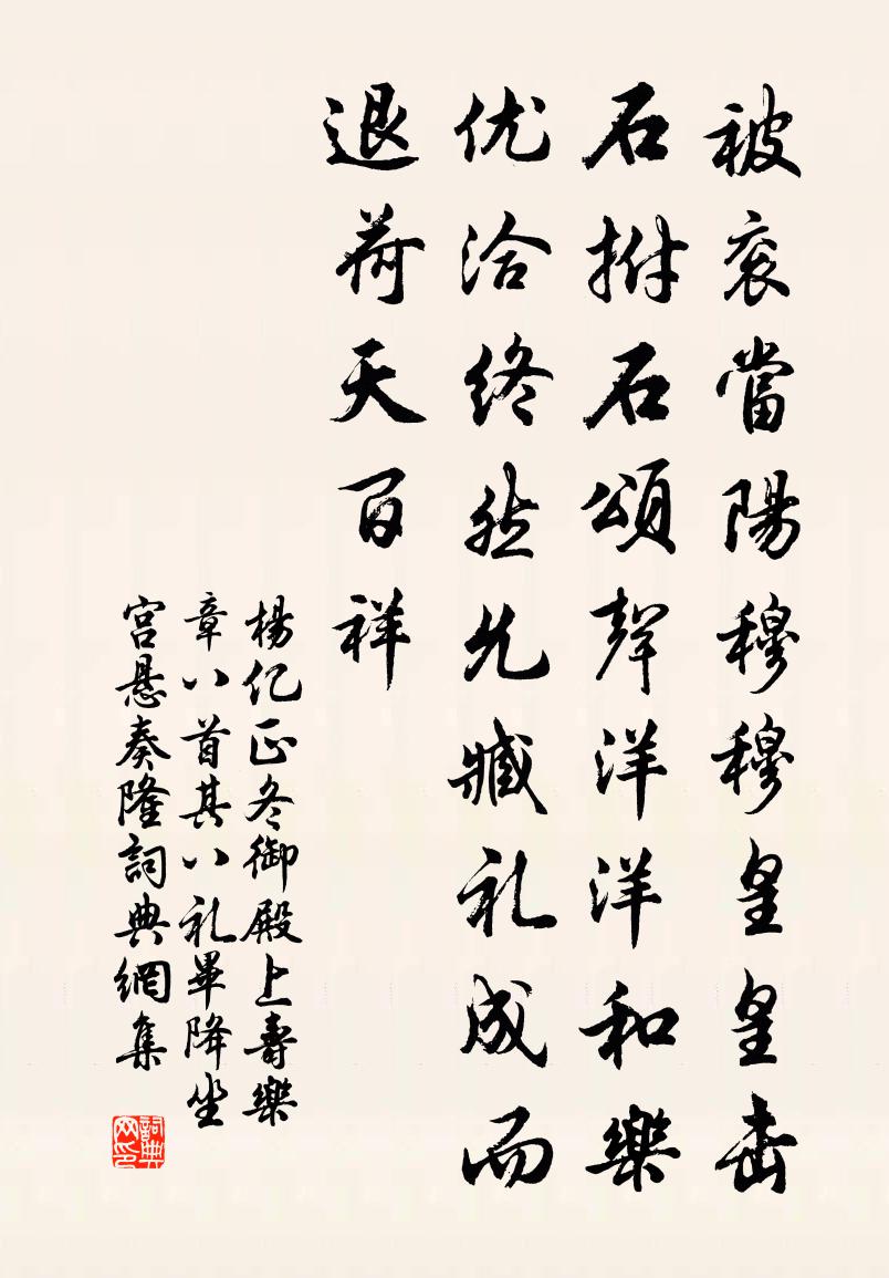 詩詞名句歷史字典書法欣賞書法字典國語詞典說文解字康熙字典古漢語字典標 題 作 者 詩 句 正冬御殿上壽樂章八首其八禮畢降坐宮懸奏隆作者:楊億 朝代:宋代原文被袞當陽,穆穆皇皇。擊石拊石,頌聲洋洋。和樂優洽,終然允臧。禮成而退,荷天百祥。詩詞問答問:《正冬御殿上壽樂章八首其八禮畢降坐宮懸奏隆》的作者是誰?答:楊億問:該詩寫於哪個朝代?答:宋代書法欣賞正冬御殿上壽樂章八首其八禮畢降坐宮懸奏隆書法作品詩文賞析【原題】:正冬御殿上壽樂章八首其八禮畢降坐宮懸奏隆安之曲詩詞推薦解連環·怨懷無托周邦彥〔宋代〕怨懷無托。嗟情人斷絕,信音遼邈。縱妙手能解連環,似風散雨收,霧輕雲薄。燕子樓空,暗塵鎖一床弦索。想移漢炳丹山晚進知學以來嘗於文字中敬識先生矣樊漢炳〔宋代〕天仙下寓人間世, * 都忘只愛山。更向馮仙問陳跡,煙蘿深處勇躋攀。郊祀樂章亞獻宮架奏黃鐘宮穆安之樂威功壑崔敦詩〔宋代〕四阿有嚴,神既戾止。備物雖儀,潔誠惟己。有來振振,相我熙事。載酌陶匏,以成毖祀。送將官歐育之徐州蘇轍〔宋代〕輕衫駿馬走春風,未識彭城氣象雄。青山只在白門外,明月盡屬黃樓中。五斗濁醪消永日,一雙鳴鏑戲晴空。歸來思歸八絕胡寅〔宋代〕天柱峰前又一區,已聞松菊漸荒蕪。近來更草歸田賦,敢以無功戀左符。奉陪武相公西亭夜宴陸郎中王良士〔唐代〕芳氣襲猗蘭,青雲展舊歡。仙來紅燭下,花發彩毫端。海岳期方遠,松筠歲正寒。仍聞言贈處,一字重琅玕。奉和立春遊苑迎春應制盧藏用〔唐代〕天游龍輦駐城闉,上苑遲光晚更新。瑤台半入黃山路,玉檻傍臨玄霸津。梅香欲待歌前落,蘭氣先過酒上春。幸預秋池張耒〔宋代〕平生落寞意,況此秋池側。寒水靜無波,衰荷委余碧。蕭蕭動風鬢,照影感新白。來往雙浴鳧,爾生真自得。緱山置酒元好問〔金代〕靈宮肅清曉,細柏含古春。人言王子喬,鶴馭此上賓。白雲山蒼蒼,平田木欣欣。登高覽元化,浩蕩融心神。西望舉趙州訪二庵主公案頌釋紹悟〔宋代〕一重山盡一重山,坐斷孤峰子細看。霧捲雲收山嶽靜,楚天空闊一輪寒。途中閱曾運使所況文清集得四絕句寄之趙蕃〔宋代〕桃源梅嶺幾成游,天欲昌詩不自由。一代如公才得此,五溪著我更何尤。京西市放生池墓銘佚名〔唐代〕龜言市,蓍言水。寄萬先輩釋清壹〔宋代〕歸從衡岳此身清,老校群書眼倍明。白屋有田供伏臘,青雲無夢到公卿。頻挑野菜招僧至,少著深衣入郭行。早歲漢宮春佚名〔宋代〕登眺,因次來韻,代書奉酬城畔芙蓉,愛吹晴映水,光照園廬。清霜乍凋岸柳,風景偏殊。登樓念遠,望越山、青南雁山陳埴〔宋代〕千峰歷罷寄山窗,酒力詩狂總未降。月白洞門花落盡,天華表鶴氣飛雙。岩邊瀑雪寒侵夢,澗底笙簫冷韻腔。且喜感皇恩 讀《莊子》,聞朱晦庵即世辛棄疾〔宋代〕案上數編書,非莊即老。會說忘言始知道。萬言千句,自不能忘堪笑。朝來梅雨霽,青青好。一壑一丘,輕衫短帽六龍駐蹕溫州先公職列西掖扈從至此手澤具載李洪〔宋代〕從龍浴日仰光輝,萬里鯨濤扈六飛。晉國曾聞四蛇宇,周家親睹一戎衣。東巡王氣隨天仗,西狩麟經在紫微。江海木蘭花慢仇遠〔宋代〕遠鍾消斷夢,又霜信、到紋窗。有六曲屏山,四垂斗帳,重錦方床。輕寒畫眉尚懶,想留連、一線枕痕香。無語因晚歸張耒〔宋代〕學省歸來門巷秋,伴眠書史滿床頭。低雲漠漠梧桐晚,屏上江山亦解愁。離觴不醉,至驛卻寄相送諸公柳宗元〔唐代〕無限居人送獨醒,可憐寂寞到長亭。荊州不遇高陽侶,一夜春寒滿下廳。名句推薦時雨降矣,而猶浸灌,其於澤也,不亦勞乎!莊子《莊子·內篇·逍遙遊》 斜日更穿簾幕,微涼漸入梧桐。晏殊《破陣子·燕子欲歸時節》 一寸相思一寸灰。蘇軾《南鄉子·集句》 芳菊開林耀,青松冠岩列。陶淵明《和郭主簿·其二》 浩氣清英,仙材卓犖,下土難分別丘處機《無俗念·靈虛宮梨花詞》 荊溪白石出,天寒紅葉稀。王維《山中》 可憐繡戶侯門女,獨臥青燈古佛旁。曹雪芹《紅樓夢·第五回》 人之生利也,然且猶尚有節;葬埋者,人之死利也,夫何獨無節於此乎。墨子《墨子·22章 節用(下)》 來掃千山雪,歸留萬國花。袁枚《春風》 餘霞散成綺,澄江靜如練。謝朓《晚登三山還望京邑》