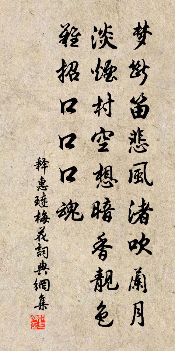 詩詞名句歷史字典書法欣賞書法字典國語詞典說文解字康熙字典古漢語字典標 題 作 者 詩 句 梅花作者:釋惠璉 朝代:宋代梅花原文夢斷笛悲風渚,吹蘭月淡煙村。空想暗香靚色,難招口口口魂。詩詞問答問:梅花的作者是誰?答:釋惠璉問:梅花寫於哪個朝代?答:宋代釋惠璉梅花書法欣賞梅花書法作品詩詞推薦歡喜口號黃彥平〔宋代〕何必翠虛捎魍魎,且看白旆掛麟猊。幾年待著龍蛇歲,便是乾坤交泰時。塞上曲(一作出塞曲)於鵠〔唐代〕行人朝走馬,直走薊城傍。薊城通漢北,萬里別吳鄉。海上一烽火,沙中百戰場。軍書發上郡,春色度河陽。裊裊句皇甫□〔宋代〕棹穿波底月。贈顧尚書詩陸雲〔魏晉〕五嶽降神。四瀆炳靈。兩儀鈞陶。參和大成。兆光人倫。誕育至英。於顯尚書。實惟我兄。行成世則。才為時生。採桑子晏幾道〔宋代〕心期昨夜尋思遍,猶負殷勤。齊斗堆金,難買丹誠一寸真。須知枕上尊前意,占得長春。寄語東鄰,似此相看有幾題寶林山禪院方乾〔唐代〕山捧亭台郭繞山,遙盤蒼翠到山巔。岩中古井雖通海,窟里陰雲不上天。羅列眾星依木末,周回萬室在檐前。我來丹霞遇龐化贊釋智遇〔宋代〕邂逅漉籬翁,言談耳又聾。不知何處去,破帽里西風。次韻張伯子餉柑崔敦禮〔宋代〕儒官窗戶寒,恇怯日出光。獨冷不可耐,大杓傾鵝黃。洞庭隔煙波,忽驚風露香。開門問誰與,知君念荒涼。芳包閨怨董以寧〔清代〕流蘇空系合歡床,夫婿長征妾斷腸。留得當時臨別淚,經年不忍浣衣裳。謁梅都官墓滕珂〔宋代〕宛陵城南柏山寺,行到西廂見舊祠。人物慾觀喜佑老,銘文空有醉翁辭。銀章粉墨誰舒捲,金薤琳琅自陸離。每見晚泊湘江懷故人劉長卿〔唐代〕天涯片雲去,遙指帝鄉憶。惆悵增暮情,瀟湘復秋色。扁舟宿何處,落日羨歸翼。萬里無故人,江鷗不相識。點絳唇 已醜清明前一日,春露堂即事,時既王惲〔元代〕名酒相屬,因放歌數闋而去,實至元二十六年三月七日也,可為不虛度此節矣。秋澗老人深香間適(朱校雲深香間自訟陸游〔宋代〕家弊須微祿,年衰尚遠遊。未逃朋友責,更遣吏民羞。釆藥思長往,傳書卻小留。微風入桐葉,分我一簾秋。送蔡伯畛往潮州四首陳藻〔宋代〕似我生男父合貧,腰斤嶺上解求薪。君今有子為官去,何憚攜家踏路塵。洞霄琳宮連久道〔宋代〕玲瓏萬狀石欺玉,開闔千層秀結峰。尚有炎蒸疑夏日,未令新爽洗秋容。龍翔鳳舞來天目,水秀山明鞏帝封。新見曹公陸游〔宋代〕二袁劉表笑談無,眼底英雄不足圖。赤壁歸來應嘆息,人間更有一周瑜!次李校書韻嘲閣下紅梅項安世〔宋代〕托跡千花冀可曹,冰姿何敢露秋毫。只隨婢子希紅藥,肯信仙家有碧桃。照影日華烘玉頰,承恩衢勺醉香醪。自拋月泉紀游張蘊〔宋代〕小春霜琮曉,閒訪古招提。何歲齋魚廢,初弦顧兔迷。先民堂上像,寓客柱間題。僧戶蜂分小,山形虎穴低,松青次韻宇文德蒙春日道中二首郭印〔宋代〕馬上花明眼,寧知道路遐。山橫千百嶺,人住兩三家。綠皺吹春水,紅舒抹曉霞。箇中佳趣在,何事苦咨嗟。滿庭芳 贛榆縣諸王廟黃醮罷,贈眾王處一〔元代〕海郡行緣,贛榆闡化,良因復顯諸王。謹修黃,特地召嘉祥。萬里雲收霧卷,微風息、燈燭熒煌。星壇上,步虛名句推薦報導先生歸也,杏花春雨江南。虞集《風入松·寄柯敬仲》 驅雞上樹木,始聞叩柴荊。杜甫《羌村三首·其三》 胡人吹笛戍樓間,樓上蕭條海月閒。高適《和王七玉門關聽吹笛 / 塞上聞笛》 風力雖尚勁,然徒步則汗出浹背。袁宏道《滿井遊記》 有風方起浪,無潮水自平。吳承恩《西遊記·第七十五回》 居高位者易驕,處佚樂者易侈。張廷玉《明史·列傳·卷二十四》 鼎湖流水清且閒,軒轅去時有弓劍,古人傳道留其間李白《飛龍引二首·其二》 秋空明月懸,光彩露沾濕。孟浩然《秋宵月下有懷》 絕景良時難再並,他年此日應惆悵。劉禹錫《八月十五夜桃源玩月》 寄治亂於法術,托是非於賞罰韓非及後人《韓非子·大體》