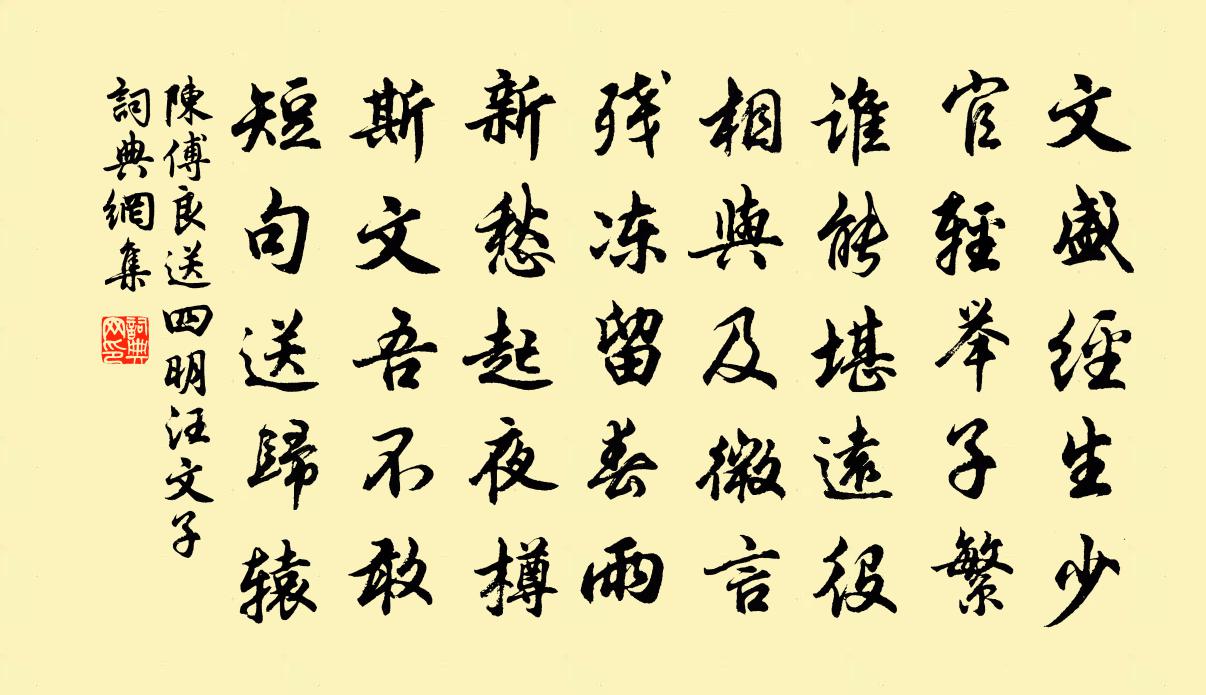詩詞名句歷史字典書法欣賞書法字典國語詞典說文解字康熙字典古漢語字典標 題 作 者 詩 句 送四明汪文子作者:陳傅良 朝代:宋代送四明汪文子原文文盛經生少,官輕舉子繁。誰能堪遠役,相與及微言。殘凍留春雨,新愁起夜樽。斯文吾不敢,短句送歸轅。詩詞問答問:送四明汪文子的作者是誰?答:陳傅良問:送四明汪文子寫於哪個朝代?答:宋代陳傅良送四明汪文子書法欣賞送四明汪文子書法作品詩詞推薦送高推官陳師道〔宋代〕先生鍾舊德,大府冠群能。過手無難事,逢人有異稱。薦賢餘一鶚,夙記契千燈。看挽秦梁纜,頭頭數不勝。卜運算元(惜海棠)劉克莊〔宋代〕儘是手成持,合得天饒借。風雨於花有底讎,著意相陵藉。做暖逼教開,做冷催教謝。不負明年花下人,只負栽花夜坐陸游〔宋代〕衰翁不出門,歲月過電雹。窗明地爐暖,袖手坐寂寞。可憐瓶中梅,爛漫幾開落;小園亦數樹,曾未破一萼。三更吳越三王判牘帖贊岳珂〔宋代〕玉冊之樓壓吳杭,三川錦繡開故鄉。英姿颯颯熊虎相,紅袍金印交煒煌。百年霸府儀物龐,山判近出功臣堂。鳳宅醉中登樓宋伯仁〔宋代〕明主何嘗充浩然,杯中有物且隨緣。倚樓心事誰消遣,一點飛禽落釣船。偈頌七十八首釋正覺〔宋代〕一塵具無量剎土,一念超無量劫數。一身現無量眾生,一體合無量諸佛。蒼嶺杜師旦〔宋代〕休嗟道險未堪行,卻到層巒足較輕。山險還如山險否,心平履險險仍平。別李贊侍御王建〔唐代〕同受艱難驃騎營,半年中聽揭槍聲。草頭送酒驅村樂,賊里看花著探兵。講易工夫尋已聖,說詩門戶別來情。薦書酬兵部李侍郎晚過東廳之作(時自刑部侍郎拜祭酒)包佶〔唐代〕酒禮慚先祭,刑書已曠官。詔馳黃紙速,身在絳紗安。聖位登堂靜,生徒跪席寒。庭槐暫搖落,幸為入春看。梅四首劉鑒〔宋代〕破荒玉雪粲煙村,倚竹無言獨斷魂。三弄直須琴對越,一寒安用酒溫存。家風巢許堪同社,心事夷齊可共論。應出定軍山嘆孫應時〔宋代〕仲達受巾國,佐治來閉營。君看此情事,豈辨吾孔明。八陣有天威,千里無留行。但度渭水去,賊勢能不爭。便當念奴嬌姚述堯〔宋代〕山城秋早,聽畫角吟風,曉來聲咽。夢斷華胥人乍起,冷浸一天霜月。灝氣參橫,塵埃洗盡,玉管濡冰雪。興來吟催花史彌寧〔宋代〕梅怨霜欺春未知,商量著蕊尚遲疑。戲將詩句催花看,催得花開轉費詩。題山寺蘇泂〔宋代〕白雲飛繞寺樓鍾,點滴清聲露打松。童子開門還報我,鶴眠猶在最高峰。和同年張季良少卿饋家釀韻三首袁說友〔宋代〕六十衰頹愧鬢蓬,黃花更負一年中。白衣誰薦紅萸酒,吸盡殘荷碧玉筒。春江晚景張九齡〔唐代〕江林多秀髮,雲日復相鮮。征路那逢此,春心益渺然。興來祗自得,佳氣莫能傳。薄暮津亭下,餘花滿客船。經煬帝行宮劉滄〔唐代〕此地曾經翠輦過,浮雲流水竟如何。香銷南國美人盡,怨入東風芳草多。殘柳宮前空露葉,夕陽川上浩煙波。行人湖上急雨陸游〔宋代〕溪煙一縷起前灘,急雨俄吞四面山。造化等閒成壯觀,月明卻送釣船還。予既不得葉遂過洛濱醉游累日黃庭堅〔宋代〕癭民見我亦悠悠,癭木累累滿道周。飛舄已隨王令化,真龍甯為葉公留。未能洗耳箕山去,且復吹笙洛浦游。舍故經馮將軍墓陳允平〔宋代〕同山半白雲,此地葬將軍。香火空遺像,朝廷紀舊動。鐵衣懸古塔,金鉞鎮荒墳。一澗清泠水,年年生紫芹。名句推薦勾引東風,也知芳思難禁。韓疁《高陽台·除夜》 憂勞可以興國,逸豫可以亡身歐陽修《伶官傳序》 伏屍百萬,流血漂櫓。賈誼《過秦論》 銜霜當路發,映雪擬寒開。何遜《詠早梅 / 揚州法曹梅花盛開》 半壁見海日,空中聞天雞。李白《夢遊天姥吟留別 / 別東魯諸公》 別來幾春未還家,玉窗五見櫻桃花。李白《久別離》 志閒而少欲,心安而不懼,形勞而不倦,氣從以順,各從其欲,皆得所願。佚名《黃帝內經·上古天真論》 酒困路長惟欲睡,日高人渴漫思茶。蘇軾《浣溪沙·簌簌衣巾落棗花》 一年之計在於春,一日之計在於寅。佚名《增廣賢文·上集》 算遺蹤、猶有枕囊留,相思物。吳文英《滿江紅·劉朔齋賦菊和韻》
