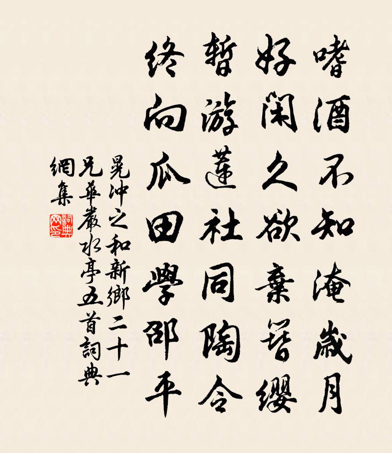 詩詞名句歷史字典書法欣賞書法字典國語詞典說文解字康熙字典古漢語字典標 題 作 者 詩 句 和新鄉二十一兄華嚴水亭五首作者:晃沖之 朝代:宋代原文嗜酒不知淹歲月,好閒久欲棄簪纓。暫游蓮社同陶令,終向瓜田學邵平。詩詞問答問:《和新鄉二十一兄華嚴水亭五首》的作者是誰?答:晃沖之問:該詩寫於哪個朝代?答:宋代書法欣賞和新鄉二十一兄華嚴水亭五首書法作品詩詞推薦酬令狐郎中見寄李商隱〔唐代〕望郎臨古郡,佳句灑丹青。應自丘遲宅,仍過柳惲汀。封來江渺渺,信去雨冥冥。句曲聞仙訣,臨川得佛經。朝吟黃筌畫屏李石〔宋代〕阿筌千頃本胸中,學道分明畫手同。筆削來追麟獲後,丹青為洗馬群空。登堂欲與修遺履,空戶何由返大弓。尚有寓嘆陸游〔宋代〕五福惟無富,嗟予得已多。禪房時托宿,酒市每酣歌。詩瘦慵看鏡,棋鏖恐爛柯。殘年猶有幾,切莫負漁蓑。除夕王邁〔宋代〕憶昔都門值歲除,高樓張燭戲呼盧。久依淨社參尊宿,難向新豐認酒徒。天子未知工劃賦,鄰人或倩寫桃符。寒宵建平縣道中項安世〔宋代〕糖甖花開官路香,客子欲歸官路長。稻田水足新秧黃,小麥吐秀南風涼。村村煮酒開官坊,家家禁忌障朁房。門前送郟公甫通判睦州孔武仲〔宋代〕又向東南去,都門奈若何。塵埃京洛久,山水富春多。宴俎夸魚美,書帷待雁過。鵬程休暫息,九萬看騰波。同郭參謀詠崔僕射淮南節度使廳前竹劉長卿〔唐代〕昔種梁王苑,今移漢將壇。蒙籠低冕過,青翠捲簾看。得地移根遠,經霜抱節難。開花成鳳實,嫩筍長魚竿。藹藹送王左丞五絕蔡肇〔宋代〕德星行鬥牛,人物東西夥。太史告占書,發春朝玉座。至後承元煇見和複次韻書病中近況十首方回〔宋代〕往事付杯酒,殘生余幅巾。更須占大衍,久已玩同人。犒少傭奴懶,迎遲過客嗔。悔曾迷宦海,素不媚錢神。董行成佚名〔宋代〕唐懷州河內縣董行成能策賊。有一人從河陽長店,盜行人驢一頭並皮袋。天欲曉,至懷州。行成至街中,見之,叱金陵雜興二百首蘇泂〔宋代〕玉麟堂下柳絲絲,過了春風一半時。行到水鄉應底事,黃鶯飛上杏花枝。游寶稱寺白居易〔唐代〕竹寺初晴日,花塘欲曉春。野猿疑弄客,山鳥似呼人。酒懶傾金液,茶新碾玉塵。可憐幽靜地,堪寄老慵身。迎仙客張可久〔元代〕雲冉冉,草纖纖,誰家隱居山半崦。水煙寒,溪路險。半幅青簾,五里桃花店。碧雲寺乾隆〔清代〕隔嶺別為區,精藍靜以俱。每參相與好,難論有和無。法雨真優渥,碧雲任卷鋪。設云云那碧,迭樹豈非乎?鷓鴣天 詠趙真真楊玉娥唱雙漸諸宮調 青樓集楊立齋〔元代〕煙柳風花錦作園。霜芽露葉玉裝船。誰知皓齒纖腰會,只在輕衫短帽邊。啼玉靨,咽冰弦。五牛身去更無傳。詞人春日拜壠經田家梅堯臣〔宋代〕田家春作日日近,丹杏破纇場圃頭。南嶺禽過北嶺叫,高田水入低田流。桑牙將綻霧露裛,蠶子未浴箱篚收。今我睡起龍輔〔宋代〕下幃恣午睡,怪殺鳥相呼。起來慵刺繡,窗下理菖蒲。出籠鶻濮陽瓘〔唐代〕玉鏃分花袖,金鈴出彩籠。搖心長捧日,逸翰鎮生風。一點青霄里,千聲碧落中。星眸隨狡兔,霜爪落飛鴻。每念送趙給事侄尉丹陽李端〔唐代〕太傅憐群從,門人亦賤回。入官先愛子,賜酒許同杯。淮海春多雨,蒹葭夜有雷。遙知拜慶後,梅尉稱仙才。挽黃通判明叔座主度正〔宋代〕政在伾文過十年,幾多岩穴老英賢。公車牘上皆亨路,夜壑舟移閟下泉。事業鼎彝千古恨,文章衣缽萬燈傳。兌齋名句推薦道不同,不相為謀。孔子弟子《論語·衛靈公篇》 寒夜客來茶當酒,竹爐湯沸火初紅。杜耒《寒夜》 置將不善,壹敗塗地司馬遷《史記·高祖本紀》 情知已被山遮斷,頻倚闌乾不自由。辛棄疾《鷓鴣天·晚日寒鴉一片愁》 胡雁哀鳴夜夜飛,胡兒眼淚雙雙落。李頎《古從軍行》 我亦飄零久!顧貞觀《金縷曲二首》 不知何處火,來就客心然。沈佺期《寒食》 來日綺窗前,寒梅著花未。王維《雜詩三首 / 雜詠三首》 芳林新葉催陳葉,流水前波讓後波。劉禹錫《樂天見示傷微之敦詩晦叔三君子皆有深分因成是詩以寄》 冰雪林中著此身,不同桃李混芳塵;王冕《白梅》