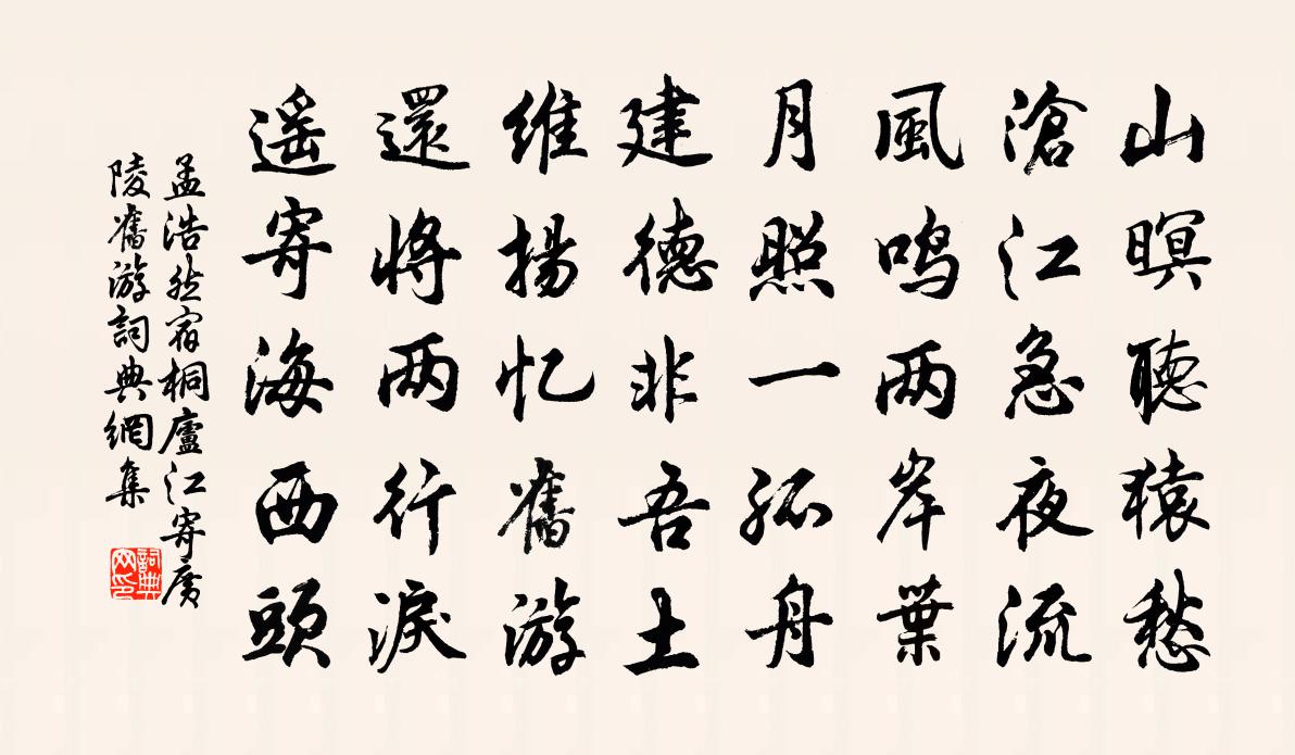 詩題點明是乘舟停宿桐廬江的時候,懷念揚州(即廣陵)友人之作。桐廬江為錢塘江流經桐廬縣一帶的別稱。“山暝聽猿愁,滄江急夜流。”首句寫日暮、山深、猿啼。詩人佇立而聽,感覺猿啼似乎聲聲都帶著愁情。環境的清寥,情緒的黯淡,於一開始就顯露了出來。次句滄江夜流,本來已給舟宿之人一種不平靜的感受,再加上一個“急”字,這種不平靜的感情,便簡直要激盪起來了,它似乎無法控制,而象江水一樣急於尋找它的歸宿。接下去“風鳴兩岸葉,月照一孤舟。”語勢趨向自然平緩了。但風不是徐吹輕拂,而是吹得木葉發出鳴聲,其急也應該是如同江水的。有月,照說也還是一種慰藉,但月光所照,惟滄江中之一葉孤舟,詩人的孤寂感,就更加要被觸動得厲害了。如果將後兩句和前兩句聯繫起來,則可以進一步想像風聲伴著猿聲是作用於聽覺的,月涌江流不僅作用於視覺,同時還必然有置身於舟上的動盪不定之感。這就構成了一個深遠清峭的意境,而一種孤獨感和情緒的動盪不寧,都蘊含其中了。