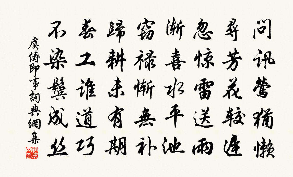 詩詞名句歷史字典書法欣賞書法字典國語詞典說文解字康熙字典古漢語字典標 題 作 者 詩 句 即事作者:虞儔 朝代:宋代即事原文問訊鶯猶懶,尋芳花較遲。忽驚雷送雨,漸喜水平池。竊祿慚無補,歸耕未有期。春工誰道巧,不染鬢成絲。詩詞問答問:即事的作者是誰?答:虞儔問:即事寫於哪個朝代?答:宋代虞儔即事書法欣賞即事書法作品詩詞推薦獨坐王冕〔元代〕獨坐高樓暮,淒涼何所聞?亂山流凍雨,荒樹接孤雲。關陝鴉成陣,幽并馬不群。故人訊息斷,凋弊閔期文。山居二首袁燮〔宋代〕舍北巑屼萬疊青,門前列岫巧相迎。天公有意憐寒士,錫與公侯百雉城。南平教授勾子甲見訪於益昌自言正在華陽時渠度正〔宋代〕頃年應聘漫談經,喜向寒窗訪聚螢。撫字昨慚書下下,佩衿今羨領青青。儻來富貴皆塵土,無盡詩書自日星。珍重崔興宗寫真詠王維〔唐代〕畫君年少時,如今君已老。今時新識人,知君舊時好。王仲儀寄鬥茶梅堯臣〔宋代〕白乳葉家春,銖兩直錢萬。資之石泉味,特以陽芽嫩。宜言難購多,串片大可寸。謬為識別人,予生固無恨。畫贊劉克莊〔宋代〕雖則丹青妙,其如齒髮衰。遠孫元未識,認作古鐘馗。應吳伯秀縣尉教鄞學求詩陳著〔宋代〕四明萬丈崖,佳氣蒸氤氳。融結固有在,特起誰如君。丹霄舞飛霞,青春藹奇芬。目下開五色,剩把天香分。飄颻春詞毛滂〔宋代〕瑣窗朱戶無寒到,長似春光日日來。自是螽斯載風什,可煩簫磬祀高禖。望江南/憶江南李綱〔宋代〕雲嶺水,南北自分流。觸目瀾翻飛雪浪,赴溪盤屈轉瓊鉤。嗚咽不勝愁。歸去客,征騎遠閩州。路入江南春信未,賈節庵冒夏暑越修塗過我苕霅情誼甚厚令聞古牟巘五〔宋代〕君留劍水潯,我臥弁峰下。十書九不到,思君無日夜。和子瞻三游南山九首其四大秦寺蘇轍〔宋代〕大秦遙可說,高虎見秦川。草木埋深谷,牛羊散晚田。山平堪種麥,僧魯不求禪。北望長安市,高城遠似煙。送耕存大參使日本陳深〔宋代〕陸賣初馳詔,終軍已請纓。上方顬委任,南國誦威名。掛席鵬風順,敲舷蜯月明。陽侯應拱記,不遺海濤驚。王沂公輓詞三首宋祁〔宋代〕盡瘁辭當國,均勞得偃藩。幄中留秘畫,天下滿危言。日企還三事,寧圖閟九原。誰將河海淚,一灑問乾坤。任所寄鄉關故舊周敦頤〔宋代〕老子生來骨性寒,宦情不改舊儒酸。停杯厭飲得醪味,舉筋常餐淡菜盤。事冗不知筋力倦,官清贏得夢魂安。故人借雪竇韻送超然居士趙表之時在泐潭釋正覺〔宋代〕一口吸盡西江水,馬師家風擢然起。老龐俯伏嗣芳塵,古也今也誰如此。超然道與若人交,南遊浩意未相饒。風清西明落照釋文珦〔宋代〕幽居面西嶺,窗幾有真趣。睡覺無人聲,殘陽在高樹。逍遙詠宋太宗〔宋代〕隨緣心不見,性各本來真。惡事夸唇頰,愚痴似醉人。忙忙何物有,急急利名親。入定觀浮世,蒼生業感因。劉子履少聊輓辭二首張鎡〔宋代〕釋和書上已經年,敵騎南來果犯邊。太息龜靈成底事,漫聞鴻寶得家傳。平生喜踏天山雪,晚歲愁看瘴浦煙。務實疾邪詩二首趙壹〔兩漢〕其一河清不可恃,人命不可延。順風激靡草,富貴者稱賢。文籍雖滿腹,不如一囊錢。伊優北堂上,骯髒倚門邊。烏江孟遲〔唐代〕中分豈是無遺策,百戰空勞不逝騅。大業固非人事及,烏江亭長又何知。名句推薦彼說長,此說短。不關己,莫閒管。李毓秀《弟子規·信》 秦中花鳥已應闌,塞外風沙猶自寒。王翰《涼州詞二首》 執手相看淚眼,竟無語凝噎。柳永《雨霖鈴·寒蟬淒切》 畫船撐入花深處,香泛金卮。歐陽修《採桑子·荷花開後西湖好》 天門中斷楚江開,碧水東流至此回。李白《望天門山》 流水下灘非有意,白雲出岫本無心。佚名《增廣賢文·上集》 數枝門柳低衣桁,一片山花落筆床。岑參《山房春事二首》 還作一段相思,冷波葉舞愁紅,送人雙槳。吳文英《解蹀躞·醉雲又兼醒雨》 蘭生幽谷,不為莫服而不芳。舟在江海,不為莫乘而不浮。君子行義,不為莫知而止休。劉安及其門客《淮南子·說山訓》 無有定法如來可說。鳩摩羅什譯《金剛經·無得無說》