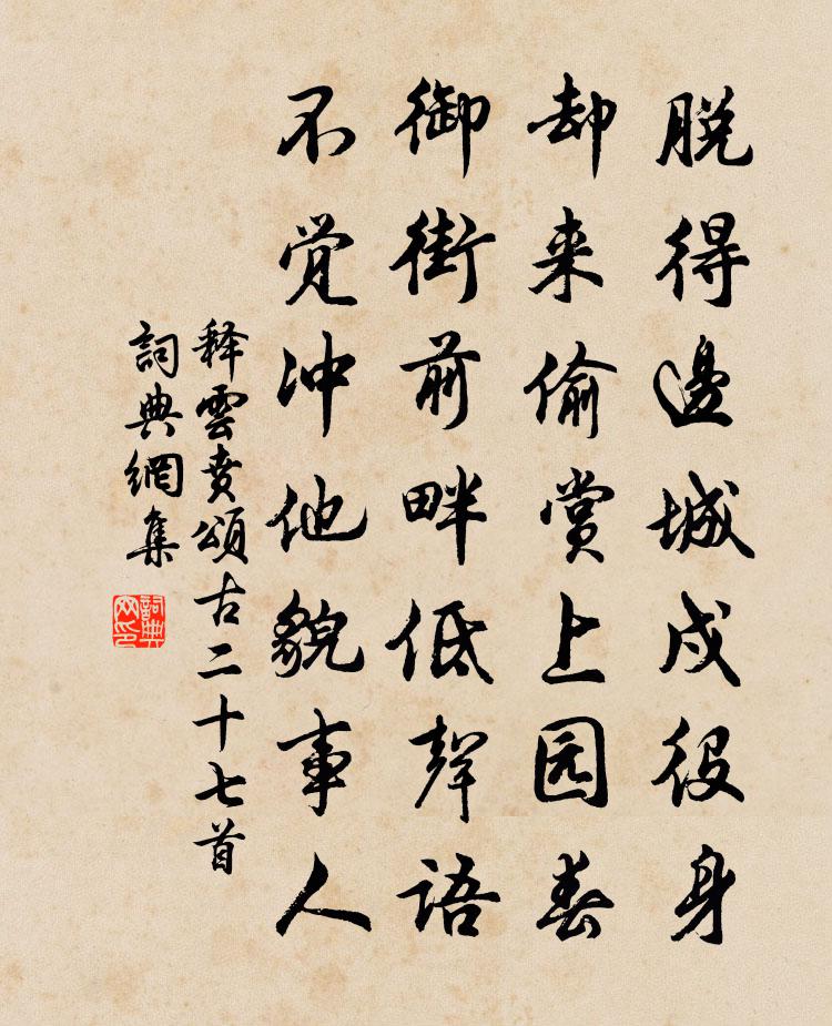 詩詞名句歷史字典書法欣賞書法字典國語詞典說文解字康熙字典古漢語字典標 題 作 者 詩 句 頌古二十七首作者:釋雲賁 朝代:宋代頌古二十七首原文脫得邊城戍役身,卻來偷賞上園春。御街前畔低聲語,不覺沖他貌事人。詩詞問答問:頌古二十七首的作者是誰?答:釋雲賁問:頌古二十七首寫於哪個朝代?答:宋代釋雲賁頌古二十七首書法欣賞頌古二十七首書法作品詩詞推薦石橋楊蟠〔宋代〕金毫五百幾龍尊,隱隱香山聖跡存。方廣寺開無俗路,優曇花現有靈根。一峰突岸臨天壁,雙澗淙橋透石門。今日夏佚名〔宋代〕赤帝旗迎火雲起,南山石裂吳牛死。繡楹夜夜箔蝦須,象榻重重簟湘水。彤彤日腳燒冰井,古陌塵飛野煙靜。漢帝端平甲午踏槐前記夢中作陽枋〔宋代〕莫學寒蛩窗下吟,嗤嗤不作兩般聲。大千世界都聞了,管甚旖龍睡不驚。雨釋智圓〔宋代〕潤物有深功,霏霏下半空。寒聲清入竹,斜勢急因風。苔片添秋碧,花枝損晚紅。山人獨欹枕,靜聽草堂中。次林光朝八月十五日道出南昌寄龔帥實之韻程大昌〔宋代〕聞有挐音掃榻埃,尚疑卻棹酒船回。錦囊忽至詩傳諾,玉塵未交心已開。邂逅四人今楚尾,班聯十載舊蘭台。尊前方廣聖燈次敬夫韻林用中〔宋代〕燈長三世火長明,千里遺蹤子細尋。自是神光能永夜,不妨金偈更降心。旅中過重陽朱慶餘〔唐代〕一歲重陽至,羈游在異鄉。登高思舊友,滿目是窮荒。草際飛雲片,天涯落雁行。故山籬畔菊,今日為誰黃。送李廷尉濠梁王令〔宋代〕直道無適可,小官真漫論。夫君自行義,而我更何言。獨柱難為刀,橫流不奈渾。此心持送子,飲淚檔前樽。大人生朝六首寅孫項安世〔宋代〕岧嶢丹闕六龍飛,浩蕩鴻私下九圍。花結初頒紅錦帙,寶香新拜綠荷衣。未曾賀剌周閭里,又報升柴享禁闈。千歲吊賈島二首曹松〔唐代〕先生不折桂,謫去抱何冤。已葬離燕骨,難招入劍魂。旅墳低卻草,稚子哭勝猿。冥寞如搜句,宜邀賀監論。青旆泛舟陸游〔宋代〕水長芳洲沒,風生釣艇橫。偶尋東埭去,卻作北村行。宿鳥昏方定,流螢雨更明。歸來未覺晚,傳漏下重城。鄧隱老木寒牛文同〔宋代〕蒼崖稜層草芊綿,巨木半死生枯煙。羸牛日晚已噍草,稚子天寒猶打錢。詠史羅隱〔唐代〕蠹簡遺編試一尋,寂寥前事似如今。徐陵筆硯珊瑚架,趙勝賓朋玳瑁簪。未必片言資國計,只應邪說動人心。九原江上與故人暫會復別釋文珦〔宋代〕交朋似君少,澹泊自真宗。不記何年別,翻驚此地逢。煙波涵暮景,霜露改秋容。又說天台去,天台千萬峰。入祁陽縣界即事李曾伯〔宋代〕境入祁陽驛堠迢,道旁煙火頓蕭蕭。茅岡叢篠路磊砢,蓬舍扃柴人寂寥。市粒頗艱緣歲儉,野芳交發自春饒。扶藜次韻李公擇九日見約以疾不赴蘇轍〔宋代〕它年逢九日,杯酒逐英豪。漸老經秋病,獨醒何處高。床頭添藥里,坐上減牛毛。寂寞知誰問,煩公置濁醪。傷春詞寄紫元四首白玉蟾〔宋代〕望眼生花淚已枯,青衣也合遞歸書。客情無奈春風雨,更問春空有雁無。一室鄭會〔宋代〕坐眠惟一室,貧與病相依。風急夜沽酒,月明秋搗衣。異鄉身是寄,久客事俱非。忽忽誰可語,滿庭黃葉飛。滿江紅 病中又次前韻劉敏中〔元代〕北去南來,凡幾度、風沙行李。離又合、新歡舊恨,古今何已。風*俄瞻衡宇外,月明照見寒江底。問朱絲白雪尚贈雲卿趙蕃〔宋代〕乃翁里居時,曾上廬山牘。懷賢訪其孤,今值詞人牧。我嘗愛臨川,韓草刊於陸。爾侯古雅趣,與陸堪並躅。而翁名句推薦至誠之道可以前知。國家將興,必有禎祥;國家將亡,必有妖孽。子思《中庸·第二十四章》 花枝出建章,鳳管發昭陽。皇甫冉《婕妤怨》 玉皇開碧落,銀界失黃昏。毛滂《臨江仙·都城元夕》 春路雨添花,花動一山春色。秦觀《好事近·夢中作》 對茲佳品酬佳節,桂拂清風菊帶霜。曹雪芹《螃蟹詠》 彭蠡湖天晚,桃花水氣春。白居易《彭蠡湖晚歸》 終日昏昏醉夢間,忽聞春盡強登山。李涉《題鶴林寺僧舍》 西風潑眼山如畫,有黃花休恨無錢。張可久《風入松·九日》 洞門高閣靄餘輝,桃李陰陰柳絮飛。王維《酬郭給事 / 贈郭給事》 擊楫中流,曾記淚沾裳李好古《江城子·平沙淺草接天長》