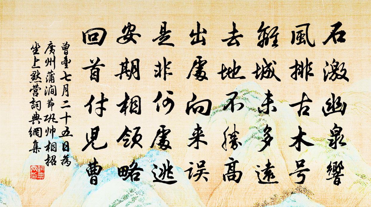詩詞名句歷史字典書法欣賞書法字典國語詞典說文解字康熙字典古漢語字典標 題 作 者 詩 句 七月二十五日為廣州蒲澗節鞏帥相招坐上默營作者:曾豐 朝代:宋代原文石激幽泉響,風排古木號。離城未多遠,去地不勝高。出處向來誤,是非何處逃。安期相領略,回首付兒曹。詩詞問答問:《七月二十五日為廣州蒲澗節鞏帥相招坐上默營》的作者是誰?答:曾豐問:該詩寫於哪個朝代?答:宋代書法欣賞七月二十五日為廣州蒲澗節鞏帥相招坐上默營書法作品詩文賞析【原題】:七月二十五日為廣州蒲澗節鞏帥相招坐上默營兩詩詩詞推薦贈談命姚月壺黃庚〔宋代〕胸中訊息千年歷,舌底窮通一世人。試把五行推測看,廣文官冷幾時春。句黃康民〔宋代〕三山寶剎棲禪地,萬戶青簾賣酒家。禮大梅塔釋紹曇〔宋代〕即心即佛已隨邪,況與龐翁亂撒沙。茅舍從茲混塵跡,老梅羞放雪中花。題勇老退居院王安石〔宋代〕道人投老寄山林,偶坐翛然洗我心。夢境此身能且在,明年寒食更相尋。暖酒李白〔唐代〕熱暖將來鑌鐵文。暫時不動聚白雲。撥卻白雲見青天。掇頭裡許便成仙。靈岩寺兼簡重元長老二劉居士曾鞏〔宋代〕法定禪房臨峭合,辟支靈塔冠層巒。軒窗勢聳雲林合,鐘磬聲高鳥道盤。白鶴已飛泉自涌,青龍無跡洞常寒。更聞和林肅翁有所思韻劉克莊〔宋代〕少豪曾挾一筇游,晚似龐公怕入州。橡栗尚煩天賦粟,茅柴如以水澆愁。何妨范史書鉤黨,不願歐碑說解仇。自古余將南歸燕趙諸公子攜妓把酒錢別醉中作把酒汪元量〔宋代〕我把酒,聽君歌。美人娟娟花灼灼,月照金樽光綽約。有酒有歌君亦愁,把酒聽歌君亦樂。我有鸚鵡杯,君有鸕鶿月出佚名〔先秦〕月出皎兮。佼人僚兮。舒窈糾兮。勞心悄兮。月出皓兮。佼人懰兮。舒憂受兮。勞心慅兮。月出照兮。佼人燎兮。橄欖歐陽修〔宋代〕五行居四時,維火盛南訛。炎焦陵木氣,橄欖得之多。酸苦不相入,初爭久方和。霜包入中州,萬里來江波。幸登喜遷鶯佚名〔宋代〕利名拋卻。入廣莫鄉閭,委蛇盤礴。水曲山隈,煙村雲屋,隨分葛衣藜藿。任他玉堂軒冕,爭似茅廬丘壑。志廖廓聞李泰發參政得旨自便將歸以詩迓之曾幾〔宋代〕苦遭前政墮危機,二十餘年詠式微。天上謫仙皆欲殺,海濱大老竟來歸。故園松菊猶存否,舊日人民果是非。最小瓶梅趙蕃〔宋代〕紙窗見月影橫斜,不是桃花與李花。一夜清吟忘客睡,只愁到曉鬢雙華。答韓翃柳氏〔唐代〕楊柳枝,芳菲節,可恨年年贈離別。一葉隨風忽報秋,縱使君來豈堪折。幽居雜題陸游〔宋代〕獨往成初志,安居謝世紛。名書硬黃紙,古硯熨焦紋。雨作占琴薦,風來散鷺群。豈無朝市事,塞耳未曾聞。和友人惠詩陳普〔宋代〕萬事無非理數成,吾徒但向此研精。介鱗有分當鹹若,麟鳳何緣許瘦生。愧我詩書空盜竊,喜群學易有功程。相逢玉女峰周載〔宋代〕誰將玉女對妝檯,曲水分明一鑒開。鐵石肺腸塵夢斷,任他雲雨逐人來。余博士家貓相乳歌戴表元〔宋代〕上饒余宗鐘鼎家,孫枝十世猶清華。南昌博士最賢者,膝下燁燁開緋牙。我行其庭值供頓,食指半千聲不嘩。女帨古記/如夢令佚名〔宋代〕疑是水晶宮殿。雲女天仙寶宴。吟賞欲黃昏,風送一聲羌管。煙淡。霜淡。月在畫樓西畔。寄盧進士華岳〔宋代〕丈夫策定在吳鉤,浪把橋門作勝游。采筆誤人隨驥尾,錦標還我占鰲頭號。關山夢寐三千里,竹帛功名四十秋。安名句推薦愛人利人以得福者有矣,惡人賊人以得禍者,亦有矣。墨子《墨子·04章 法儀》 天下之百姓皆上同於天子,而不上同於天,則災猶未去也。墨子《墨子·11章 尚同(上)》 又是重陽近也,幾處處,砧杵聲催。秦觀《滿庭芳·碧水驚秋》 移舟水濺差差綠,倚檻風擺柄柄香鄭谷《蓮葉》 送數聲驚雁,下離煙水,嘹唳度寒雲。孔夷《南浦·旅懷》 煢煢孑立,形影相弔。西晉·李密《陳情表》 人間萬事,毫髮常重泰山輕。辛棄疾《水調歌頭·壬子三山被召陳端仁給事飲餞席上作》 怨別自驚千里外,論交卻憶十年時。高適《東平別前衛縣李寀少府 / 送前衛縣李宷少府》 昨夢西湖,老扁舟身世。吳文英《拜星月慢·林鐘羽姜石帚以盆蓮數十置中庭宴客其中》 湖清霜鏡曉,濤白雪山來。李白《送友人尋越中山水》
