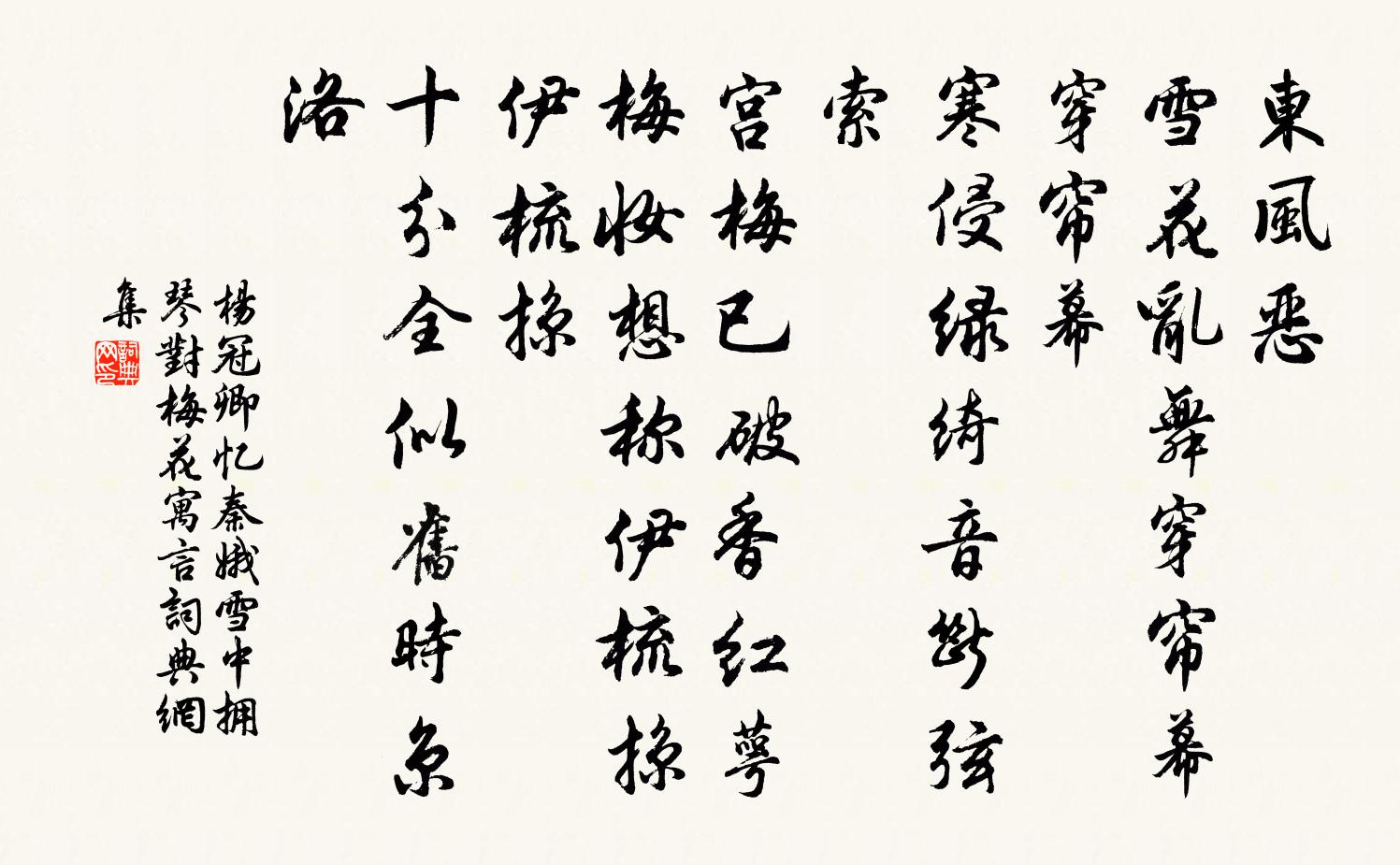詩詞名句歷史字典書法欣賞書法字典國語詞典說文解字康熙字典古漢語字典標 題 作 者 詩 句 憶秦娥(雪中擁琴對梅花寓言)作者:楊冠卿 朝代:宋代原文東風惡。雪花亂舞穿簾幕。穿簾幕。寒侵綠綺,音斷弦索。宮梅已破香紅萼。梅妝想稱伊梳掠。伊梳掠。十分全似,舊時京洛。詩詞問答問:《憶秦娥(雪中擁琴對梅花寓言)》的作者是誰?答:楊冠卿問:該詩寫於哪個朝代?答:宋代問:該詩是什麼體裁?答:詞書法欣賞憶秦娥(雪中擁琴對梅花寓言)書法作品詩詞推薦鷓鴣天朱敦儒〔宋代〕至節先庚欲雪天。玳筵圍錦帳青氈。嫖姚副帥招佳客,太守高明別乘賢。歌宛轉,舞蹁遷。金釵十二擁嬋娟。老人池塘七夕溫庭筠〔唐代〕月出西南露氣秋,綺羅河漢在斜溝。楊家繡作鴛鴦幔,張氏金為翡翠鉤。香燭有花妨宿燕,畫屏無睡待牽牛。萬家溜港灘楊萬里〔宋代〕此去嚴州只半程,一江分作兩江橫。忽驚洲背青山下,卻有帆檣地上行。酬令裕見寄之什李呂〔宋代〕伯才不鼓琴,良為知音撤。淵明琴無弦,荊扉晝常閉。吾道傳滄洲,初不待識別。叔孫志諧俗,禮樂用綿蕝。子陵詠雞頭員興宗〔宋代〕桃李妍眾目,取次紅綠插。練練湖中姿,佳菓須作鐵。名字勝且高,意亦倣雞舌。黧面君莫侮,滿腹珠璣列。昔者寄萬先輩釋清壹〔宋代〕歸從衡岳此身清,老校群書眼倍明。白屋有田供伏臘,青雲無夢到公卿。頻挑野菜招僧至,少著深衣入郭行。早歲送敏中新授戶部員外郎西歸白居易〔唐代〕千里歸程三伏天,官新身健馬翩翩。行沖赤日加餐飯,上到青雲穩著鞭。長慶老郎唯我在,客曹故事望君傳。前鴻小園招隱錢起〔唐代〕支離鮮兄弟,形影如手足。但遂飲冰節,甘辭代耕祿。斑衣在林巷,始覺無羈束。交柯低戶陰,閒鳥將雛宿。窮通紫岩雜詠濺石曾協〔宋代〕淅瀝排炎暑,潺湲弄晚晴。不知來遠近,常作對床聲。送前歙黟楚□□五首方回〔宋代〕儒者書隱公,昔持浙西節。按一青溪令,聞者膽為裂。先聲到江東,庶亦有旌別。似聞復留中,駸駸管喉舌。君可濟州過趙叟家宴王維〔唐代〕雖與人境接,閉門成隱居。道言莊叟事,儒行魯人餘。深巷斜暉靜,閒門高柳疏。荷鋤修藥圃,散帙曝農書。上客臨終頌朱道人〔宋代〕我是殺心漢,從來無侶伴。塵土不沾身,坐地教人看。相和歌辭雜怨三首孟郊〔唐代〕夭桃花清晨,游女紅粉新。夭桃花薄暮,游女紅粉故。樹有百年花,人無一定顏。花送人老盡,人悲花自閒。貧女宴瓊林(東湖春日)黃裳〔宋代〕遽暖間俄寒,妙用向園林,難問春意。萬般聲與色,自聞雷、便作浮華人世。紅嬌翠軟,誰頓悟、天機此理。似韶詠風張祜〔唐代〕搖搖歌扇舉,悄悄舞衣輕。引笛秋臨塞,吹沙夜繞城。向峰迴雁影,出峽送猿聲。何似琴中奏,依依別帶情。雪晴至後園陸游〔宋代〕病扶藤杖覓殘梅,牢落情懷怕酒杯。約束園丁勤灑掃,迎年作意待春來。再和寄藍六黃庭堅〔宋代〕南極一星淮上老,承家令子氣橫秋。萬端只要稱心耳,五鼎何如委吏優。海燕催歸人作社,江花欲動雨含愁。追思過薛舍人舊隱鮑溶〔唐代〕寢門來哭夜,此月小祥初。風意猶憶瑟,螢光乍近書。牆蒿藏宿鳥,池月上鉤魚。徒引相思淚,涓涓東逝餘。偈傾一百三十三首釋法薰〔宋代〕禁足護生,西在此土。儘是死門,終非活路。梅花洪邁〔宋代〕山深春未動,沙淺水欲冰。玉梅於此時,靚妝略無朋。露蕊欲的皪,月枝持鬅鬙。儼如江漢女,可愛不可陵。他年名句推薦眉睫才交,夢裡便不能張主;眼光落地,泉下又安得分明。陳繼儒《小窗幽記·集醒篇》 二月春花厭落梅。仙源歸路碧桃催。渭城絲雨勸離杯。晏幾道《浣溪沙·二月春花厭落梅》 舉觴酹先酒,為我驅憂煩。柳宗元《飲酒》 十五入漢宮,花顏笑春紅。李白《怨歌行》 東邊日出西邊雨,道是無晴卻有晴。劉禹錫《竹枝詞二首·其一》 娶妻無媒毋須恨,書中自有顏如玉。趙恆《勸學詩》 盈盈一點芳心,占多少春光,問卿知否?紅妝莫斗顧太清《玉燭新·白海棠》 文章憎命達,魑魅喜人過。杜甫《天末懷李白》 識時務者為俊傑,昧先幾者非明哲。程登吉《幼學瓊林·卷三·人事》 翠娥執手送臨歧,軋軋開朱戶柳永《採蓮令·月華收》