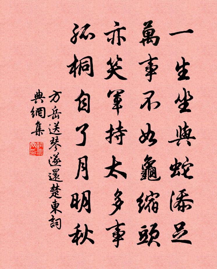 詩詞名句歷史字典書法欣賞書法字典國語詞典說文解字康熙字典古漢語字典標 題 作 者 詩 句 送琴遂還楚東作者:方岳 朝代:宋代送琴遂還楚東原文一生坐與蛇添足,萬事不如龜縮頭。亦笑軍持太多事,孤桐自了月明秋。詩詞問答問:送琴遂還楚東的作者是誰?答:方岳問:送琴遂還楚東寫於哪個朝代?答:宋代方岳送琴遂還楚東書法欣賞送琴遂還楚東書法作品詩詞推薦辛酉歲冬十一月隨駕幸岐下作韓偓〔唐代〕曳裾談笑殿西頭,忽聽征鐃從冕旒。鳳蓋行時移紫氣,鸞旗駐處認皇州。曉題御服頒群吏,夜發宮嬪詔列侯。雨露演繹吟邵雍〔宋代〕何者是真金,真金入骨沉。飽曾經煅煉,足得不沉吟。到手何須眼,行身敢放心。放心然後樂,天下有知音。逐貧賦揚雄〔兩漢〕揚子遁居,離俗獨處。左鄰崇山,右接曠野,鄰垣乞兒,終貧且窶。禮薄義弊,相與群聚,惆悵失志,呼貧與語:黃彥與從無逸求妻埋銘以研謝之無逸邀予作歌董瞿老〔宋代〕君不見昌黎翁,南遷益覺文章工。滑稽戲作毛潁傳,陶泓之族稱宏農。又不見東坡翁,生涯寄食破研中。詆訶龍尾北園會客不飲曾鞏〔宋代〕畫橋南北水西東,高下花枝綠間紅。殢得春風人盡醉,獨醒誰似白頭翁。華蓋仙山院徐自明〔宋代〕萬當不如一,十發卻休九。乃知多言累,寧謹三緘口。寂中洊雷震,悟處獅子吼。百物自四時,六鑿通九有。風松邵伯阻風小泊贈送行諸公陳造〔宋代〕長征每愛日,小泊未遻意。陰風自南北,客子咱軒輊。召棠望吾鄉,不作秦越異。船閣雁鶩洲,人穿魚暇市。相逢題靈祐上人法華院木蘭花(其樹嶺南,移植此地)劉長卿〔唐代〕庭種南中樹,年華幾度新。已依初地長,獨發舊園春。映日成華蓋,搖風散錦茵。色空榮落處,香醉往來人。菡萏送徑山圓兄亂後歸鄉釋紹曇〔宋代〕故國類塵慘甲兵,勞生終日望昇平。軍持帶得龍淵水,歸去何妨一洗清。寄武康王居正仇遠〔宋代〕曾向清溪采白苹,江東日暮別經春。投金瀨上思歸客,浮玉山前憶故人。千里雲萍應念我,一庭風樹敢忘親。掛蓑偶得吟邵雍〔宋代〕集大成人不肯模,卻行何異棄金車。便言天下無難事,豈信人間有丈夫。天意須時為善計,人情安處是良圖。天人酬玉汝吳汝弌〔宋代〕日暮雲倒飛,苦雨濕茅屋。奇哉五碎金,青草眠黃犢。天行貴葆真,心骨迥凡俗。一尺 * 花,秋風播芳馥。秋思周賀〔唐代〕楊柳已秋思,楚田仍刈禾。歸心病起切,敗葉夜來多。細雨城蟬噪,殘陽嶠客過。舊山餘業在,杳隔洞庭波。響屧廊楊備〔宋代〕步步香翻羅襪塵,粉紅花艷滿宮春。傾城一笑無遺蹟,不見長廊響屧人。游擘翠杜范〔宋代〕新晴山色淨襟裾,世上塵埃一點無。飛瀑驚奔爭澒洞,層崖屹立鎮崯嶇。亂流平處沙可數,頑石叢中草不枯。醉後句蘇仲昌〔宋代〕高城倒影下無地,秋水涵空長有天。懷王彥博徐審知趙蕃〔宋代〕遮眼文書倦,可人親友賒。寸疏無更有,鴉斷直還斜。兩鬢寧禁白,餘生孰可涯。關餘三作徑,愧爾五其車。頌古十二首釋法泰〔宋代〕十分風采露堂堂,玉蘂瓊華未比量。剛被傍人論好醜,因茲難嫁與潘郎。至日記見簡輔漢卿二首敖陶孫〔宋代〕滿窗晴旭散輕埃,報答生成只酒杯。篇什正須今日用,歲時偏傍俗人來。輕舠上藕泥初拭,小巷爭魚臭不開。試作泊龍灣陳造〔宋代〕小灣隱沙觜,沙外仍奔湍。是間以龍名,信乃龍所蟠。浮煙澹寒鑒,斷岸圍清瀾。孰知面勢要,中有水府寬。我來名句推薦長記曾攜手處,千樹壓、西湖寒碧。姜夔《暗香·舊時月色》 浮雲終日行,遊子久不至。杜甫《夢李白二首·其二》 握手西風淚不乾,年來多在別離間。納蘭性德《於中好·送梁汾南還為題小影》 鏡水夜來秋月,如雪。溫庭筠《荷葉杯·鏡水夜來秋月》 意得則舒懷以命筆,理伏則投筆以卷懷劉勰《文心雕龍·養氣》 山高月小,水落石出。蘇軾《後赤壁賦》 晝成淒黯,雁飛過、垂楊轉青。吳文英《慶 * ·秋感》 傍鄰聞者多嘆息,遠客思鄉皆淚垂。李頎《聽安萬善吹觱篥歌》 只在此山中,雲深不知處。賈島《尋隱者不遇 / 孫革訪羊尊師詩》 材愨者常安利,盪悍者常危害荀子《荀子·榮辱》