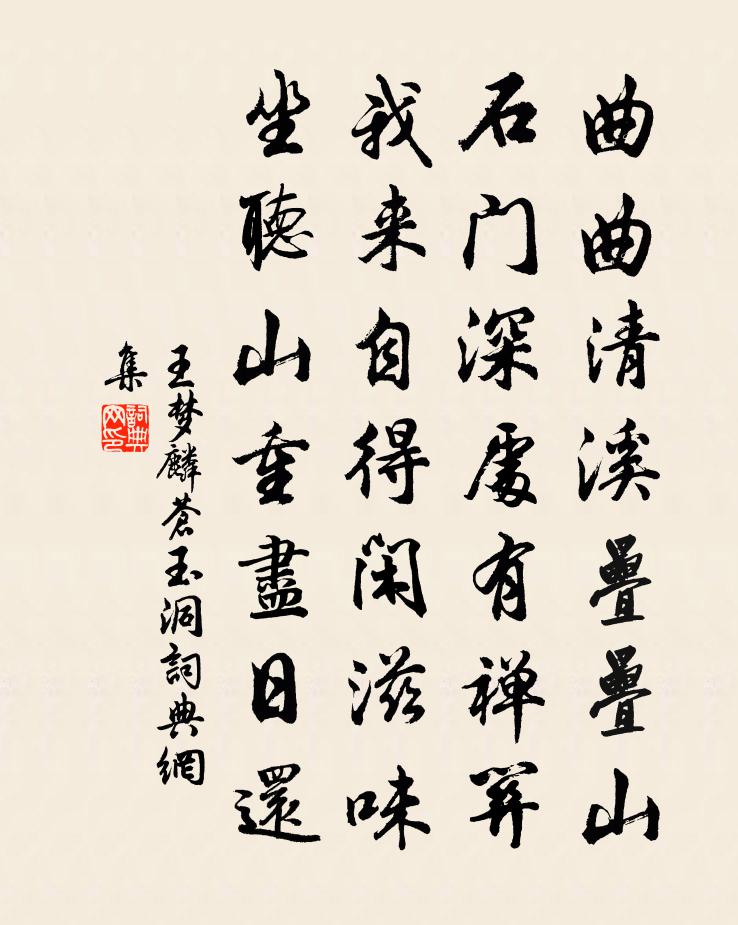 詩詞名句歷史字典書法欣賞書法字典國語詞典說文解字康熙字典古漢語字典標 題 作 者 詩 句 蒼玉洞作者:王夢麟 朝代:元代蒼玉洞原文曲曲清溪疊疊山,石門深處有禪關。我來自得閒滋味,坐聽山重盡日還。詩詞問答問:蒼玉洞的作者是誰?答:王夢麟問:蒼玉洞寫於哪個朝代?答:元代問:蒼玉洞是什麼體裁?答:七絕王夢麟蒼玉洞書法欣賞蒼玉洞書法作品詩詞推薦須菩提贊釋心月〔宋代〕常宴坐,常危立。一片虛凝,萬境空寂。岩前花雨已狼籍。送友人游湘中齊己〔唐代〕懷才難自住,此去亦如僧。何處西風夜,孤吟旅舍燈。路沿湘樹疊,山入楚雲層。若有東來札,歸鴻亦可憑。倚樓趙汝鐩〔宋代〕蒹葭秋色晚,百尺倚江樓。日暗煙藏寺,風高浪拍舟。歸雲投遠嶺,飢雁叫滄洲。心事非年少,塵埃白盡頭。在西國懷王舍城(一三五七九言)義淨〔唐代〕游,愁。赤縣遠,丹思抽。鷲嶺寒風駛,龍河激水流。既喜朝聞日復日,不覺頹年秋更秋。已畢耆山本願城難遇,海豐道中白玉蟾〔宋代〕海近疑無地,山長盡有天。蛇崗嵐霧濕,魚市水風膻。苔色陪岩草,榕陰冒浦蓮。由來金翠盛,遮莫酌貪泉。宿雲門寺閣孫逖〔唐代〕香閣東山下,煙花象外幽。懸燈千嶂夕,卷幔五湖秋。畫壁餘鴻雁,紗窗宿鬥牛。更疑天路近,夢與白雲遊。游虎丘林拱中〔宋代〕我來一榻羨危亭,倦步支頤竹杖輕。僧聽鐘聲歸寺急,鴉爭林宿壓枝鳴。禪機擊撥如鋒起,塵袂驅除似水清。風定感事懷人送春病酒曉起五首劉學箕〔宋代〕把酒傷春事,何人慰寂寥。才高融未薦,魂斷玉空招。賦就青陽曲,吟成白紵謠。拊欄三太息,幽雅憤幾磨消。次韻張季長紅梅七言三首李壁〔宋代〕琳館清閒異馬曹,紅梅折得助揮毫。眼明北客初疑杏,笑倚東風亦類桃。露浥檀心滋鼎實,春生玉面散宮醪。從今句王溥〔宋代〕兩制只官三十客,自憐榮耀老萊衣。又向靈台飲福杯。禪人並化主寫真求贊釋正覺〔宋代〕兀兀堆堆,髑髏眼開。全身放下,借伴還來。一彈指響流通句,樓閣門門見善財。句餘子畏〔宋代〕若知瓦礫樂成道,便覺珠璣不屬君。勖曹生盧鉟〔唐代〕桑扈交飛百舌忙,祖亭聞樂倍思鄉。尊前有恨慚卑宦,席上無憀愛艷妝。莫為狂花迷眼界,須求真理定心王。游蜂蝶戀花(別恨)吳禮之〔宋代〕急水浮萍風裡絮。恰似人情,恩愛無憑據。去便不來來便去。到頭畢竟成輕負。簾卷春山朝又暮。鶯燕空忙,不念宿清遠峽山寺宋之問〔唐代〕香岫懸金剎,飛泉屆石門。空山唯習靜,中夜寂無喧。說法初聞鳥,看心欲定猿。寥寥隔塵市,何異武陵源。三清閣吳愈〔宋代〕廬山之勝,秀出斗旁。參于衡岳,鎮東南方。民人所瞻,神天攸宅。齎夢之祥,乃興自昔。惟天聰明,矜此下民。晦日宴高氏林亭高瑾〔唐代〕試入山亭望,言是石崇家。二月風光起,三春桃李華。鶯吟上喬木,雁往息平沙。相看會取醉,寧知還路賒。次韻黃岩高志尹寄壽陳著〔宋代〕冠屨天地間,車笠風雲從。我行半東南,已復八十翁。取友必端人,求我我蒙童。初見老不化,宿學今何功。萬丈道可道者釋祖欽〔宋代〕道可道,非常道。名可名,非常名。名既非常,如器中鍠。道既非常,如日之光。如器中鍠,聲出於內。如日之光古意六首艾性夫〔宋代〕匆匆採桑女,花雨濕襜袖。春風十二弦,生世未觸手。名句推薦昔年多病厭芳尊,今日芳尊惟恐淺。錢惟演《木蘭花·城上風光鶯語亂》 漢女輸橦布,巴人訟芋田。王維《送梓州李使君》 天平山上白雲泉,雲自無心水自閒。白居易《白雲泉》 醉後滿身花影、倩人扶。晏幾道《虞美人·疏梅月下歌金縷》 幅巾藜杖北城頭,捲地西風滿眼愁。陸游《秋晚登城北樓》 白馬繞旌旗,悲鳴相追攀。李白《豫章行》 聽於無聲,視於無形。戴聖《禮記·曲禮上》 相見易得好,久住難為人。佚名《增廣賢文·上集》 一叫一迴腸一斷,三春三月憶三巴。李白《宣城見杜鵑花 / 子規》 道由白雲盡,春與青溪長。劉昚虛《闕題》
