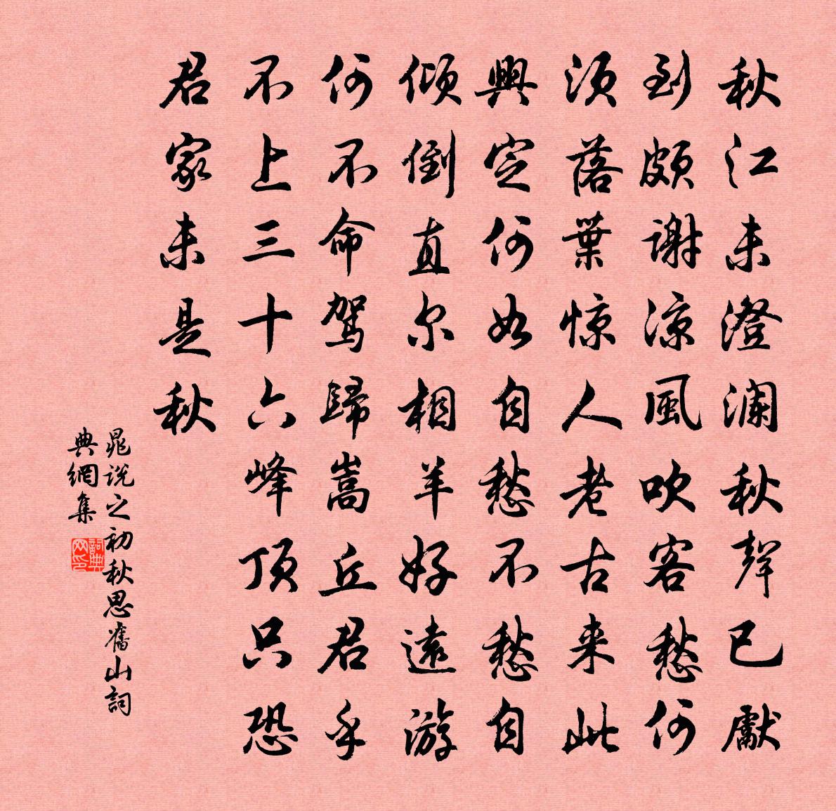 詩詞名句歷史字典書法欣賞書法字典國語詞典說文解字康熙字典古漢語字典標 題 作 者 詩 句 初秋思舊山作者:晁說之 朝代:宋代初秋思舊山原文秋江未澄瀾,秋聲已先到。頗謝涼風吹客愁,何須落葉驚人老。古來此興定何如,自愁不愁自傾倒。直爾相羊好遠遊,何不命駕歸嵩丘。君乎不上三十六峰頂,只恐君家未是秋。詩詞問答問:初秋思舊山的作者是誰?答:晁說之問:初秋思舊山寫於哪個朝代?答:宋代晁說之初秋思舊山書法欣賞初秋思舊山書法作品詩詞推薦延平粹廳十詠飛霞陳宓〔宋代〕小閣本非寬,宇宙在其內。心與太初鄰,不假飛霞佩。和顏長官百詠客路朱繼芳〔宋代〕送窮不去奈窮何,山有荊榛水有波。萬物得時人自老,梁鴻頭白五噫歌。減字木蘭花(私情)黃庭堅〔宋代〕終宵忘寐。好事如何猶尚未。子細沈吟。珠淚盈盈濕袖襟。與君別也。願在郎心莫暫舍。記取盟言。聞早回程卻再酬盩厔耿少府湋見寄戴叔倫〔唐代〕方丈蕭蕭落葉中,暮天深巷起悲風。流年不盡人自老,外事無端心已空。家近小山當海畔,身留環衛蔭牆東。遙聞督下麥雨中夜歸陸游〔宋代〕細雨闇村墟,青煙濕廬舍。兩兩犢並行,陣陣鴉續下。紅稠水際蓼,黃落屋邊柘。力作不知勞,歸路忽已夜。犬吠詠梅六首趙蕃〔宋代〕幾日寒如許,梅花好在不。汝雖甘寂寞,吾自念深幽。靜塢無車馬,清溪足鷺鷗。何當細扶杖,隨處小遲留。再次韻十首陳造〔宋代〕朝家無闕政,秋萗繼春雩。恤緯憐吾怯,知言敢自誣。閉陰寧董傅,為己肯楊朱。未斷蝸緣壁,仍多豕負塗。拜星月/拜星月慢佚名〔宋代〕賀新春,盡帶春花、春旛春勝,是處春光明媚。偈七首釋法泰〔宋代〕火雲燒田苗,泉源絕流注。婆竭大龍王,不知在何處。秋日旅懷寄右省鄭拾遺王貞白〔唐代〕永夕愁不寐,草蟲喧客庭。半窗分曉月,當枕落殘星。鬢髮游梁白,家山近越青。知音在諫省,苦調有誰聽。平山堂杜東〔宋代〕平山堂下水雲重,孤笛淒涼淡月中。不見龍蛇飛素壁,只科狐兔戍離宮。仙翁已逐風流盡,世事俱隨夢幻空。廣武即目·萬笏尖中路林則徐〔清代〕萬笏尖中路漸成,遠看如削近還平。不知身與諸天接,卻訝雲從下界生。飛瀑正拖千嶂雨,斜陽先放一峰晴。眼前將至泗上微雪快晴吳則禮〔宋代〕僧伽憐吾來,娛我六出英。又復憂吾寒,迎我以好晴。何以謝僧伽,汲水添淨瓶。送河北轉運使陳修撰學士梅堯臣〔宋代〕河隍多宿兵,兵食固所須。幸時不戰鬥,畜養安可無。古興十萬師,七十萬家輟耕鋤。今來歲調餉,且與往昔殊。行香子·三山作辛棄疾〔宋代〕好雨當春,要趁歸耕。況而今、已是清明。小窗坐地,側聽檐聲。恨夜來風,夜來月,夜來雲。花絮飄零。鶯燕丁雜興四首於石〔宋代〕屋上青山屋下雲,清泉為鏡石為屏。客來問我謀生計,一卷家傳相鶴經。又登碧雲亭感懷三十首吳芾〔宋代〕晚上危亭喜有秋,民安物阜本無憂。鈴齋坐嘯雖多暇,爭似歸田得自由。白薴舞詞張憲〔元代〕吳宮美人青犢刀,自裁白薴制舞袍。輕雲冉冉白勝雪,《激楚》一曲迴風高。九雛鳳釵篸紫玉,長裾窄腰蓮步促。挽歐陽夫人許氏二首黃公度〔宋代〕斷機貽子訓,截髮具賓盤。異數行開邑,他鄉忽蓋棺。薤歌春日晚,萱樹北堂寒。蕭瑟青門道,萊衣淚不乾。送張芝卿陳師道〔宋代〕相逢已偶爾,告別更蒼然。離合驚時換,行藏乃世緣。君無學乾祿,我亦賦歸田。泗水秋山外,長安夕照邊。名句推薦莫笑賤貧夸富貴,共成枯骨兩何如?白居易《放言五首·其四》 因思杜陵夢,鳧雁滿回塘。溫庭筠《商山早行》 香爐初上日,瀑水噴成虹。孟浩然《彭蠡湖中望廬山》 高峰入雲,清流見底陶弘景《答謝中書書》 奉勸世間夫婦,固不可彼此相仇,亦不可過於情篤。沈復《浮生六記·坎坷記愁》 常人安於故習,學者溺於所聞。商鞅《商君書·更法》 渡口雙雙飛白鳥,煙裊,蘆花深處隱漁歌。閻選《定風波·江水沉沉帆影過》 斜髻嬌娥夜臥遲,梨花風靜鳥栖枝。唐寅《美人對月》 別院深深夏席清,石榴開遍透簾明。蘇舜欽《夏意》 玉爐香,紅蠟淚,偏照畫堂秋思。溫庭筠《更漏子·玉爐香》