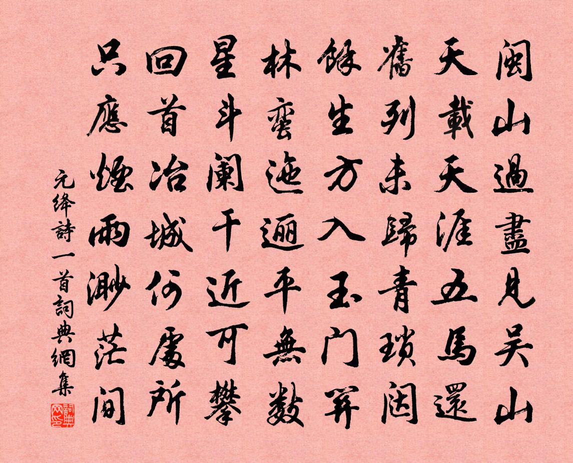 詩詞名句歷史字典書法欣賞書法字典國語詞典說文解字康熙字典古漢語字典標 題 作 者 詩 句 詩一首作者:元絳 朝代:宋代詩一首原文閩山過盡見吳山,天載天涯五馬還。舊列未歸青瑣闥,餘生方入玉門關。林蠻迤邐平無數,星斗闌乾近可攀。回首冶城何處所,只應煙雨渺茫間。詩詞問答問:詩一首的作者是誰?答:元絳問:詩一首寫於哪個朝代?答:宋代元絳詩一首書法欣賞詩一首書法作品詩詞推薦胡夫人輓詩周麟之〔宋代〕晚歲根塵淨,端由志節隆。斂身遵七誡,彈指悟三空。此日傷朝露,何人賦凱風。我方司汗簡,盍載女師中。題農父廬舍丘為〔唐代〕東風何時至,已綠湖上山。湖上春已早,田家日不閒。溝塍流水處,耒耜平蕪間。薄暮飯牛罷,歸來還閉關。蘇養直與四僧書簡帖贊岳珂〔宋代〕彼黃四娘,詩於杜陵。先南懷芝,果何等僧。視其與游,尚或可喜。於帖之存,以識驥尾。重寄子遹陸游〔宋代〕秋風日日望歸裝,忽報來期喜欲狂。衰病無因楫迎汝,夢隨殘月過浮梁。惜雙雙/惜分飛晁端禮〔宋代〕天上星杓春又到。應律管、微陽已報。暖信驚梅早。昨夜南枝,先得芳菲耗。遲日曈朧光破曉。馥繡幄、麝爐煙裊新修道居王建〔唐代〕世間無所入,學道處新成。兩面有山色,六時聞磬聲。閒加經遍數,老愛字分明。若得離煩惱,焚香過一生。古來吟宋祁〔宋代〕古來韋與杜,閥閱冠當年。今日城南問,惟餘尺五天。看桑孫魴〔唐代〕簇簇互相遮,閒看實可嗟。藉多雖是葉,栽盛不如花。春綠暗連麥,秋乾暮立鴉。舊鄉曾種得,經亂屬誰家。又次鄭性之懸尉韻樓鑰〔宋代〕閔雨才寬又畏風,從朝愁到夕陽舂。誰教官到二千石,不學當年邴曼容。謝劉相寄天柱茶薛能〔唐代〕兩串春團敵夜光,名題天柱印維揚。偷嫌曼倩桃無味,搗覺嫦娥藥不香。惜恐被分緣利市,盡應難覓為供堂。粗官和王安撫六言十首項安世〔宋代〕玄思上窺姚姒,後塵肯逐梁齊。誰言今世第一,我自古人與稽。漁翁劉過〔宋代〕短篷三尺寄煙波,短褐休休歲月過。江海不知戎馬事,酒酣搔首唱漁歌。贈草庵禪師王禹偁〔宋代〕陽山山下草庵深,寂寂香燈對遠岑。莫怪相看總無語,坐禪為政一般心。送宗上人遊方釋慧空〔宋代〕華峰壁立為初友,雁宕深奇為指南。臨濟兒孫上封老,見今說法在靈岩。寄蔣山痴絕和尚釋心月〔宋代〕急水上旗翻五色,飛流中毬輥百花。相逢相笑勿相笑,人途在中未到家。水調歌頭(嚴子文同傳安道和盟鷗韻,和以謝之辛棄疾)辛棄疾〔宋代〕寄我五雲字,恰向酒邊來。東風過盡歸雁,不見客星回。聞道瑣窗風月,更著詩翁杖屨,合作雪堂猜。歲旱莫留客雲谷術士釋智愚〔宋代〕出則無心應有聲,眇然天地亦難銘。可中別有通神處,見說年來分外靈。高宗皇帝輓詞二首袁樞〔宋代〕雲集燕城擾,龍翔漢業興。風燃燎衣火,雪擁渡河水。險驗成戡定,憂勞付纂承。百年余父老,嗚咽望原陵。西江月(十二之五)張伯端〔宋代〕二八誰家奼女,九三何處郎君。自稱木液與金精。遇土卻成三性。更假丁公煅煉,夫妻始結歡情。河車不敢暫留停和介甫寄安豐張公儀之什金君卿〔宋代〕前賢立事豈徒然,惠政須教振古傳。芍水灌餘三萬頃,楚人祠已二千年。近聞令尹開新{左片右臿},不避風波上名句推薦山遠翠眉長。高處淒涼。菊花清瘦杜秋娘。吳文英《浪淘沙·九日從吳見山覓酒》 夜雨剪春韭,新炊間黃粱。杜甫《贈衛八處士》 運往無淹物,年逝覺已催。謝靈運《歲暮》 又是過重陽,台榭登臨處,茱萸香墜。李煜《謝新恩·冉冉秋光留不住》 惟將終夜常開眼,報答平生未展眉。元稹《遣悲懷三首·其三》 去年夜半橫江夢,倚危檣,參差曾賦劉辰翁《桂枝香· * 人去》 雲想衣裳花想容,春風拂檻露華濃李白《清平調·其一》 城門失火,殃及池魚。司馬光《資治通鑑·梁紀·梁紀十六》 茅檐低小,溪上青青草。辛棄疾《清平樂·村居》 馬嘶人散後,秋風換、故園夢裡。吳文英《丁香結·夷則商秋日海棠》
