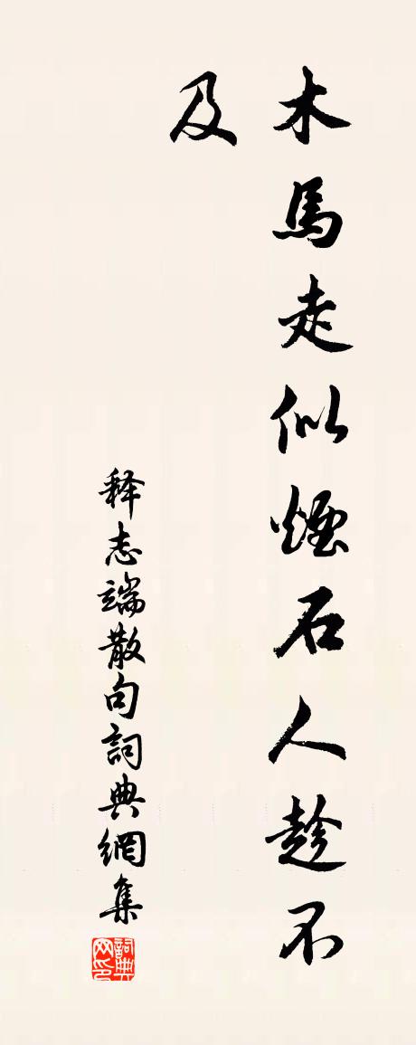 詩詞名句歷史字典書法欣賞書法字典國語詞典說文解字康熙字典古漢語字典標 題 作 者 詩 句 句作者:釋志端 朝代:宋代句原文木馬走似煙,石人趁不及。詩詞問答問:句的作者是誰?答:釋志端問:句寫於哪個朝代?答:宋代問:句是什麼體裁?答:句釋志端句書法欣賞句書法作品詩詞推薦客游旅懷姚合〔唐代〕客行無定止,終日路岐間。馬為賒來貴,僮緣借得頑。詩書愁觸雨,店舍喜逢山。舊業嵩陽下,三年未得還。天育二老禪惠示經佛偈答以十詩鄭清之〔宋代〕般柴運水老龐禪,佛法無多在密邊。餅汝將來還與汝,因師交點更團圓。秋晚泊石頭驛有寄貫休〔唐代〕蕭索漳江北,何人慰寂寥。北風人獨立,南國信空遙。燒塢新雲白,漁家眾木凋。所思不可見,行雁在青霄。酬別杜二嚴武〔唐代〕獨逢堯典日,再睹漢官時。未效風霜勁,空慚雨露私。夜鍾清萬戶,曙漏拂千旗。並向殊庭謁,俱承別館追。斗城折檻行杜甫〔唐代〕嗚呼房魏不復見,秦王學士時難羨。青衿胄子困泥塗,白馬將軍若雷電。千載少似朱雲人,至今折檻空嶙峋。婁公王儀仲名其讀書之所曰松林願印一言陳杰〔宋代〕昔人讀書松竹林,今之書林乃無竹。有松無竹何不可,松亦元同借鄰燭。十年人事桑田變,隔舍丁丁斧斤蹙。歸來登海陵齊雲樓賀鑄〔宋代〕樓外浮云何可攀,聊持樽酒共銷閒。歸心欻起登臨際,春色來從想像間。晚雪曦時見芳草,滄波盡處欠青山。長安幽尋朱繼芳〔宋代〕幽山尋不淺,歸路故遲遲。猿斷空山答,人行片月隨。葉秘書溫知蜀州江原縣楊億〔宋代〕秘省丞郎出字人,錦江偏好濯纓塵。酒壚千古風流地,花縣三年爛熳春。白羽豫州慵草檄,青天蜀道厭摧輪。巴猿謹次府判朝議江公之韻道中二首陳邦慶〔宋代〕未分中厚長夜曼,果聞胡虜膽行寒。乾坤正賴英豪整,肯賦詩人行路難。思遠客翁卷〔宋代〕涉夏思已深,感秋念愈迫。思念皆為誰,為彼遠行客。客行曷辰休,悵望朝復夕。出門虛有待,命駕焉所適。邈邈偈頌一百零九首釋可湘〔宋代〕繁憐紙撚搵無油,將底光輝古盪湫。今日元宵時節至,也還水上掛燈撲。予丁亥生壬寅年七十六留杭十二年方回〔宋代〕吾生已是三分過,此地胡為一紀留。萬事無心偶然耳,久將身世付浮休。高二承宣與蘇二左司唱和春雨詩遠蒙見寄依韻晁說之〔宋代〕太乙池中艦,洞庭湖上蓬。問誰今得樂,宇宙釣絲中。次李提舉桂花韻楊冠卿〔宋代〕人間初未識奇木,子落蟾宮秋政芳。托根底事在幽谷,要伴清都山水郎。山中寄韋鉦於鵠〔唐代〕懶成身病日,因醉臥多時。送客出谿少,讀書終卷遲。幽窗聞墜葉,晴景見遊絲。早晚來收藥,門前有紫芝。贈別石首尉胡廷直曾豐〔宋代〕士之所忌忌無末,吾已與交不輕絕。士之所貴貴有初,吾未與交不輕結。歲在戊申五月間,中都始識胡廷直。經史送雲陽鄒儒立少府侍奉還京師韋應物〔唐代〕建中即藩守,天寶為侍臣。歷觀兩都士,多閱諸侯人。鄒生乃後來,英俊亦罕倫。為文頗瑰麗,稟度自貞醇。甲科湘月/念奴嬌姜夔〔宋代〕五湖舊約,問經年底事,長負清景。暝入西山,漸喚我、一葉夷猶乘興。倦網都收,歸禽時度,月上汀州冷。中流憨郭郎王哲〔元代〕牛子卻如澆墨,牽拽不回頭。向川原,貪水草,騁風流。禁得這茫兒躁,加力用鞭勾。渾身都打遍、變霜球。名句推薦下窺指高鳥,俯聽聞驚風。岑參《與高適薛據同登慈恩寺浮圖》 舉頭望明月,低頭思故鄉。李白《靜夜思》 還卿一缽無情淚,恨不相逢未剃時。蘇曼殊《本事詩十首·選二》 相州晝錦堂廚醞,衛國淇川岸竹萌。姜特立《雅志小飲適寬仲送相州法醞並竹萌同至》 側見雙翠鳥,巢在三珠樹張九齡《感遇十二首·其四》 野鴉無意緒,鳴噪自紛紛。杜甫《孤雁 / 後飛雁》 便向夕陽影里,倚馬揮毫。納蘭性德《風流子·秋郊即事》 日日深杯酒滿,朝朝小圃花開。朱敦儒《西江月·日日深杯酒滿》 洞房昨夜停紅燭,待曉堂前拜舅姑。朱慶餘《近試上張籍水部 / 近試上張水部 / 閨意獻張水部》 塵世難逢開口笑,菊花須插滿頭歸。杜牧《九日齊山登高》