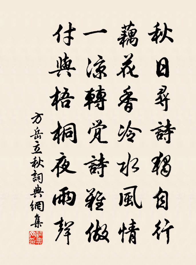 詩詞名句歷史字典書法欣賞書法字典國語詞典說文解字康熙字典古漢語字典標 題 作 者 詩 句 立秋作者:方岳 朝代:宋代立秋原文秋日尋詩獨自行,藕花香冷水風情。一涼轉覺詩難做,付與梧桐夜雨聲。詩詞問答問:立秋的作者是誰?答:方岳問:立秋寫於哪個朝代?答:宋代方岳立秋書法欣賞立秋書法作品詩詞推薦戛銅碗為龍吟歌皎然〔唐代〕逸僧戛碗為龍吟,世上未曾聞此音。一從太尉房公賞,遂使秦人傳至今。初戛徐徐聲漸顯,樂音不管何人辨。似出留山中諸君子見訪曾鞏〔宋代〕茅舍開扉勝事稠,況攜佳客此中游。妖紅落後堅松在,南澗清時野潦收。林帶寒煙如水合,山含晴日似塵浮。不嫌假中閉戶終日偶得絕句陸游〔宋代〕雨聲滴滴暮未已,苔暈重重寒更添。知是使君初睡起,清香一線透疏簾。探春令(劉伯玉生辰)楊無咎〔宋代〕東風初到,小梅枝上,又驚春近。料天台不比,人間日月,桃萼紅英暈。劉郎浪跡憑誰問。莫因詩瘦損。怕桑田變生日子聿作五字詩十首為壽追懷先親泣然有作陸游〔宋代〕我生尚及宣和末,頒歷頻驚歲月移。負米養親無復日,蓼莪廢講豈勝悲!渡江百口今誰在?抱恨終身秪自知。文字夢中得蕎粥覺而記其景聯洪咨夔〔宋代〕墨雲吹雨落霜空,滿地珊瑚樹樹紅。老磨踏煙霏淅蔌,鈍鐺奏火沸蒙茸。寒江浪起雪飛外,古嶂風鳴雲攪中。識破古風二首上湯丞相范成大〔宋代〕空山學仙子,窮年臥岩扃。煮石不得飽,秋鬢蒼已星。道逢紫霄翁,示我餐霞經。采采晨之華,滌濯腐與腥。向來攜家石湖賞拒霜范成大〔宋代〕水上晴雲彩蝀橫,許多蜂蝶趁船行。漁樵引入新花塢,兒女扶登小錦城。艷粉發妝朝日麗,濕紅浮影晚波清。誰知答韓三子華韓五持國韓六玉汝見贈述詩梅堯臣〔宋代〕聖人於詩言,曾否專其中。因事有所激,因物興以通。自下而磨上,是之謂國風。雅章及頌篇,刺美亦道同。不獨登寶曆寺閣陳陶〔唐代〕金碧高層世界空,憑蜺長嘯八蠻風。橫軒水壯蛟龍府,倚棟星開牛斗宮。三楚故墟殘景北,六朝荒苑斷山東。不堪送劉治中之信州謝枋得〔宋代〕冰玉古溪山,治中今士元。邦人敬文簡,道化望曾孫。朱子書堂在,東萊講席存。十年儒道晦,此日啼登門。頌古一○一首釋子淳〔宋代〕妙圓無相劫前人,隨類權分百億身。月夜御樓才報曉,平明六國盡逢春。滿庭芳侯善淵〔元代〕祖道無修,真常妙用,悟來表里相通。靈光現處,照見杳冥中。晃耀清虛浩大,無遮障、拍塞沖融。希夷甫,從來滕王閣陳杰〔宋代〕稍覺闌乾遠水漪,枉持錢貫去安之。湖山千戶庭內,簾棟幾番鸞玉時。記好儘堪邕輟翰,序工且放顥題詩。西風何和陶淵明飲酒詩滕岑〔宋代〕止酒盟諸神,覆杯未幾時。有客苦相勸,持杯前致辭。人生足煩惱,至樂實在茲。欲飲恐渝盟,不飲客見疑。我性素梅 十七王冕〔元代〕天寒江國霜如雪,草木無情盡摧折。不知春意到江南,疏影橫斜半窗月。峽口二首杜甫〔唐代〕峽口大江間,西南控百蠻。城欹連粉堞,岸斷更青山。開闢多天險,防隅一水關。亂離聞鼓角,秋氣動衰顏。時清丹丘道中釋寶曇〔宋代〕綠繞溝塍水正肥,誰家深樹有黃鸝。只知夜雨扶犁日,豈識春風便面時。白髮歸來須早計,黃金散盡未全痴。孤雲【南呂】一枝花_惜春奪殘造馬致遠〔元代〕惜春奪殘造化功,占斷繁華富,芳名喧上苑,和氣滿皇都。論春秀誰如,一任教浪蕊閒花塢。正是斷人腸三月初,明道親享先農十首佚名〔宋代〕豆籩雖薦,黍稷非聲。惠我豈幾,歆茲至誠。名句推薦只有精忠能報國,更無樂土可為家。 * 《元旦口占用柳亞子懷人韻》 大風起兮雲飛揚。威加海內兮歸故鄉。安得猛士兮守四方!劉邦《大風歌》 明朝萬一西風動,爭向朱顏不耐秋。晏幾道《鷓鴣天·守得蓮開結伴遊》 落木千山天遠大,澄江一道月分明。黃庭堅《登快閣》 晚日金陵岸草平,落霞明,水無情歐陽炯《江城子·晚日金陵岸草平》 殊方日落玄猿哭,舊國霜前白雁來。杜甫《九日五首·其一》 法莫如顯,而術不欲見韓非及後人《韓非子·難三》 流年莫虛擲,華發不相容。方乾《送從兄郜 / 韋郜 / 途中別孫璐》 一葉葉,一聲聲,空階滴到明。溫庭筠《更漏子·玉爐香》 北方有佳人,絕世而獨立。李延年《李延年歌》