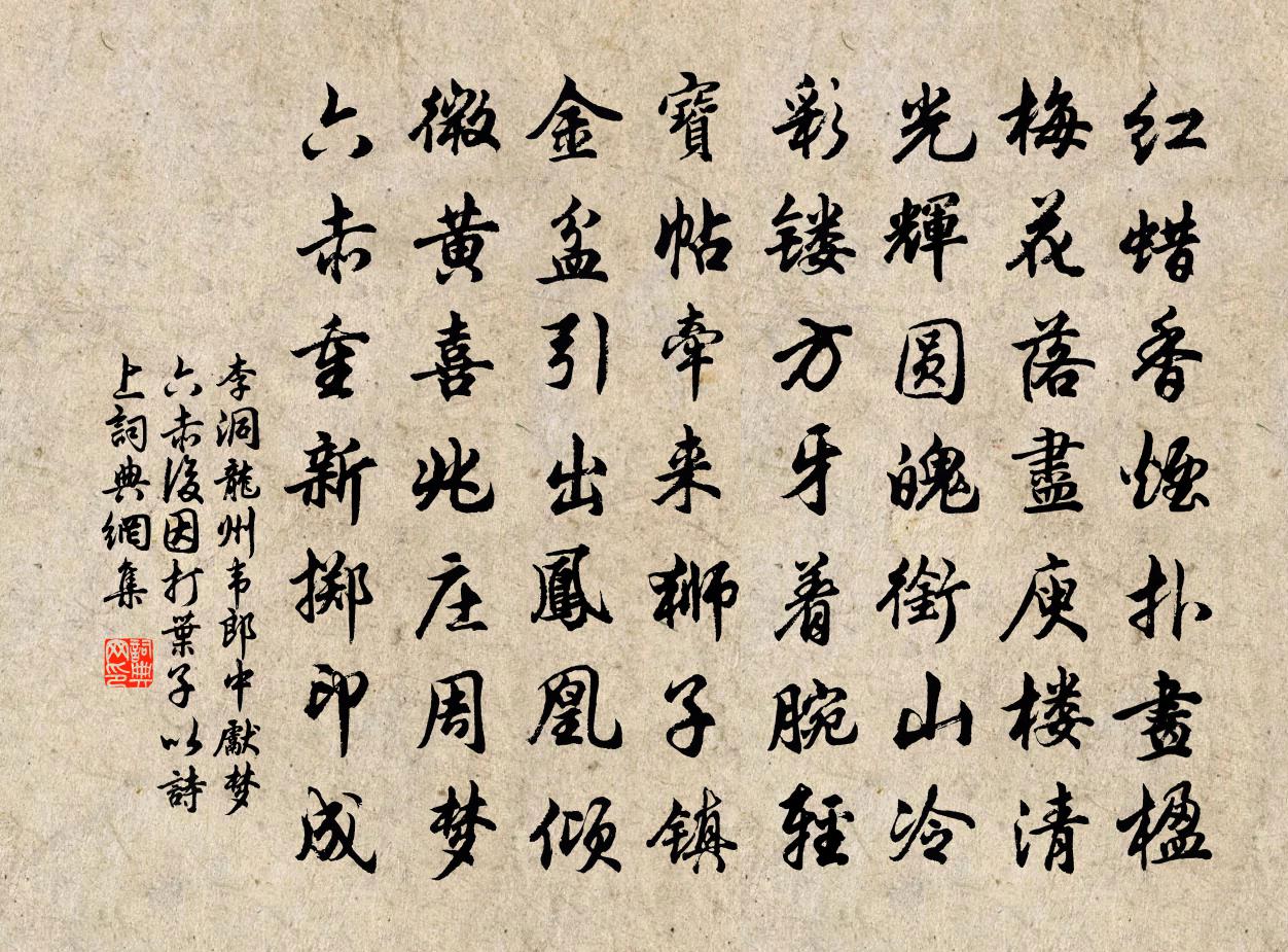 - 歸時休放燭光紅,待踏馬蹄清夜月。李煜《木蘭花·曉妝初了明肌雪》